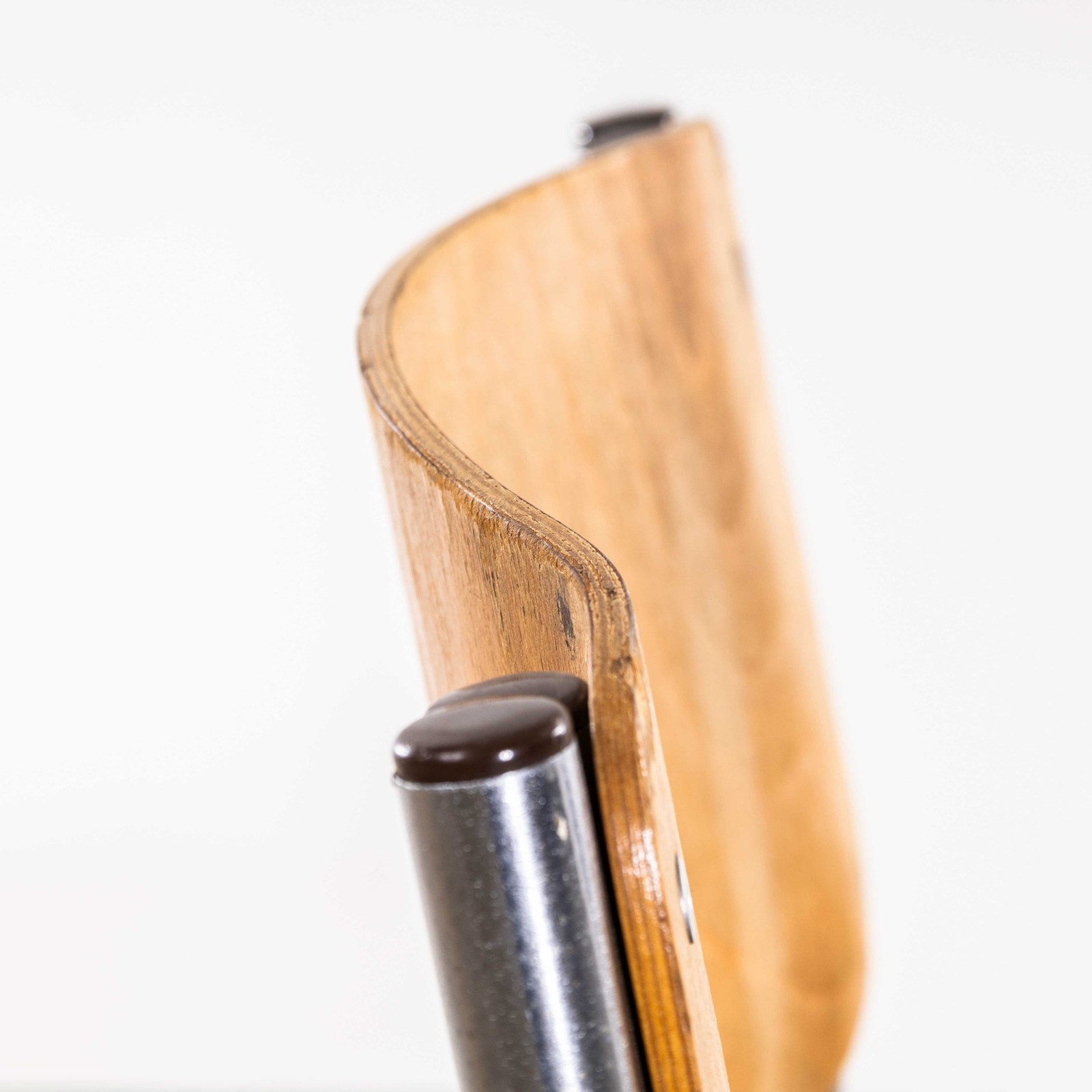 Good quality industrially produced dining chairs with good quality tubular chrome frames and formed and laminated solid beech and birch seats. The chairs were made in Eastern Europe sadly we don’t know the maker, they are a good weight robust chair with a good wear and age. Our workshop services each chair, checking construction, cleaning and waxing them.
