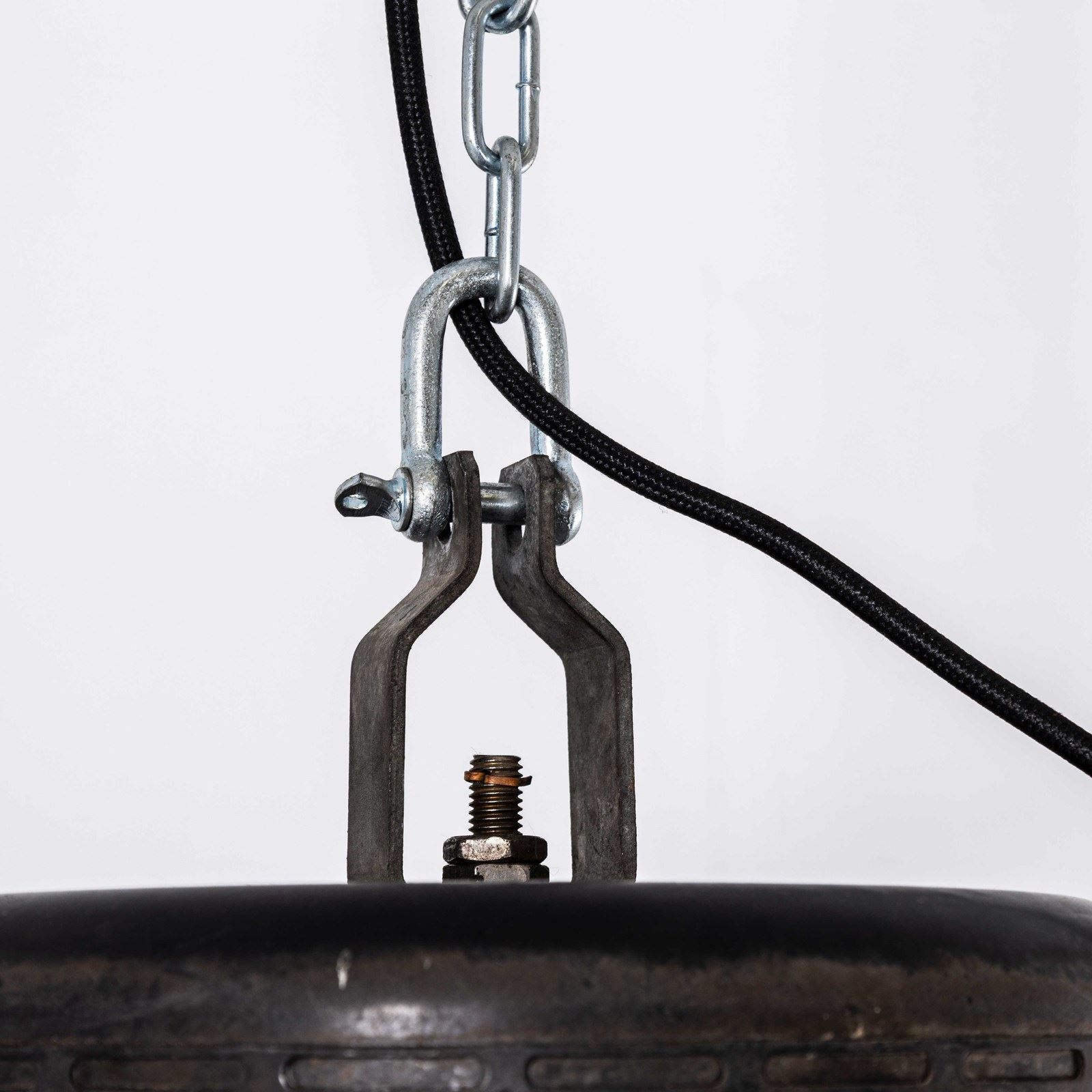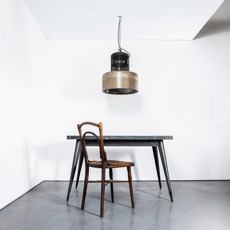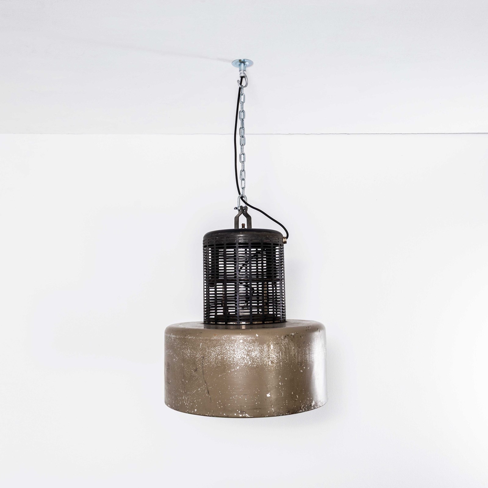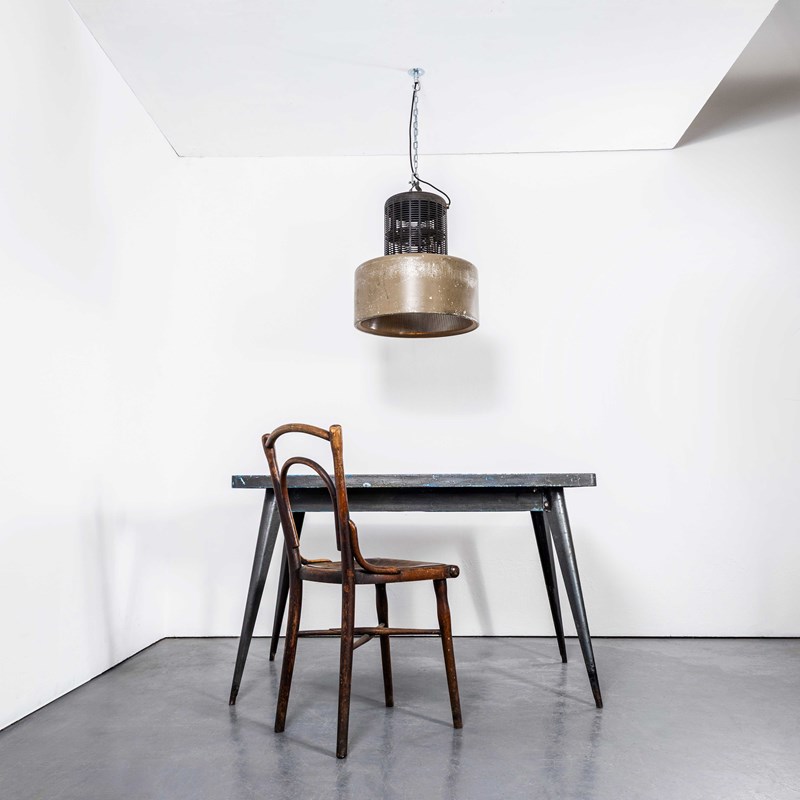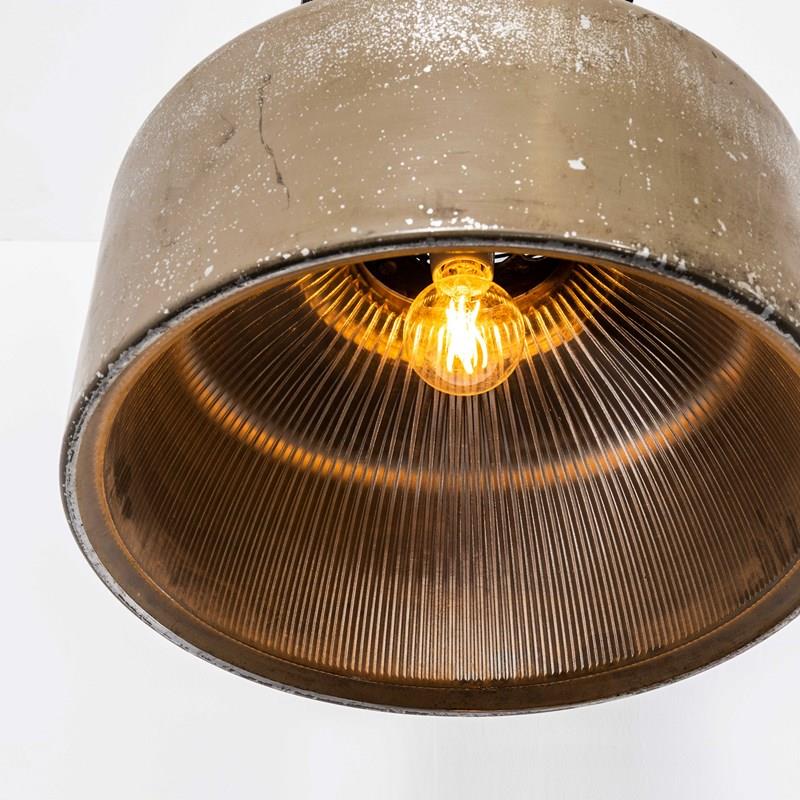 Holophane was founded in France in the late 19th Century and they are famous for their inventing and perfecting borosilicate glass reflectors often with intricate cast glass patterns which give a diffused and beautiful light. These lamps are very large scale factory light produced by Holophane and increasingly hard to find. The lamp body is pressed and spun sheet steel and aluminium, the light source is a huge heavy Holophane glass reflector. Each lamp has been cleaned and restored and all electrical components have been removed and replaced with modern European CE standard components to BS EN 60598. Each lamp is individually tested and labelled to BS EN 60598. INCLUDED: Each lamp comes completely wired and ready to install including; 2 metres of wire for hanging the lamps, 2 metres of black fabric covered electrical cable and a ceiling anchor point as shown. We can supply more than 2 metres of hanging cable/wire/chain etc. as required, please contact us separately to discuss. Each lamp is fitted with a standard E27 threaded lamp holder for which a wide range of modern and vintage style filament bulbs are widely available. We do not currently sell bulbs and recommend LED bulbs 6W maximum. We are specialists in refurbishment of vintage lighting, please contact us with any questions regarding purchase or installation. Please note this is a heavy lamp approximately 25kg and secure hanging points must be used. The lamp is currently wired and fitted for UK and EU compliance. The lamp can be wired for compliance in the US or any global market.