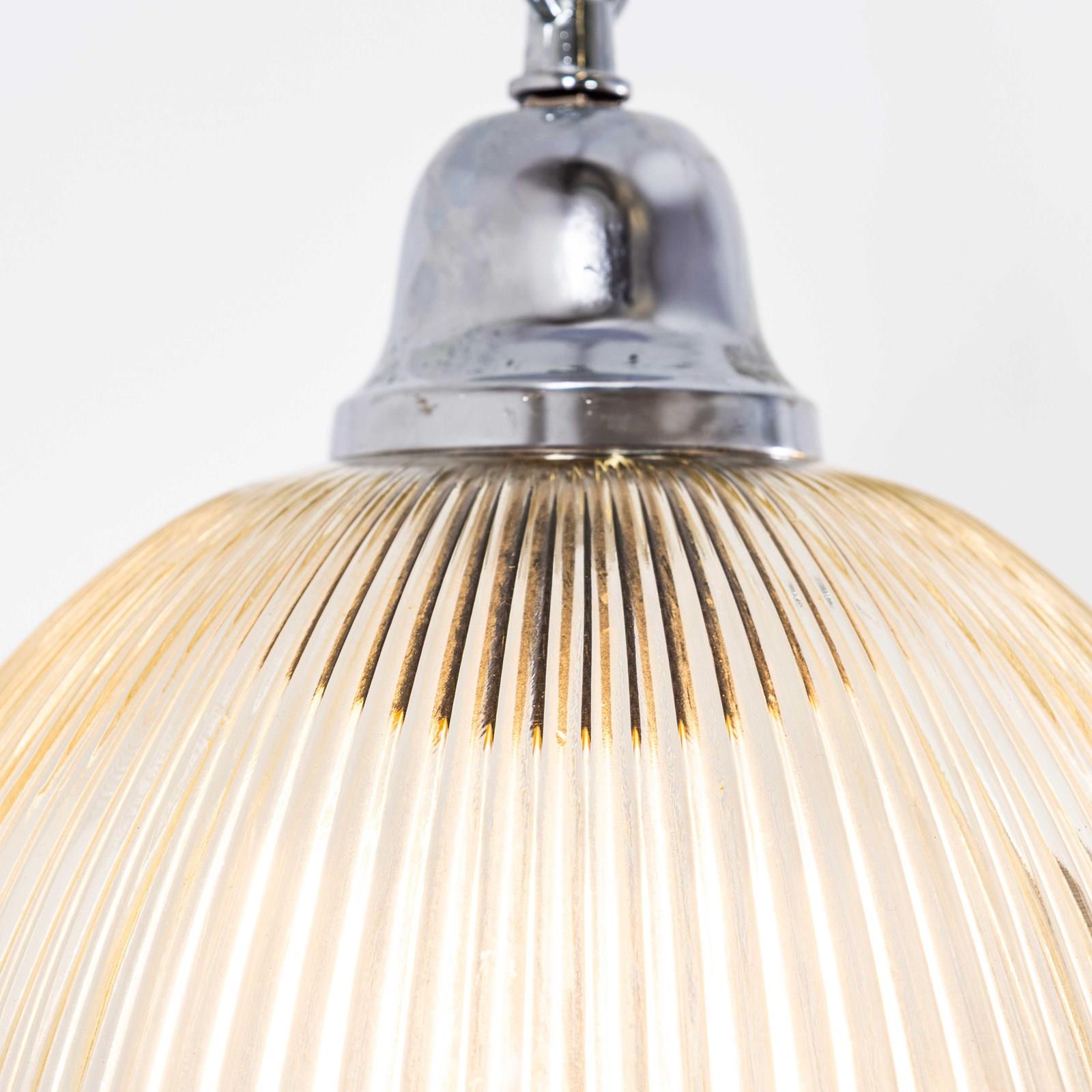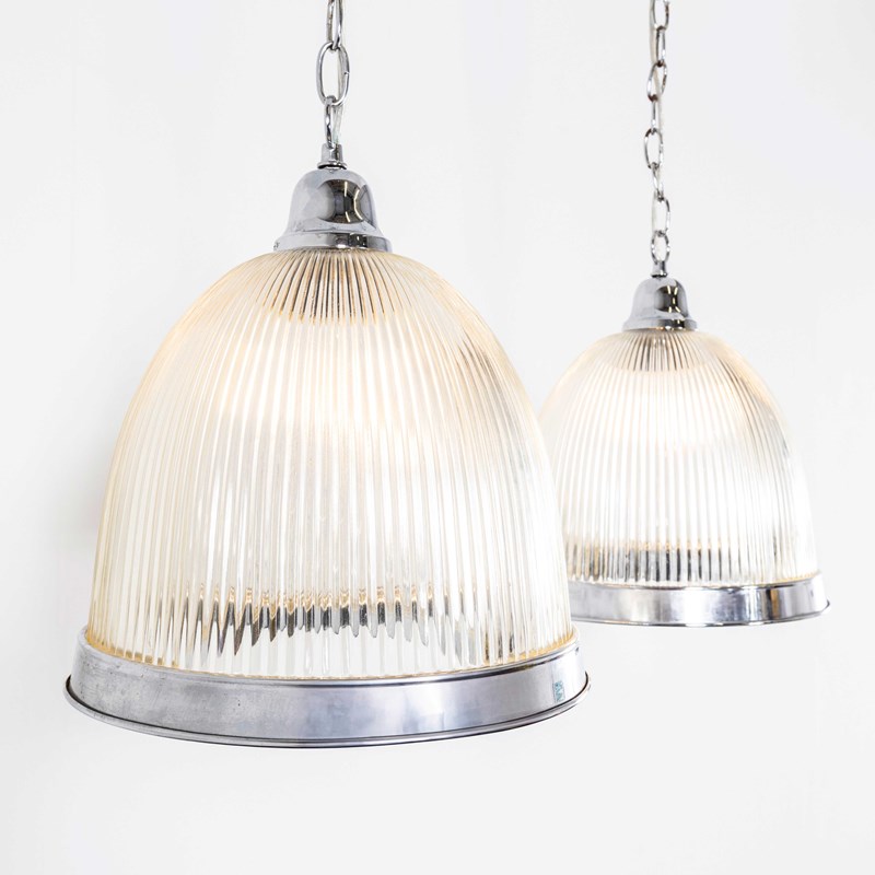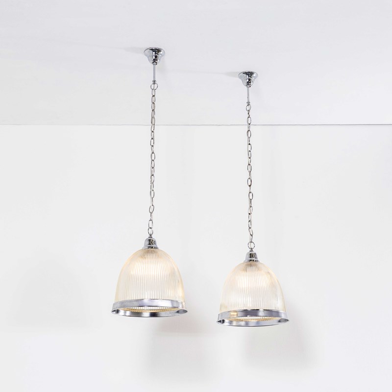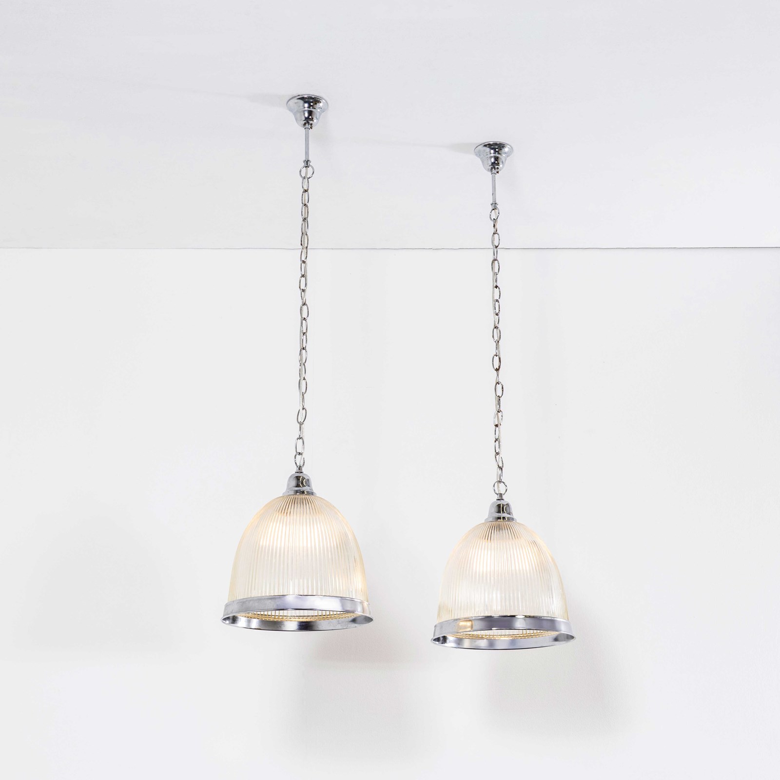 In the style of Holophane but not made by Holophane, however the prismatic glass is crisp and well produced. The listing is for the pair of lamps. Each lamp has been cleaned and restored. Each lamp is individually tested and labelled to BS EN 60598. Each lamp comes completely wired and ready to install as shown, the chain can easily be shortened as required. Each lamp is fitted with a standard E27 threaded lamp holder for which a wide range of modern and vintage style filament bulbs are widely available. We do not currently sell bulbs and recommend LED bulbs 6W maximum.