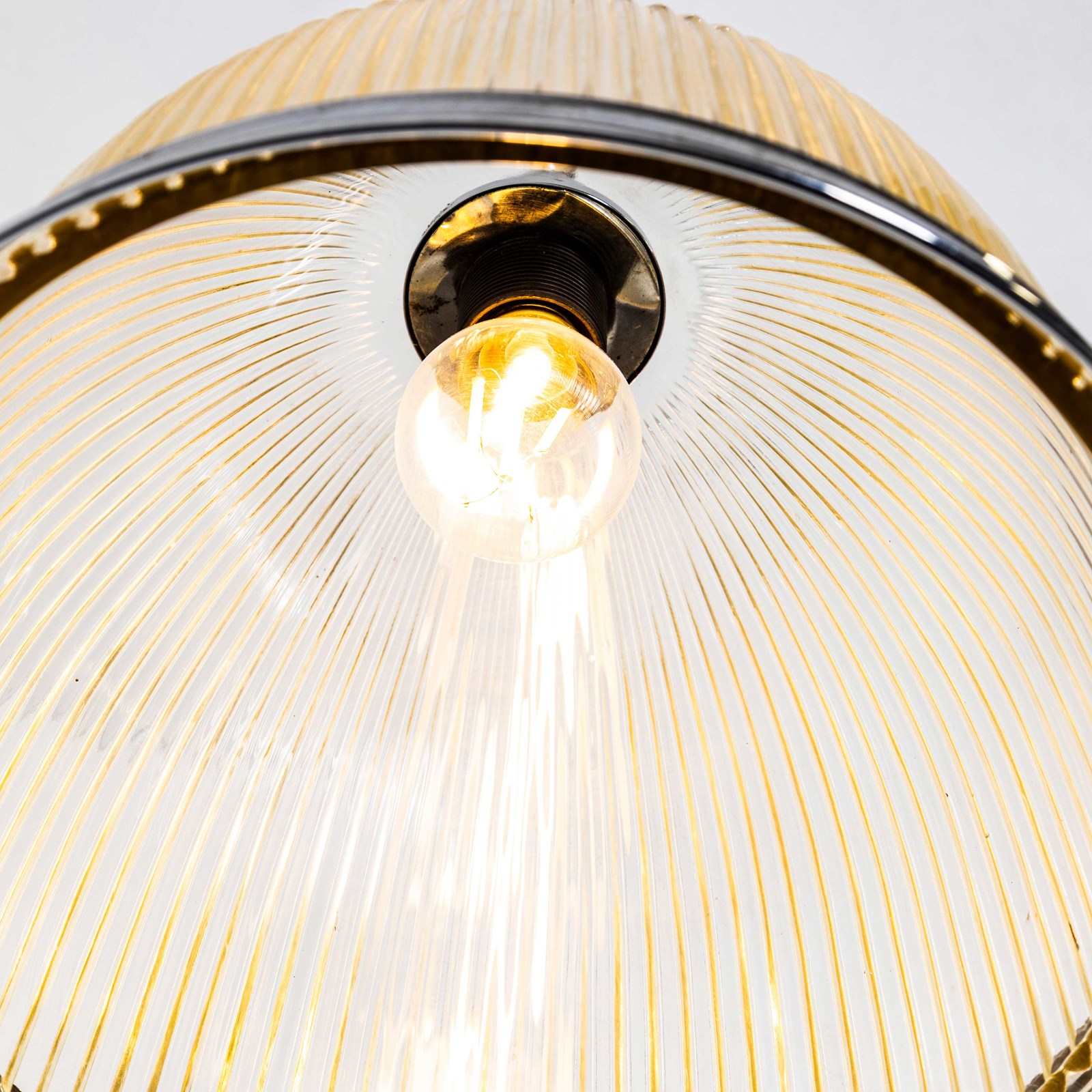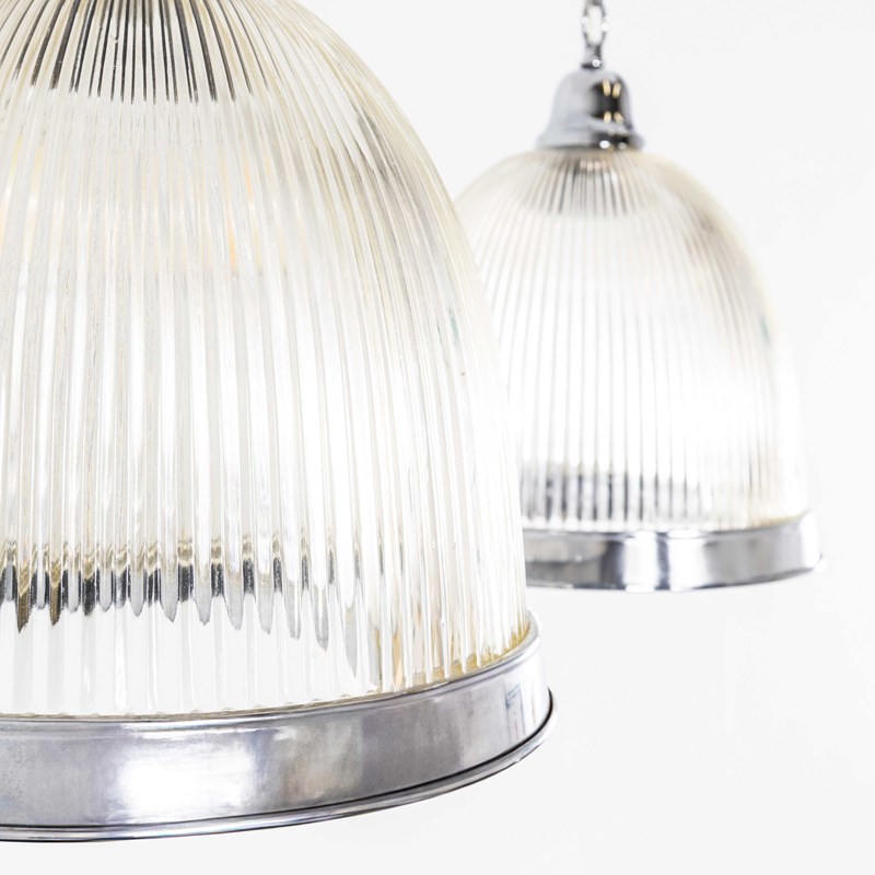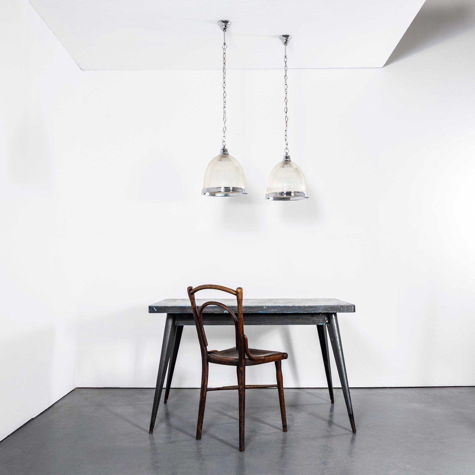 In the style of Holophane but not made by Holophane, however the prismatic glass is crisp and well produced. The listing is for the pair of lamps. Each lamp has been cleaned and restored. Each lamp is individually tested and labelled to BS EN 60598. Each lamp comes completely wired and ready to install as shown, the chain can easily be shortened as required. Each lamp is fitted with a standard E27 threaded lamp holder for which a wide range of modern and vintage style filament bulbs are widely available. We do not currently sell bulbs and recommend LED bulbs 6W maximum.