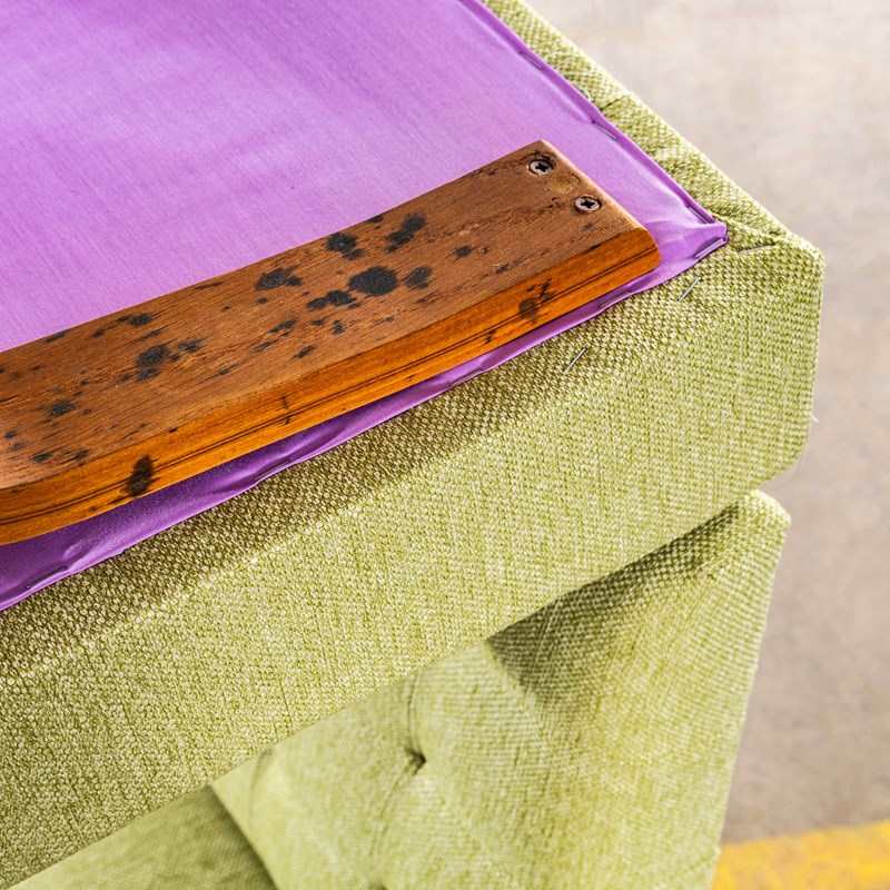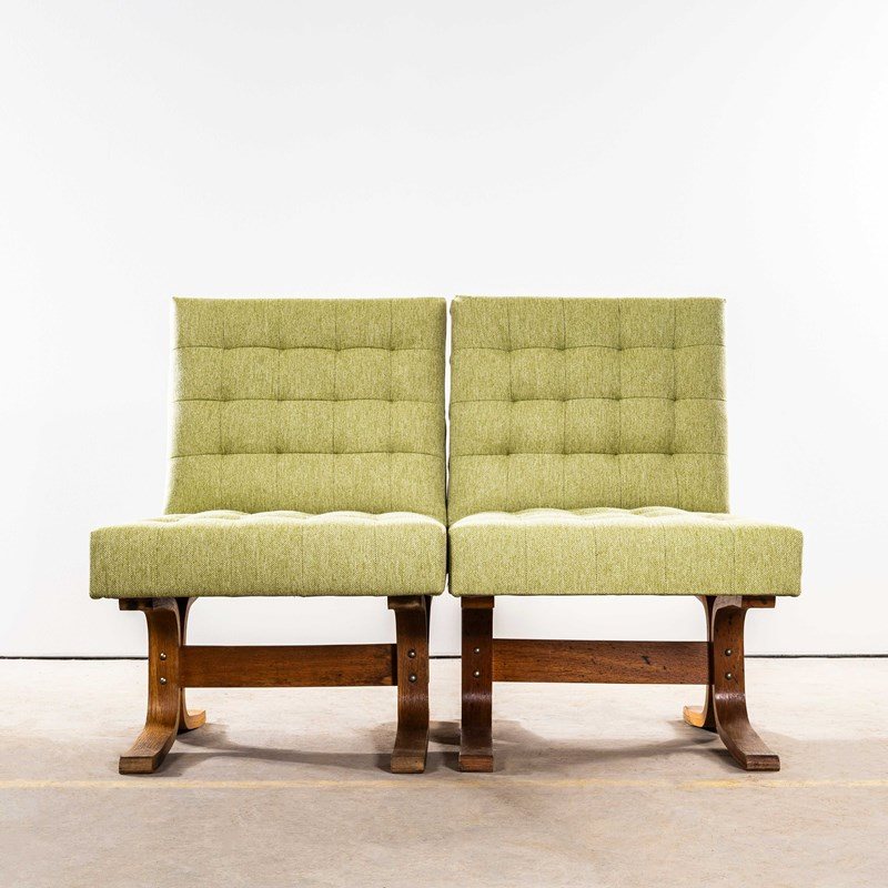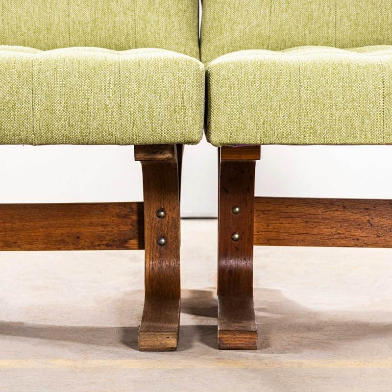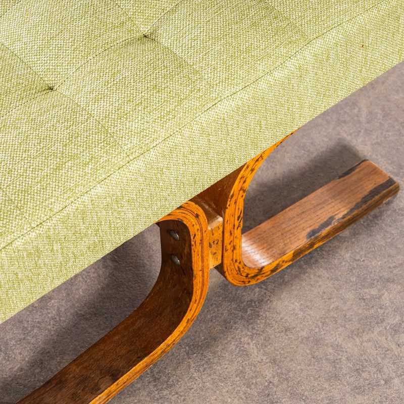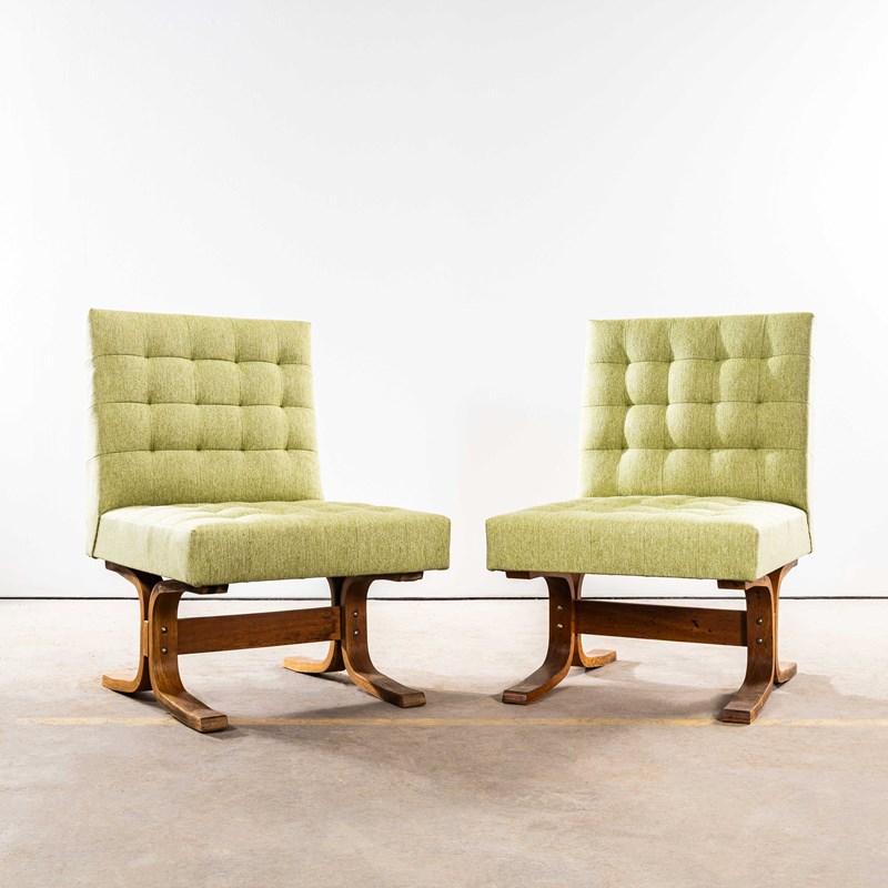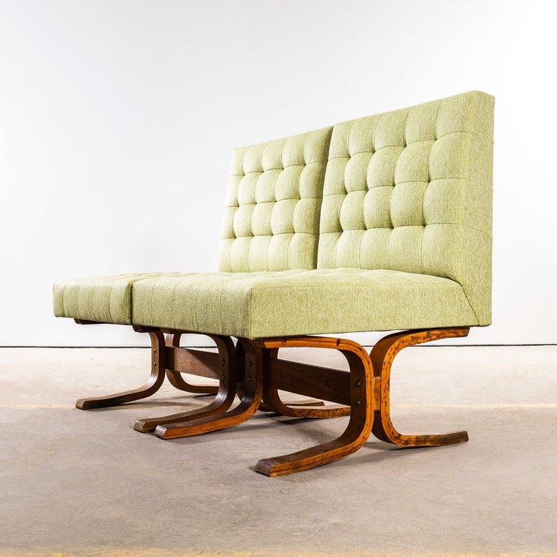 Sourced direct in the Czech republic, Volak is one of the most celebrated mid century designers best known for the organic room divider made by Drevopodnik Holesov. Volak was commissioned to make the Bratislava chair for the international airport of Slovakia. These mid century chairs are made with laminated beech frames and buttoned upholstery, our upholster has stripped the internal components and rebuilt and reupholstered them by hand. The chairs have been reupholstered in Sea Green Oxford Cotton Linen. Please note the chairs are not compliant with UK fire regulations and can only be sold outside the UK. Seat Height: 38cm