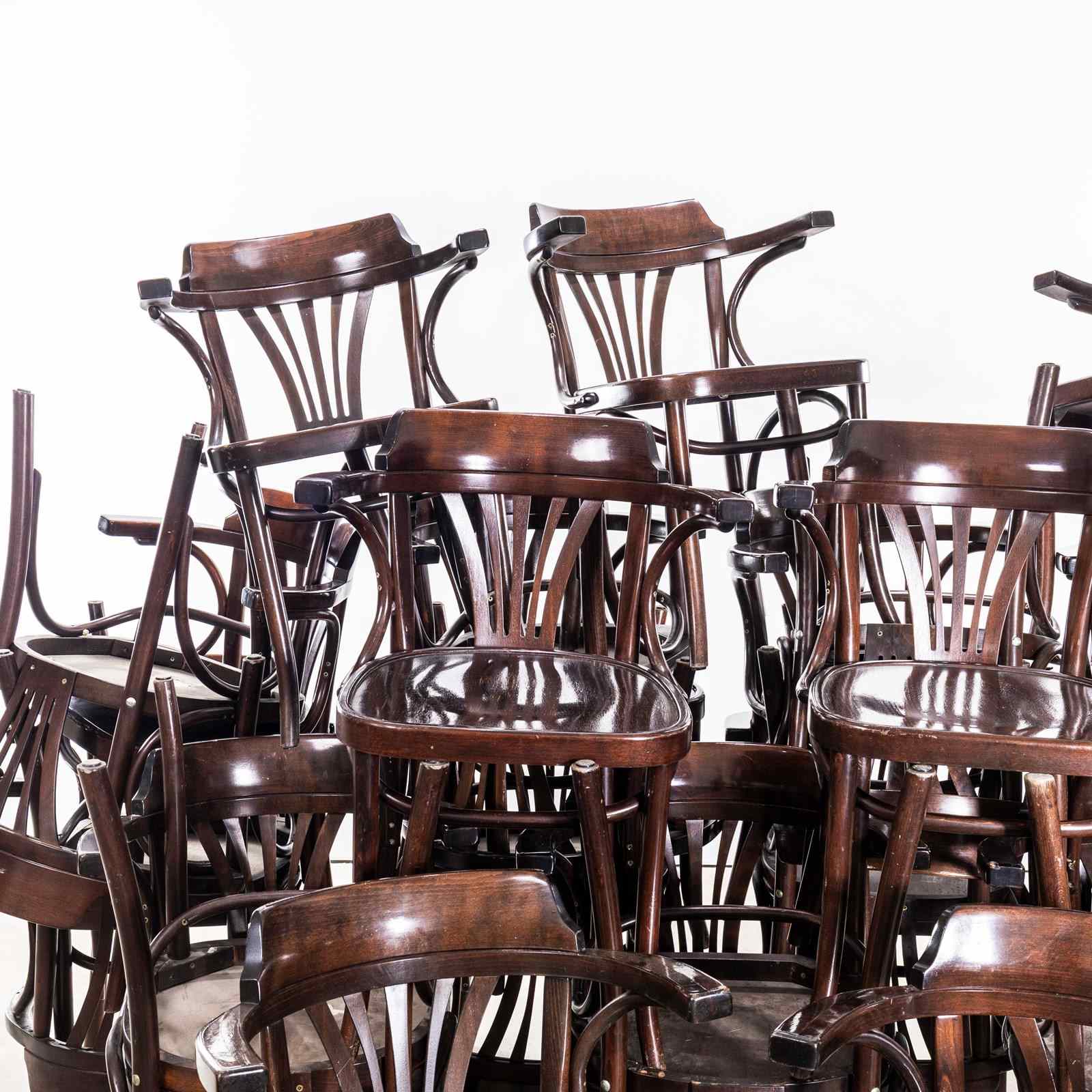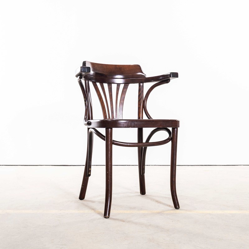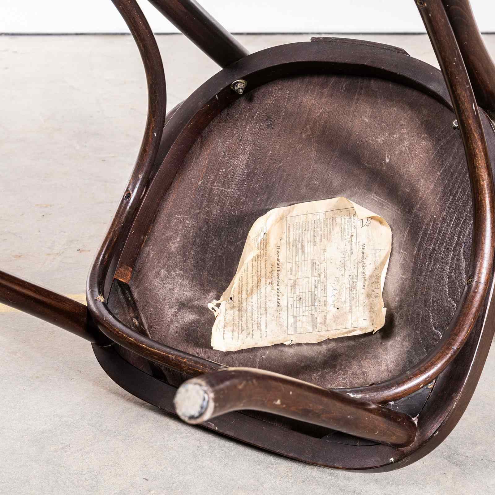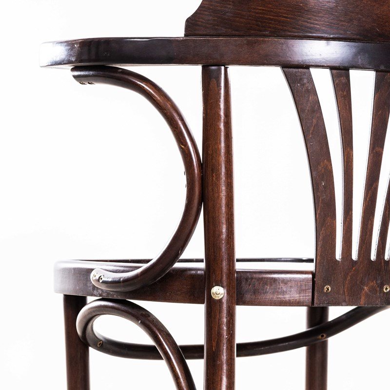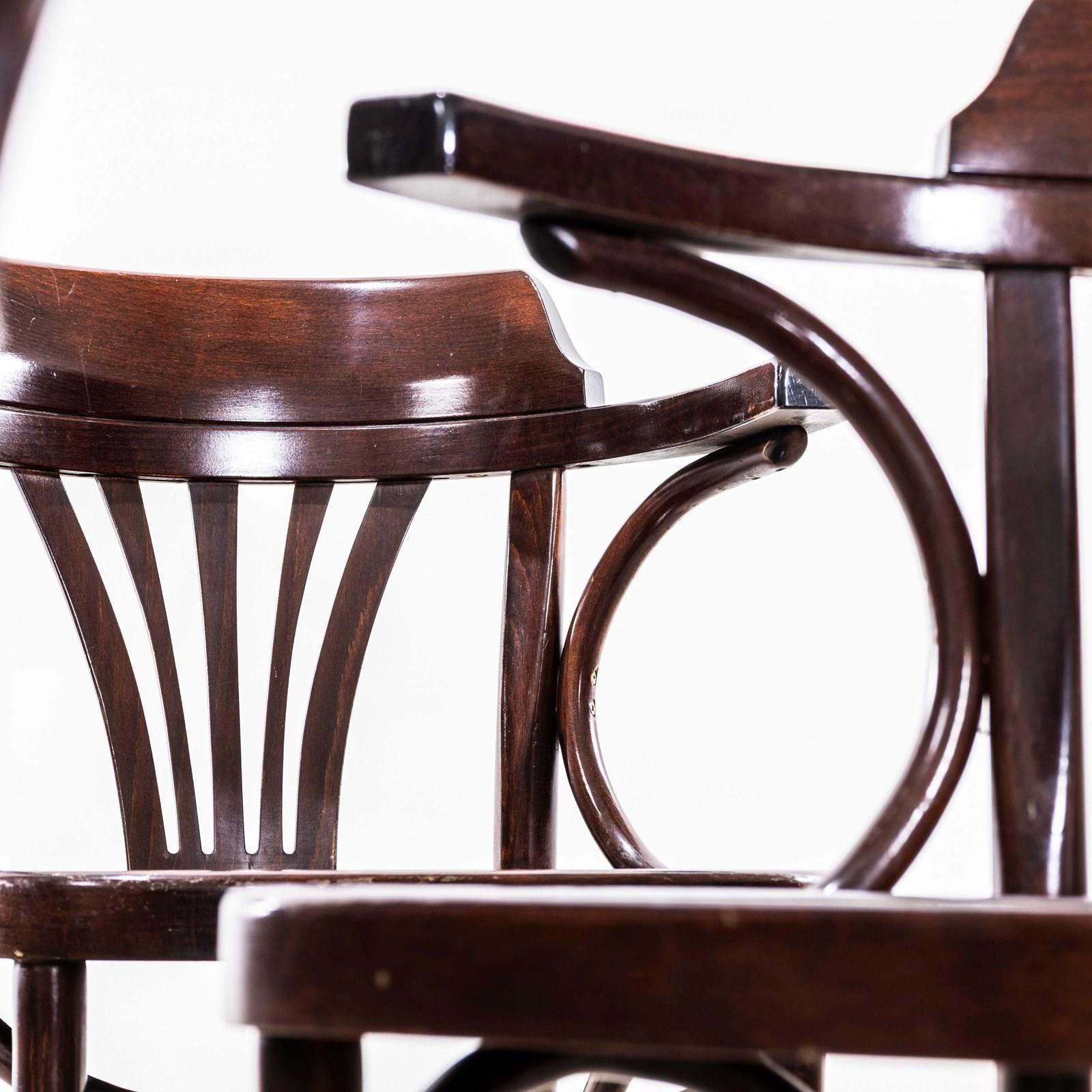 Good quality classic bentwood armchairs with a typical fan back arm shape in a clean contemporary dark walnut colour. The chairs were made in Hungary by a company called Sellaton which was founded in 1907 and is still trading today. They use solid beech and steam bend to get that iconic bentwood look. They are a heavy weight robust chair with a good wear and age. Our workshop has serviced each chair, and are good to go.