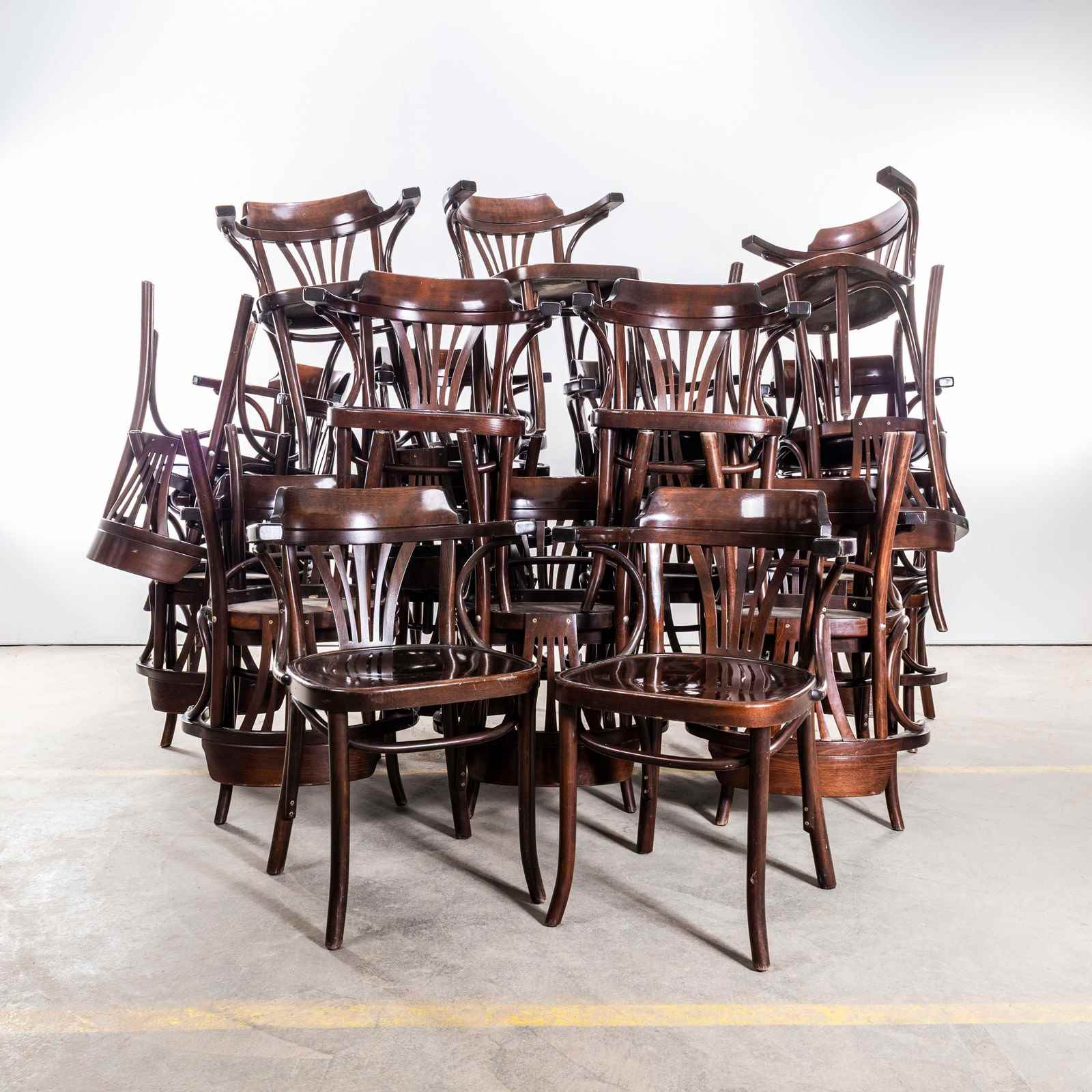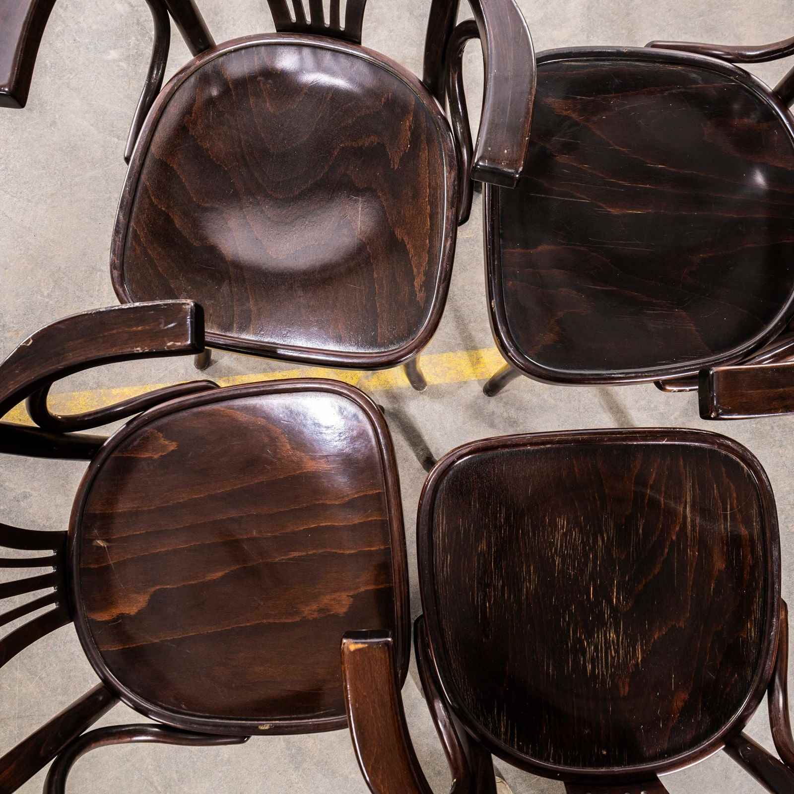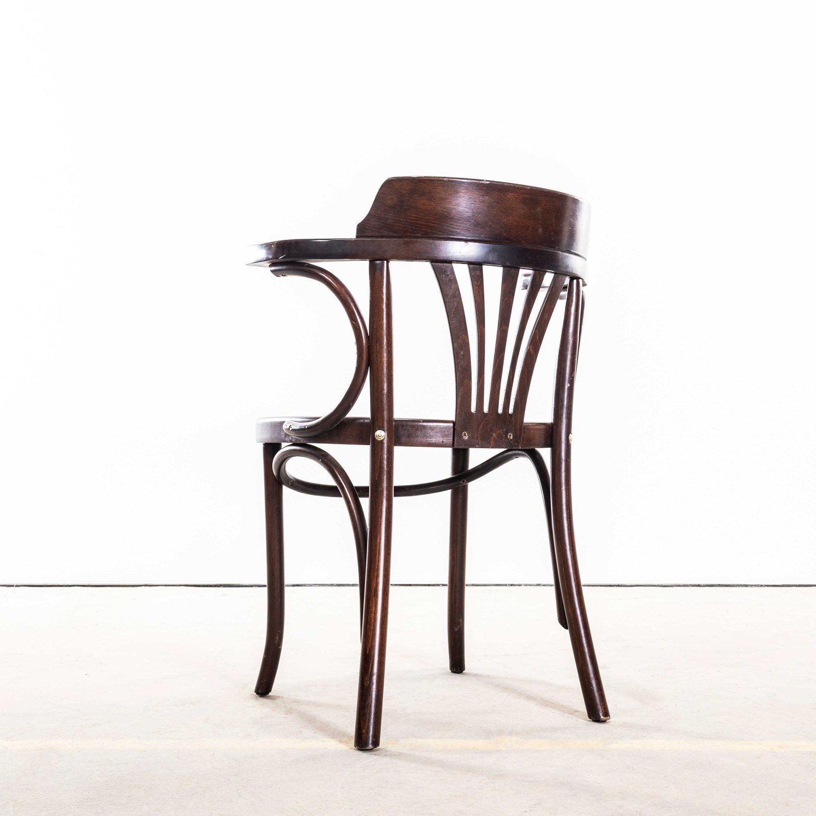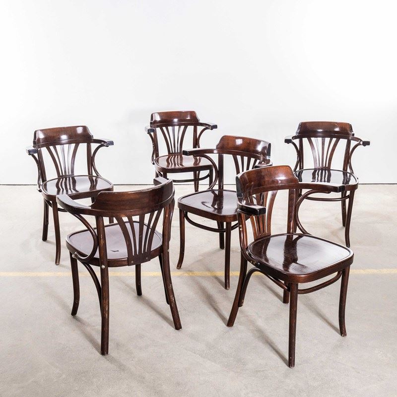 Good quality classic bentwood armchairs with a typical fan back arm shape in a clean contemporary dark walnut colour. The chairs were made in Hungary by a company called Sellaton which was founded in 1907 and is still trading today. They use solid beech and steam bend to get that iconic bentwood look. They are a heavy weight robust chair with a good wear and age. Our workshop has serviced each chair, and are good to go.