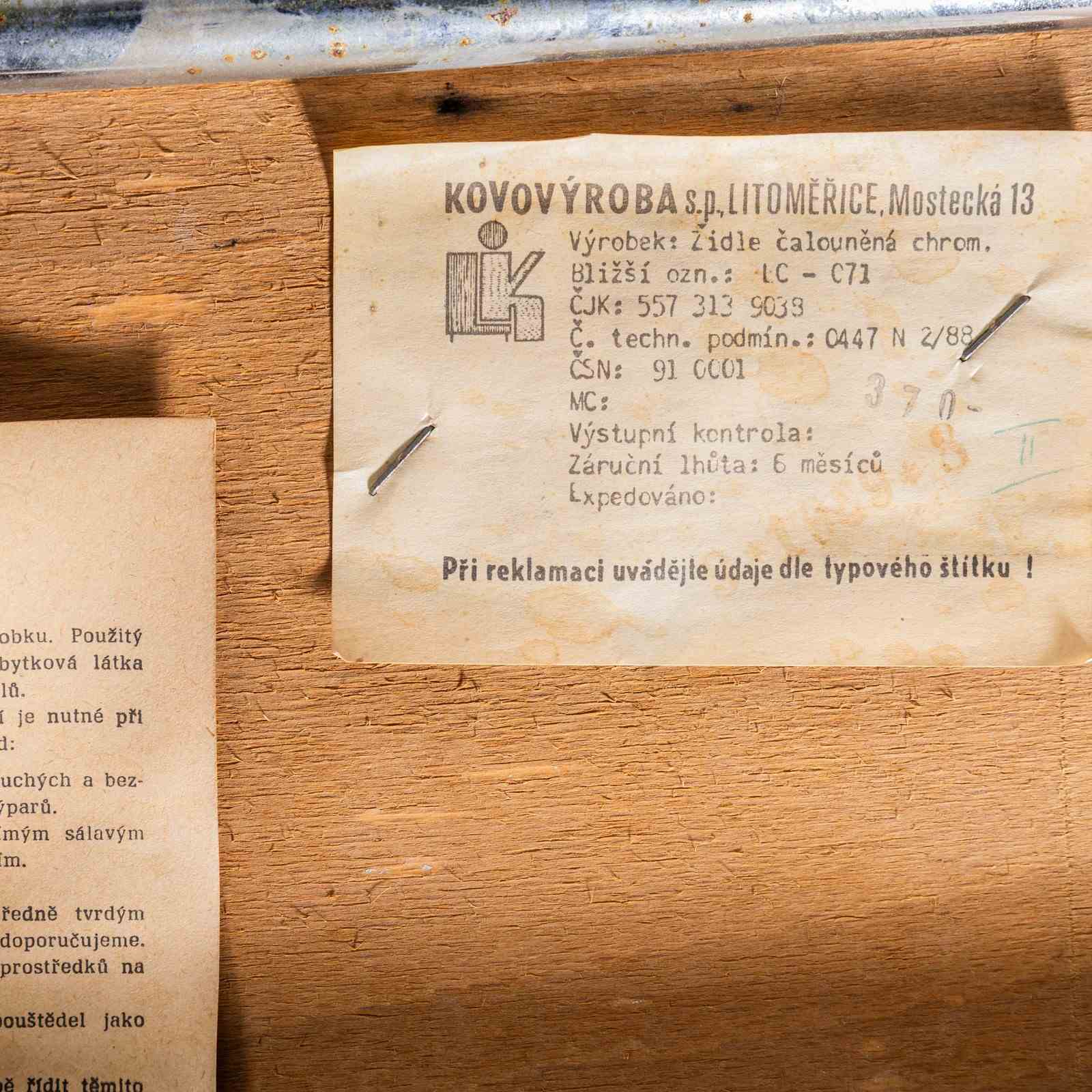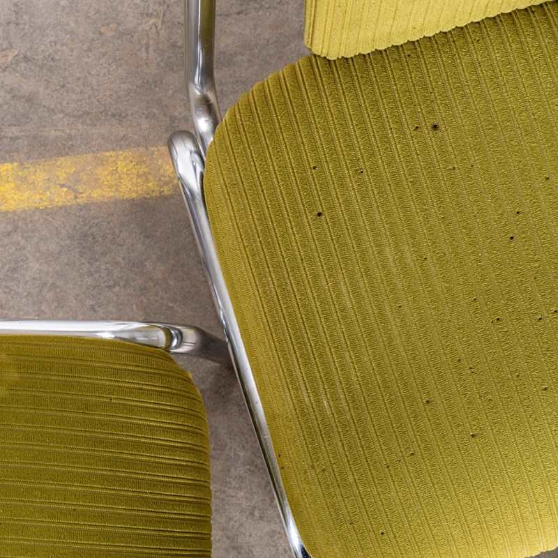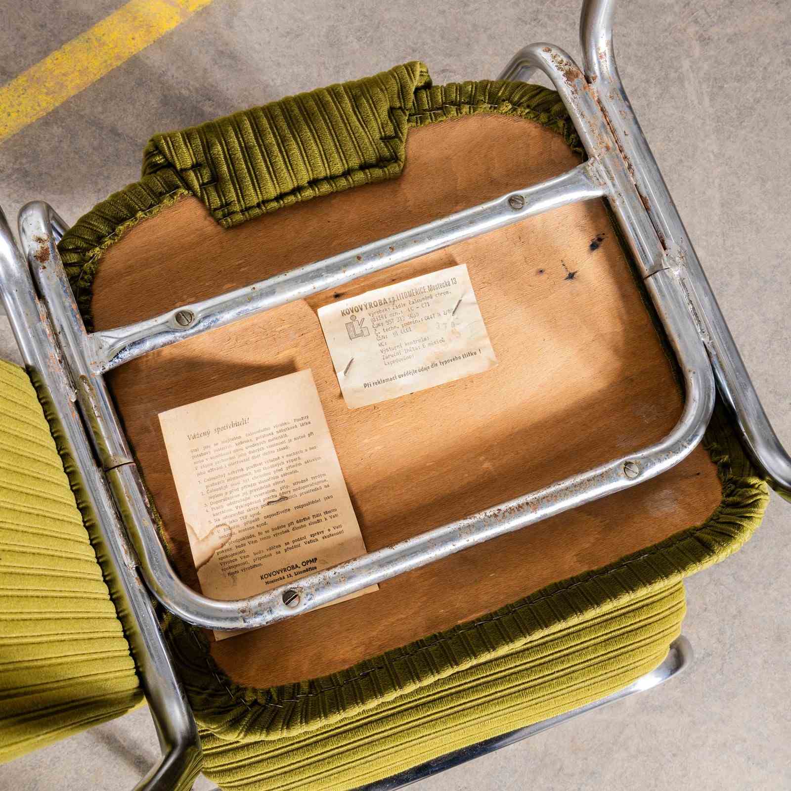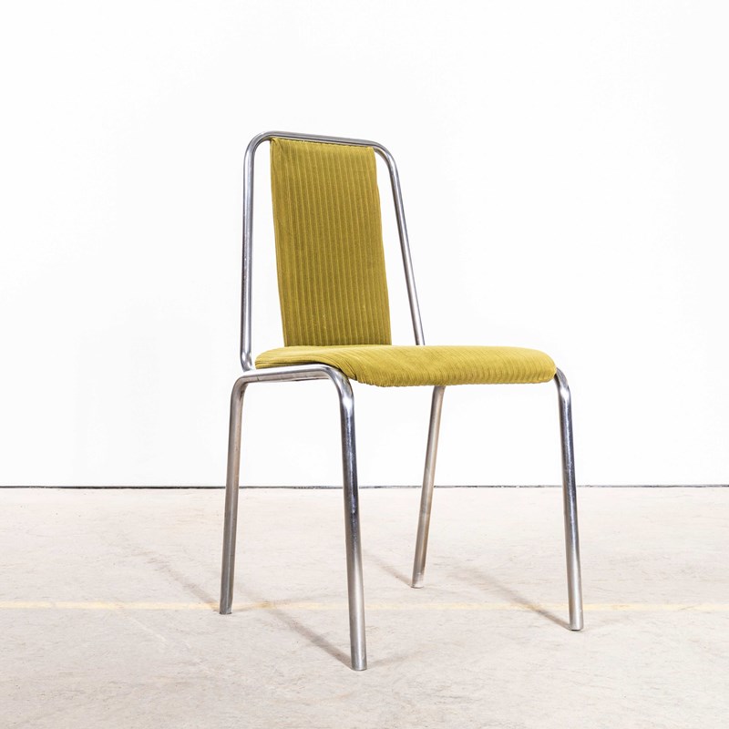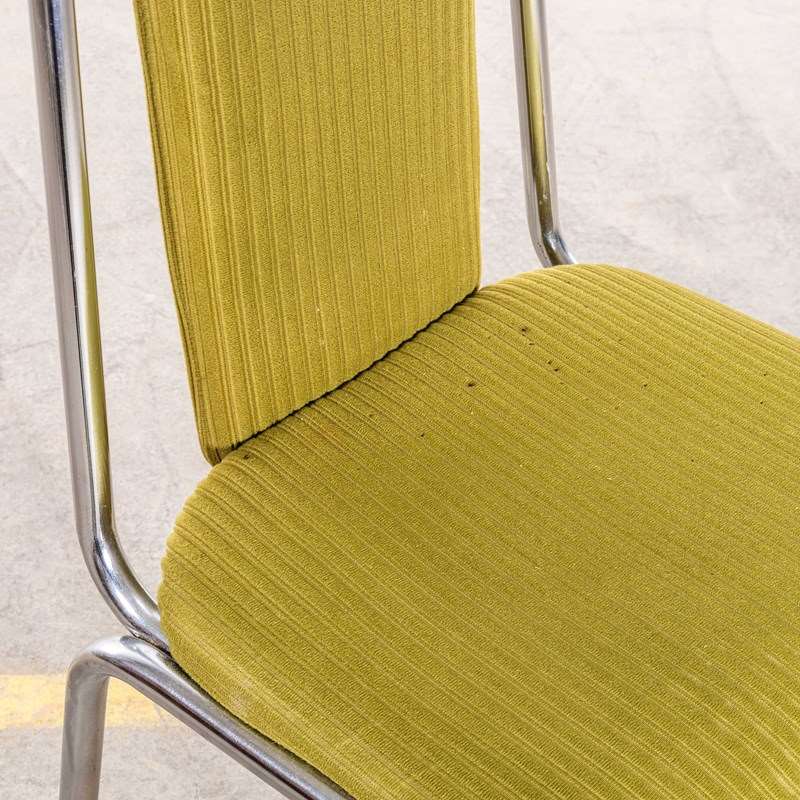 Produced in the late eighties by Kovovyroba in Litomerice Czech republic, but very much a style of the mid seventies. Good quality steel frames, chromed but showing some deterioration in surface finish. The upholstery is original green corduroy with an irregular stripe. Due to UK fire regulations, not available for sale in the UK unless reupholstered, which can be done in our workshop.