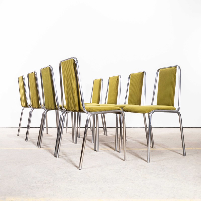 1980’s Olive Green Upholstered Chrome Framed Stacking Dining Chairs – Set Of Eight.