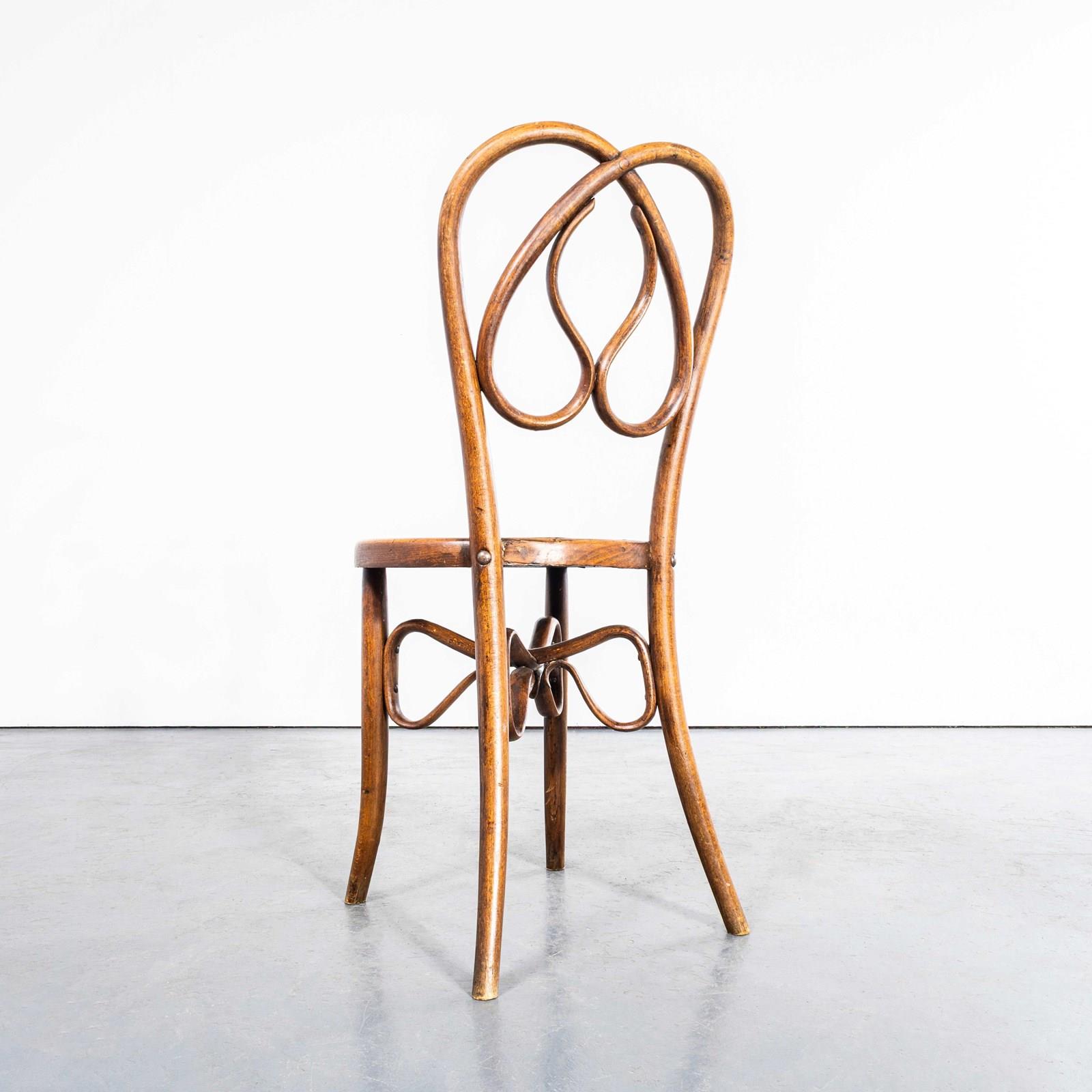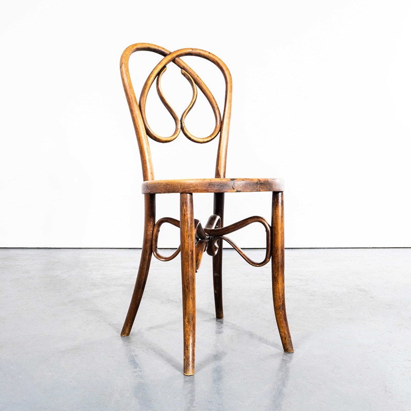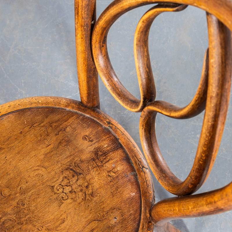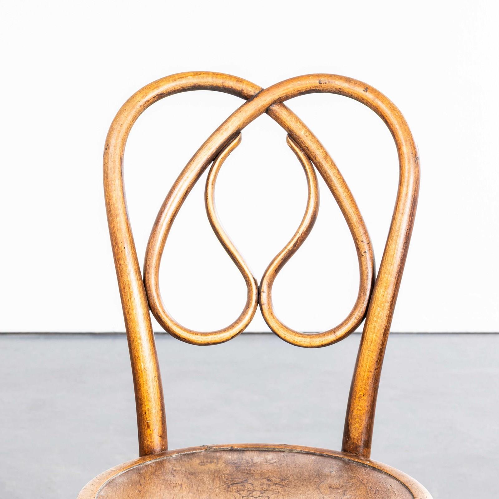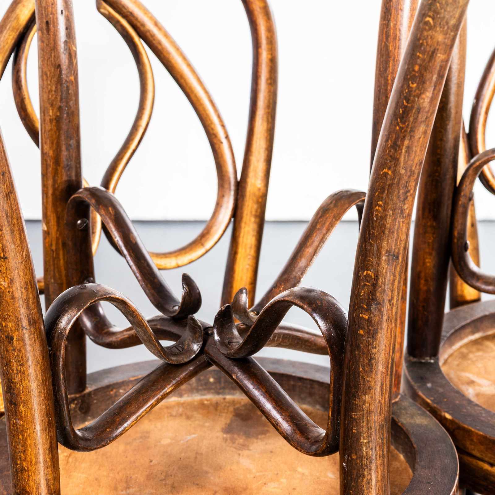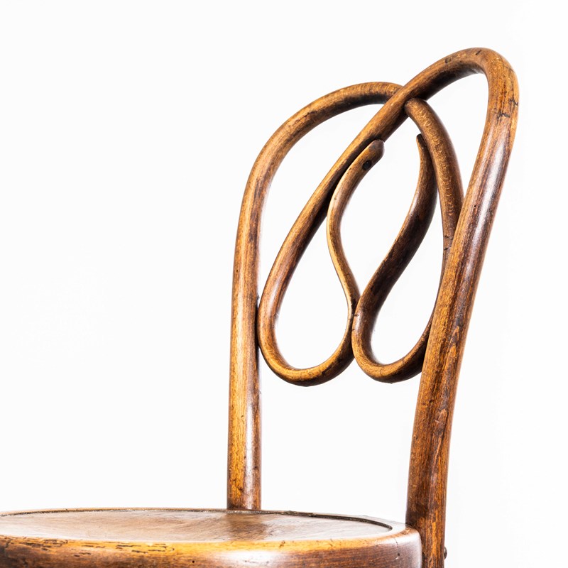 Founded in the early 19th Century by Michael Thonet, Thonet invented the process of steam bending wood under pressure and used this to design the classic bentwood chairs still in production today. In the 19th Century he had a large network of shops throughout Europe and was a huge furniture retailer. This is a stunning set of late 19th century original Thonet chairs in a stunning design and shape with the most extraordinary steam bent supports and backs. The chairs have been gently refurbished in our own workshops and are in excellent condition. The chairs have some minor markings but no clear Thonet label so they may be Mundus or an early similar maker. Seat Height: 46cm