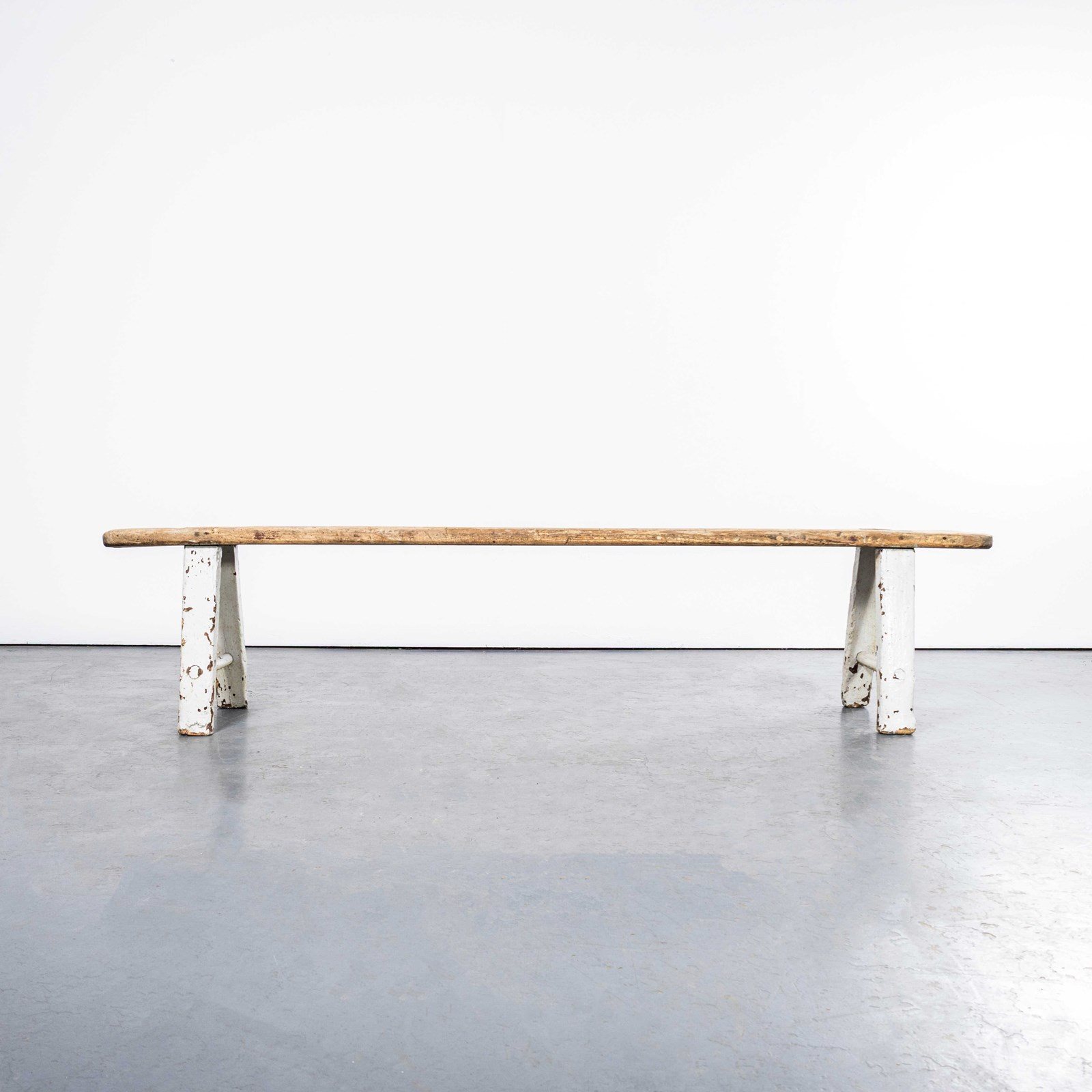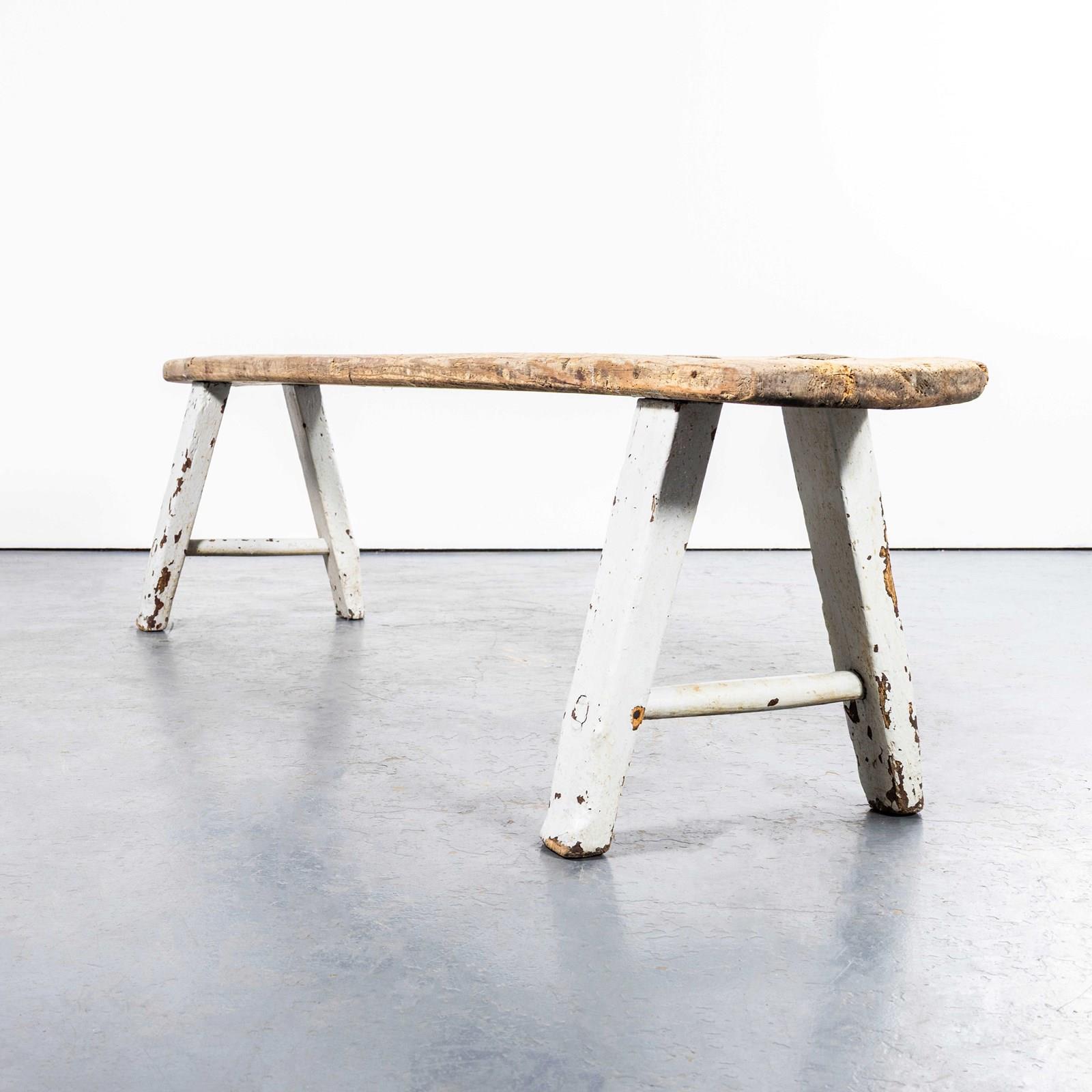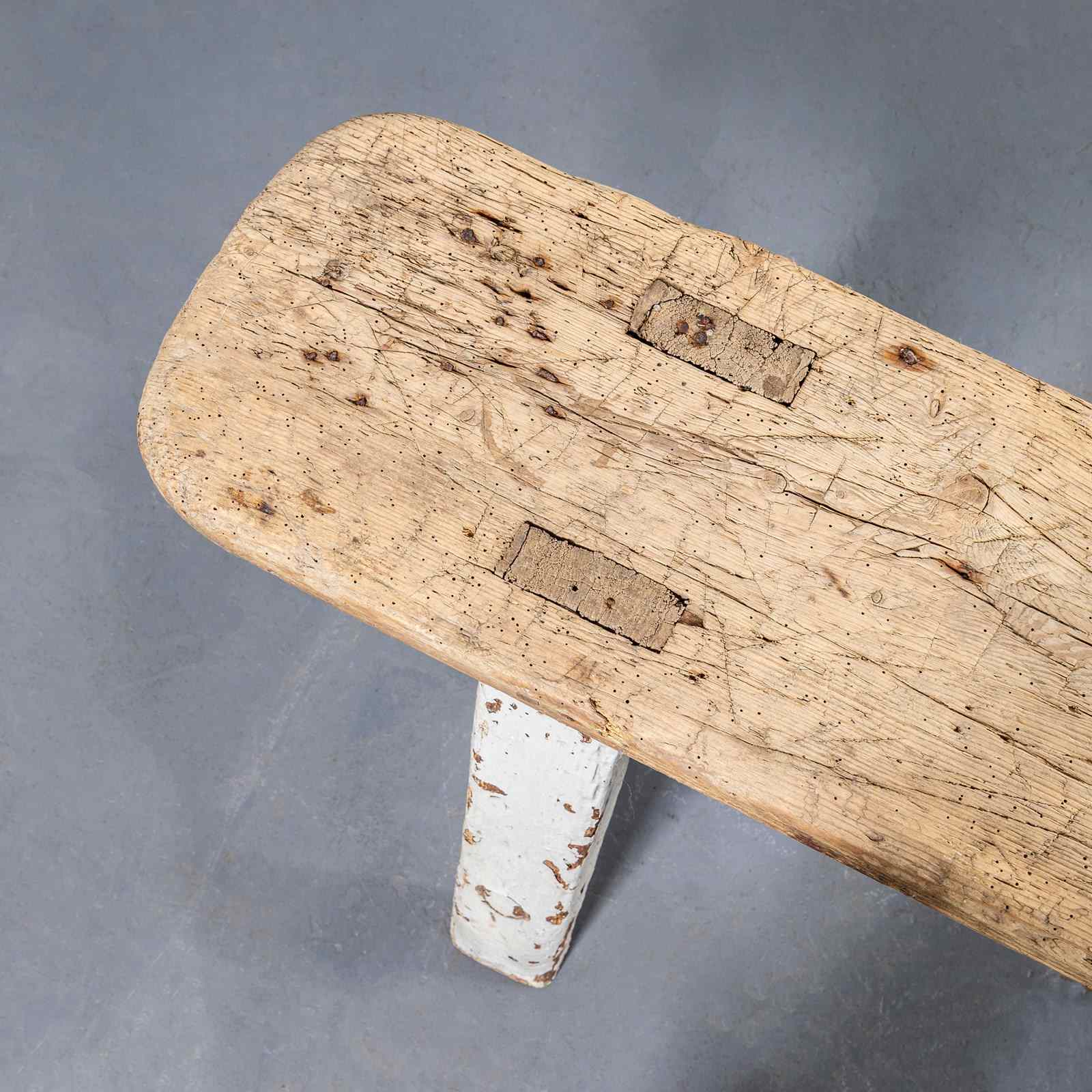 Good honest practical bench of a good compact size at just over two metres. Made in solid pine the bench has a rich scrubbed surface, it is strong and pretty sturdy with just a little movement simply due to it’s age and simple peg construction. As expected for a bench of this age it has signs of historical woodworm which has been treated out of caution. Seat Height: 45cm.