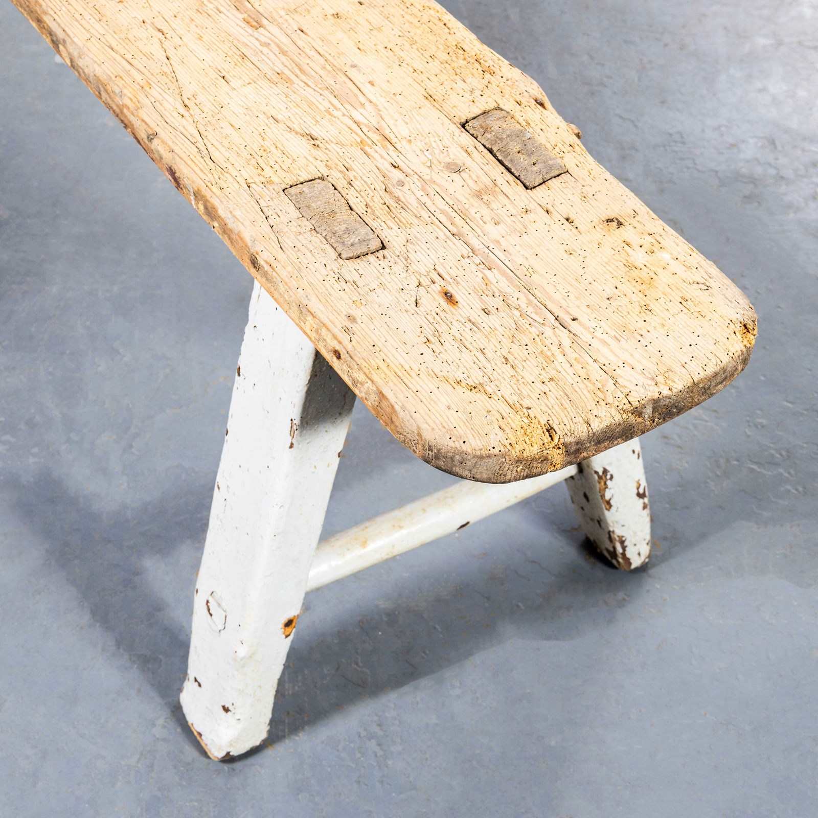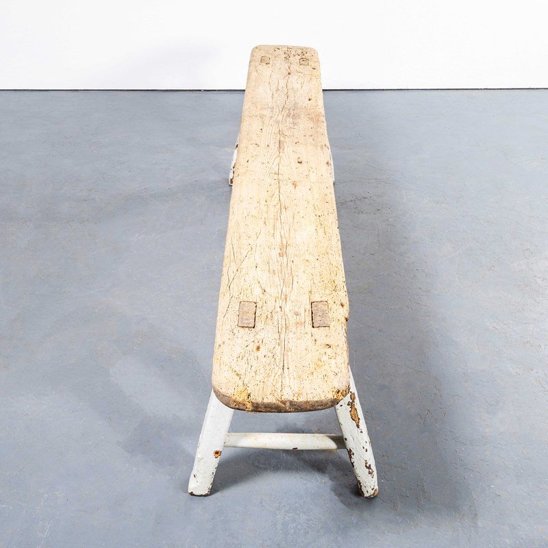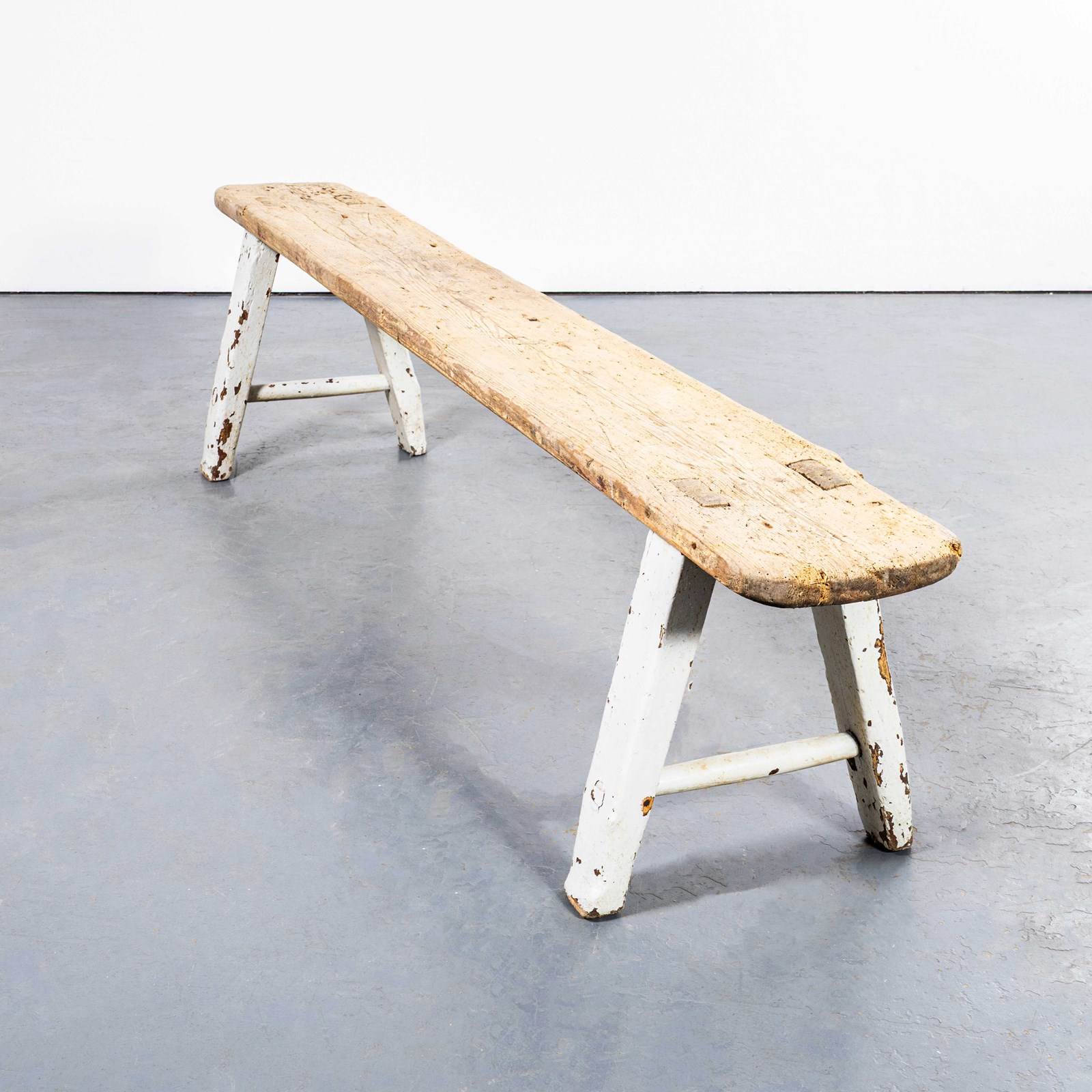 Good honest practical bench of a good compact size at just over two metres. Made in solid pine the bench has a rich scrubbed surface, it is strong and pretty sturdy with just a little movement simply due to it’s age and simple peg construction. As expected for a bench of this age it has signs of historical woodworm which has been treated out of caution. Seat Height: 45cm.