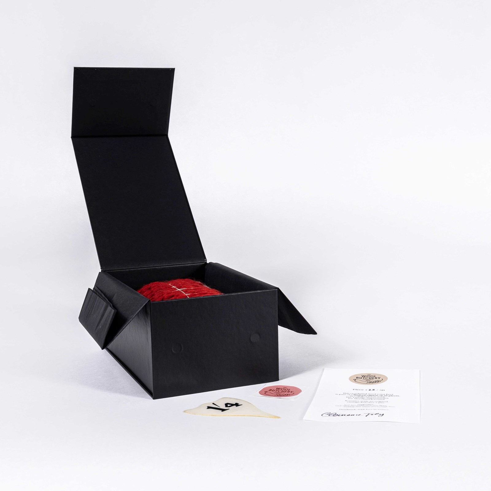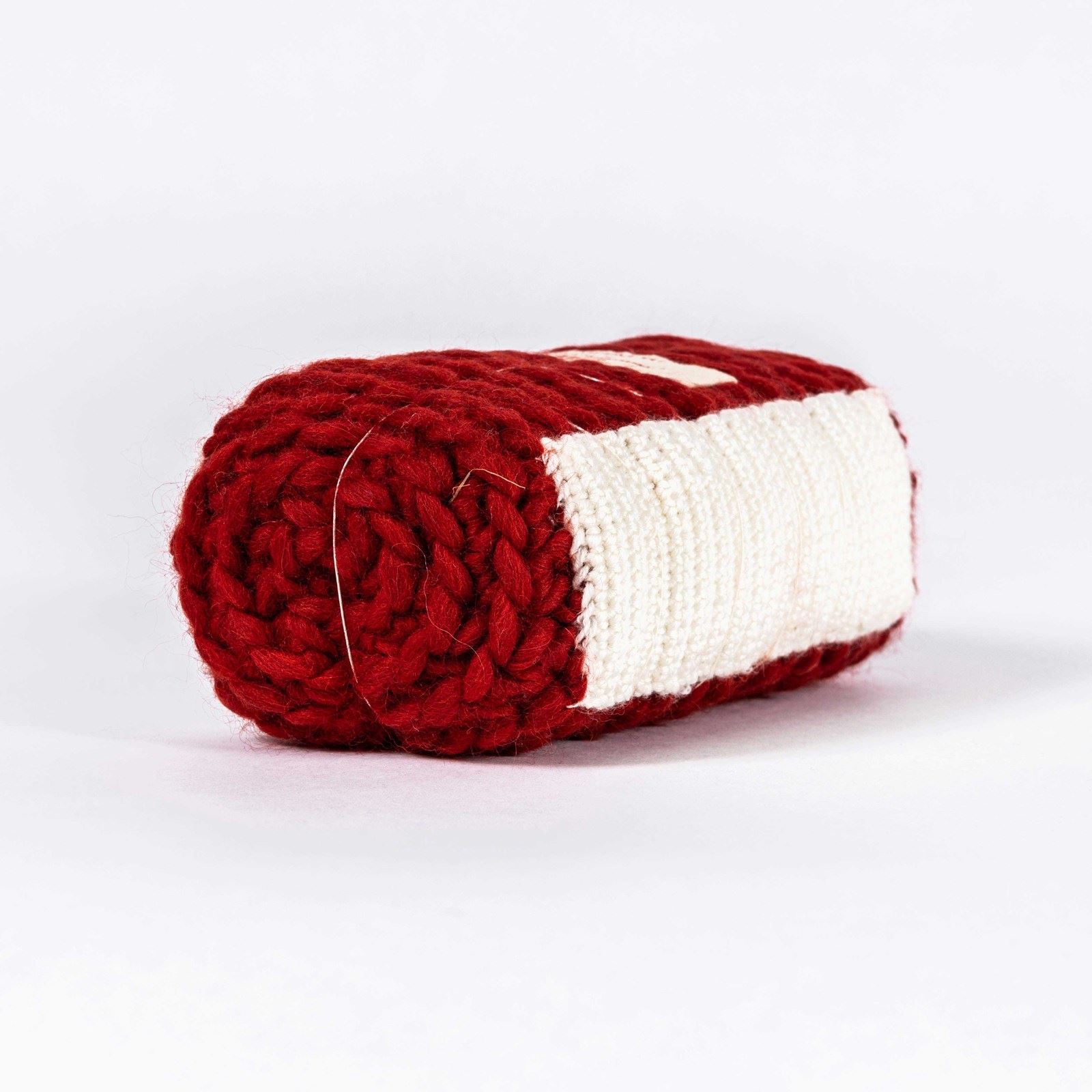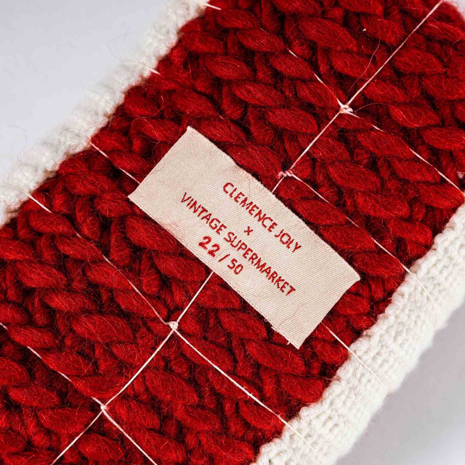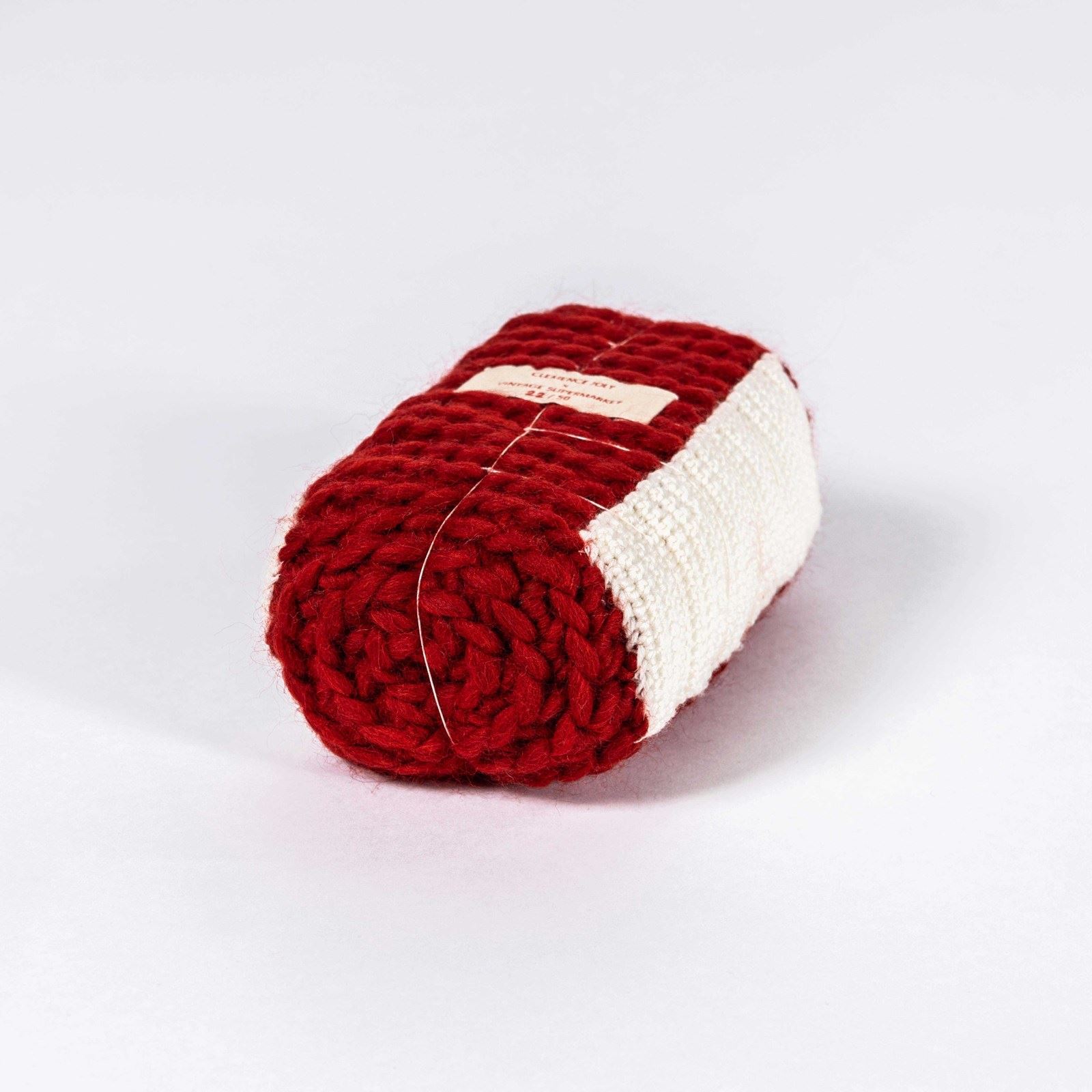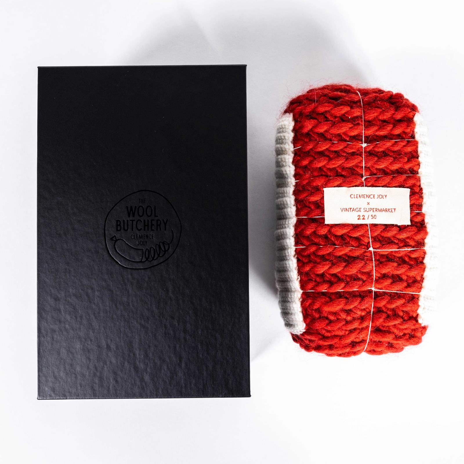 Contemporary product crocheted by hand using wool in Clemence’s studio. The ‘beef’ should be treated as a unique wool product and washing should be avoided. To remove any marks use proprietary products suitable for wool only.