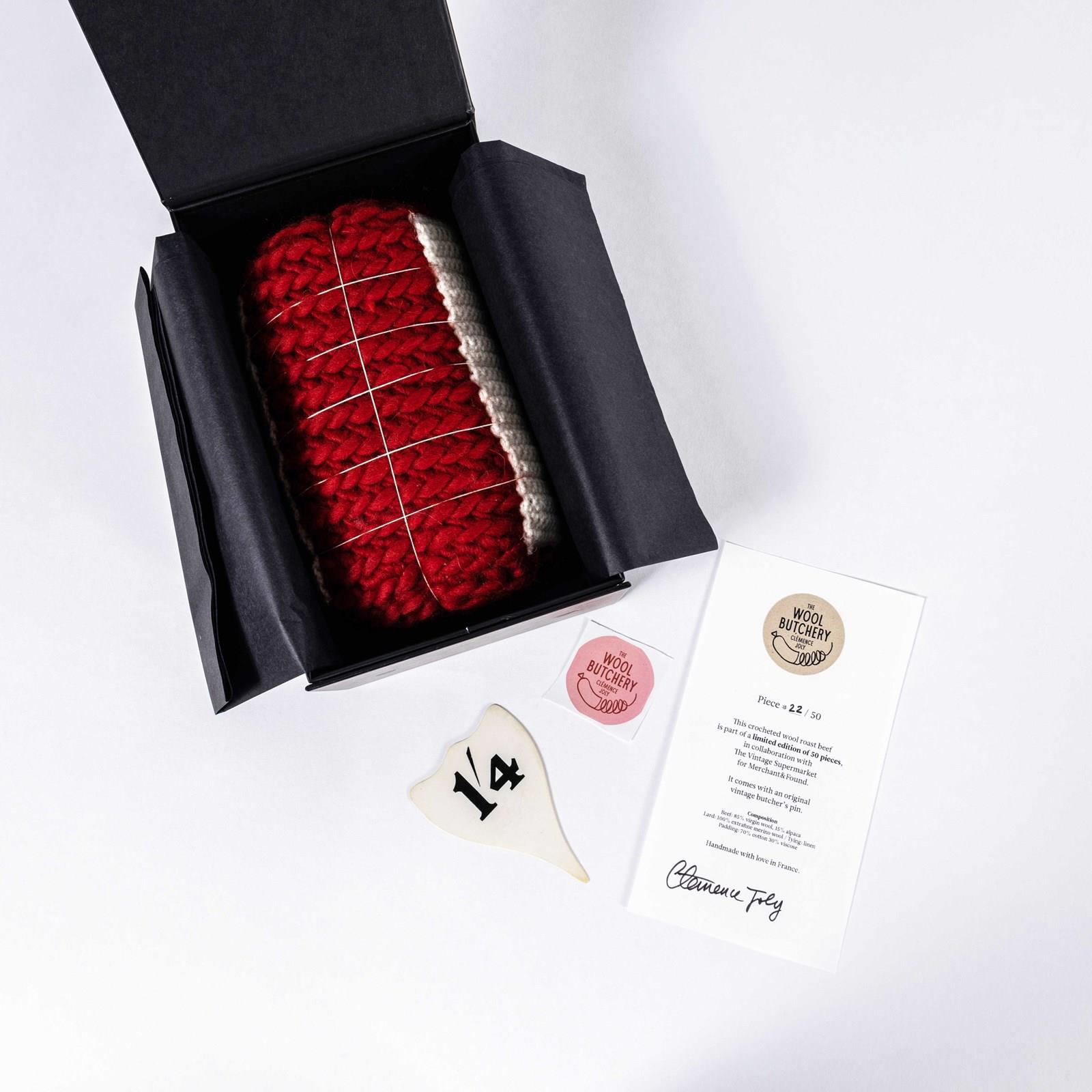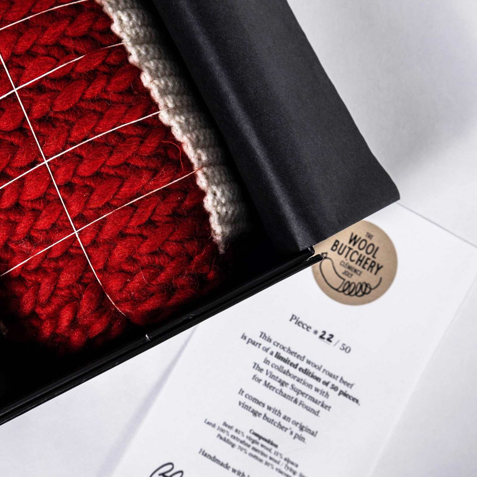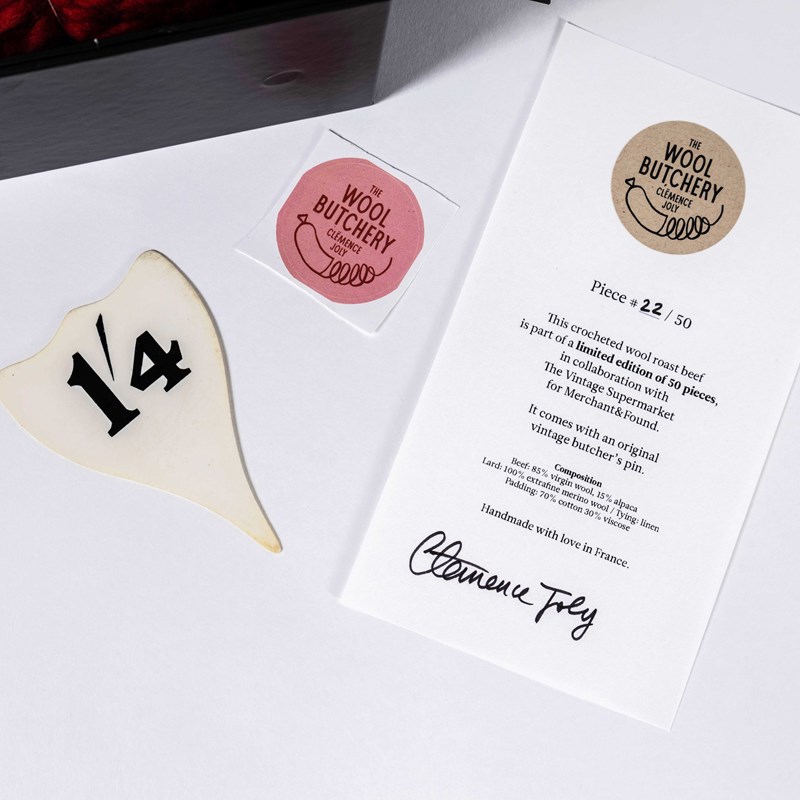 Clemence Joly lives and works in Paris. Clemence graduated as a graphic designer from Ecole Nationale Superieure D'Arts Appliques et des Metieres D'Art, and from the Chelsea School Of Art and Central Saint - Martins. Clemence is an internationally renowned textile artist who was commissioned by Merchant & Found to bring wit and life to our Vintage Supermarket. Clemence took part in our inaugural Vintage Supermarket event in London and we are very proud to be partnering with her to bring to the market her hand crocheted butchers products. The listing is for one 'Roast Beef' crocheted by hand using wool in Clemence's studio and presented in a superb gift box with a certificate of authenticity from Clemence and with the addition of an original vintage price label. There are additional inspirational images from our Vintage Supermarket, showing the contemporary maker and their works created for our event – these are additional images for inspiration, the listing is for the specific product only as described.
