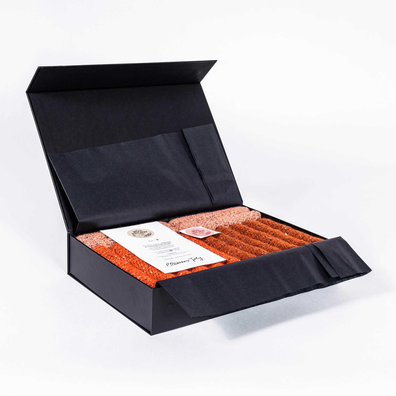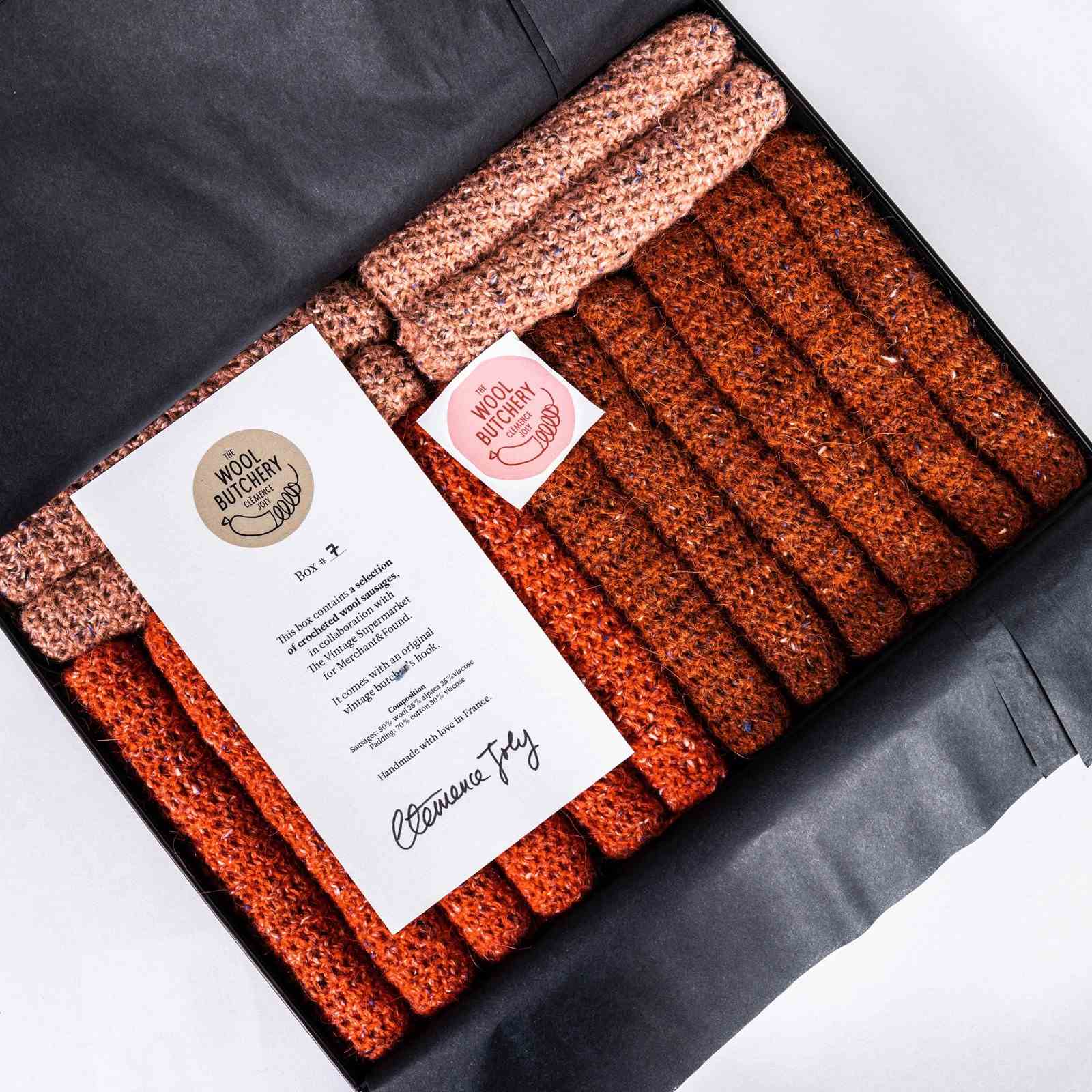 Contemporary Hand Knitted Saucisson Selection - Clemence Joly. Clemence Joly lives and works in Paris. Clemence graduated as a graphic designer from Ecole Nationale Superieure D'Arts Appliques et des Metieres D'Art, and from the Chelsea School Of Art and Central Saint - Martins. Clemence is an internationally renowned textile artist who was commissioned by Merchant & Found to bring wit and life to our Vintage Supermarket. Clemence took part in our inaugural Vintage Supermarket event in London and we are very proud to be partnering with her to bring to the market her hand crocheted butchers products. The listing is for one 'box of saucisson' including sixteen individual saucisson, crocheted by hand using wool in Clemence's studio and presented in a superb gift box with a certificate of authenticity from Clemence and with the addition of an original vintage butchers hook. Dimensions are for one saucisson. There are additional inspirational images from our Vintage Supermarket, showing the contemporary maker and their works created for our event – these are additional images for inspiration, the listing is for the specific product only as described.