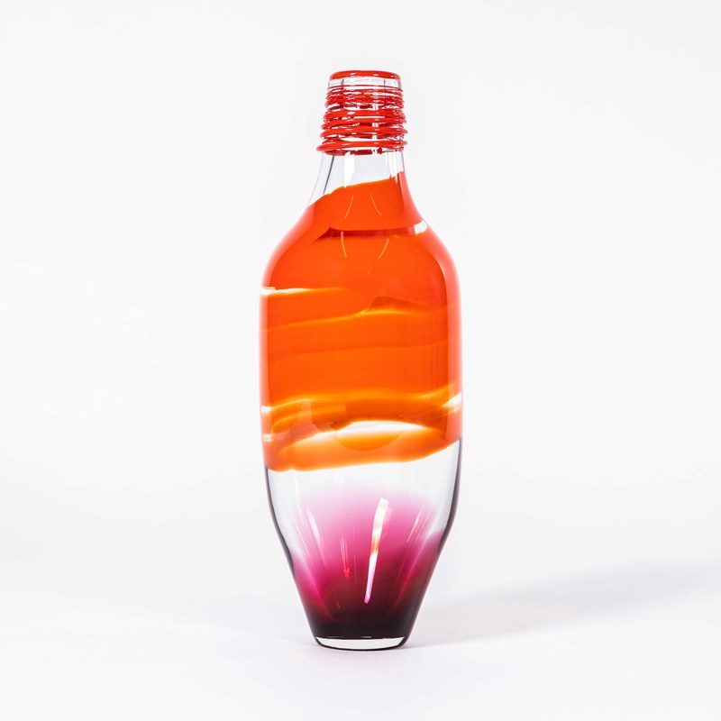 A recent graduate from the Manchester School Of Art specialising in hot blown glass and mould design. Jahday is driven to explore the material of glass and its behaviours with compatible materials in a digital world. Jahday was commissioned to create a contemporary take on the use of glass bottles as everyday vessels in the context of our Vintage Supermarket. The vessel is mouthblown using a combination of traditional glass blowing techniques creating a unique piece incorporating depth of blended glass colour, wrapped glass detail and dusted colour bringing a creative depth to a vessel used since time in memorial. There are additional inspirational images from our Vintage Supermarket, showing the contemporary maker and their works created for our event – these are additional images for inspiration, the listing is for the specific product only as described.