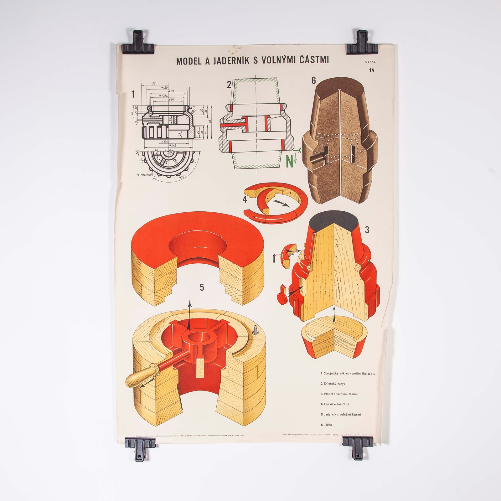 Czech Technical Industrial Drawing – Foundry Mould Engineering Poster – 13 Sourced from an old engineering workshop in the Czech Republic, an amazing series of technical industrial drawings explaining the process of sand casting and creating the wooden moulds/plugs for creating cast metal parts. The ‘male’ form (red plug) is used to form the ‘female’ shape in the process of sand casting. Each one is hand cut and shaped. The plug is pushed into a box form full of casting sand which creates the female shape into which the molten metal is poured. We have a number of posters and are selling them unframed. Workshop Report Our workshop team inspect every product and carry out any needed repairs to ensure that everything leaves us serviced and maintained ready for many more years of life. All of our vintage products show the rich beauty and history of their life with the knocks and bumps of many years of use and we try to minimise restoration to keep every piece as original as possible.