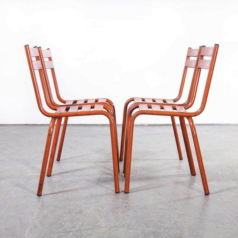 1950’s French ArtProg Metal Stacking Outdoor Chairs – Set of Four. Reminiscent of Tolix but not made by Tolix, ArtProg was a producer in Gray in Haute Saone. Sometimes known as the ‘Toledo’ chair it was industrially produced in the 1950’s.The chair was renowned as a marketing tool for the major brewers often stamped with the brewers name and given to the pubs/bars at substantial discount to help promote their beer. Good practical stacking outdoor chairs restored by our workshop and in good strong condition. Seat Height 46cm.