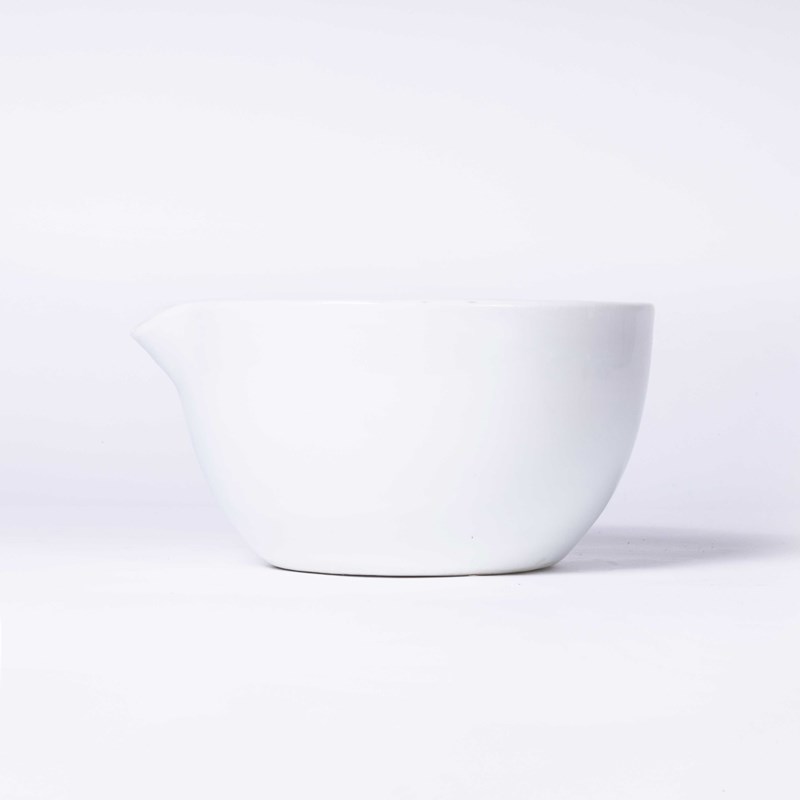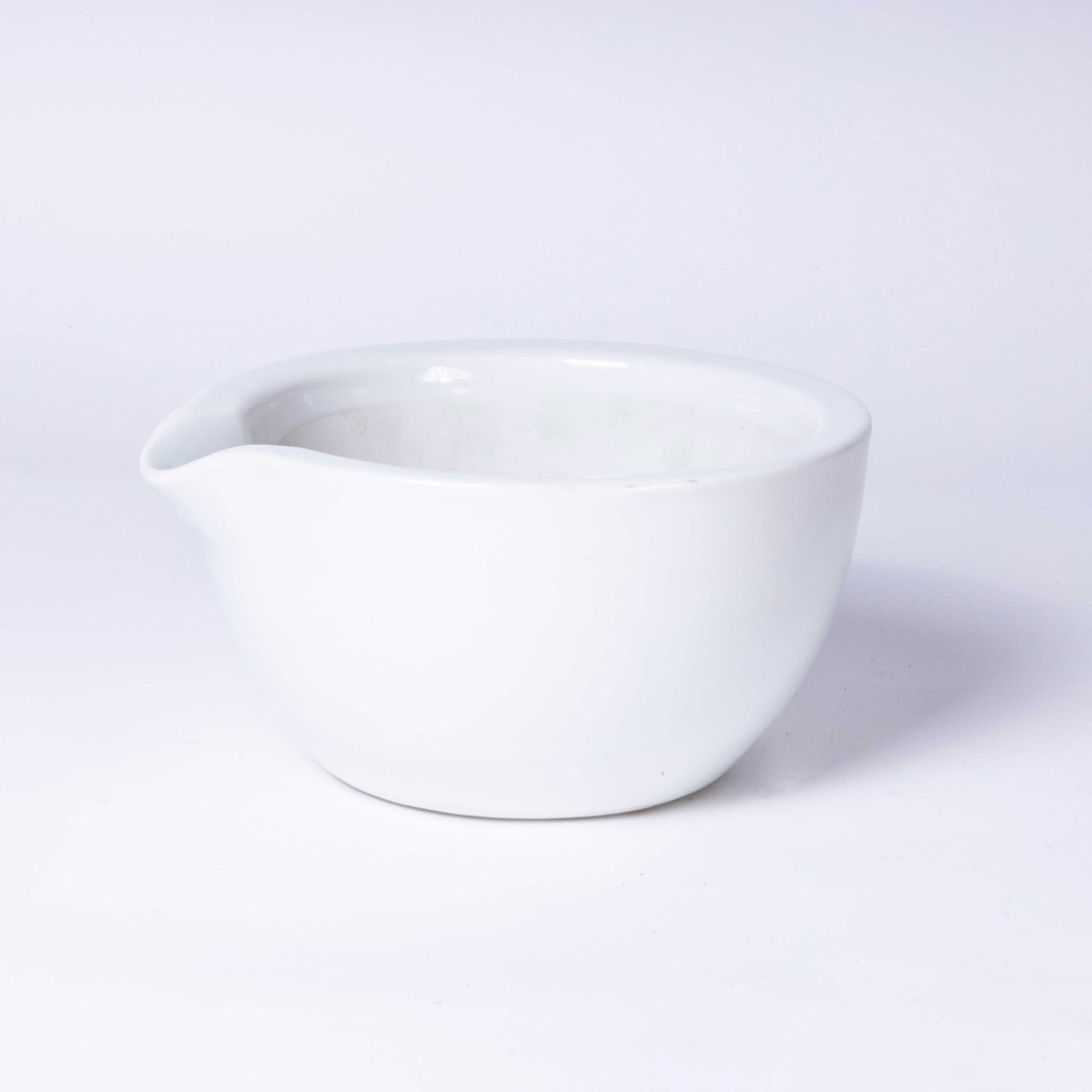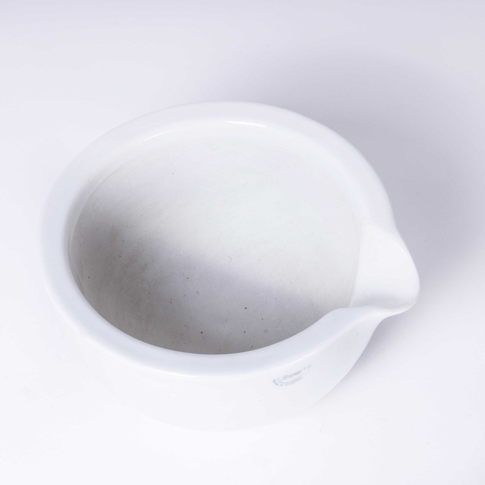 Mid Century Porcelain Crucible Laboratory Bowl. Made in Czech. A white porcelain bowl with a smooth finish and a spout for pouring. In excellent vintage condition.