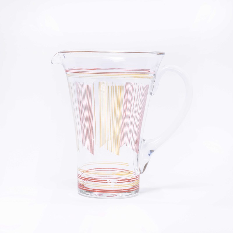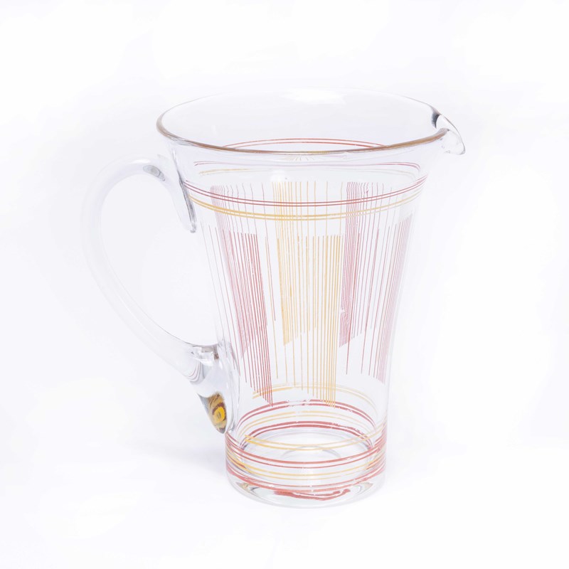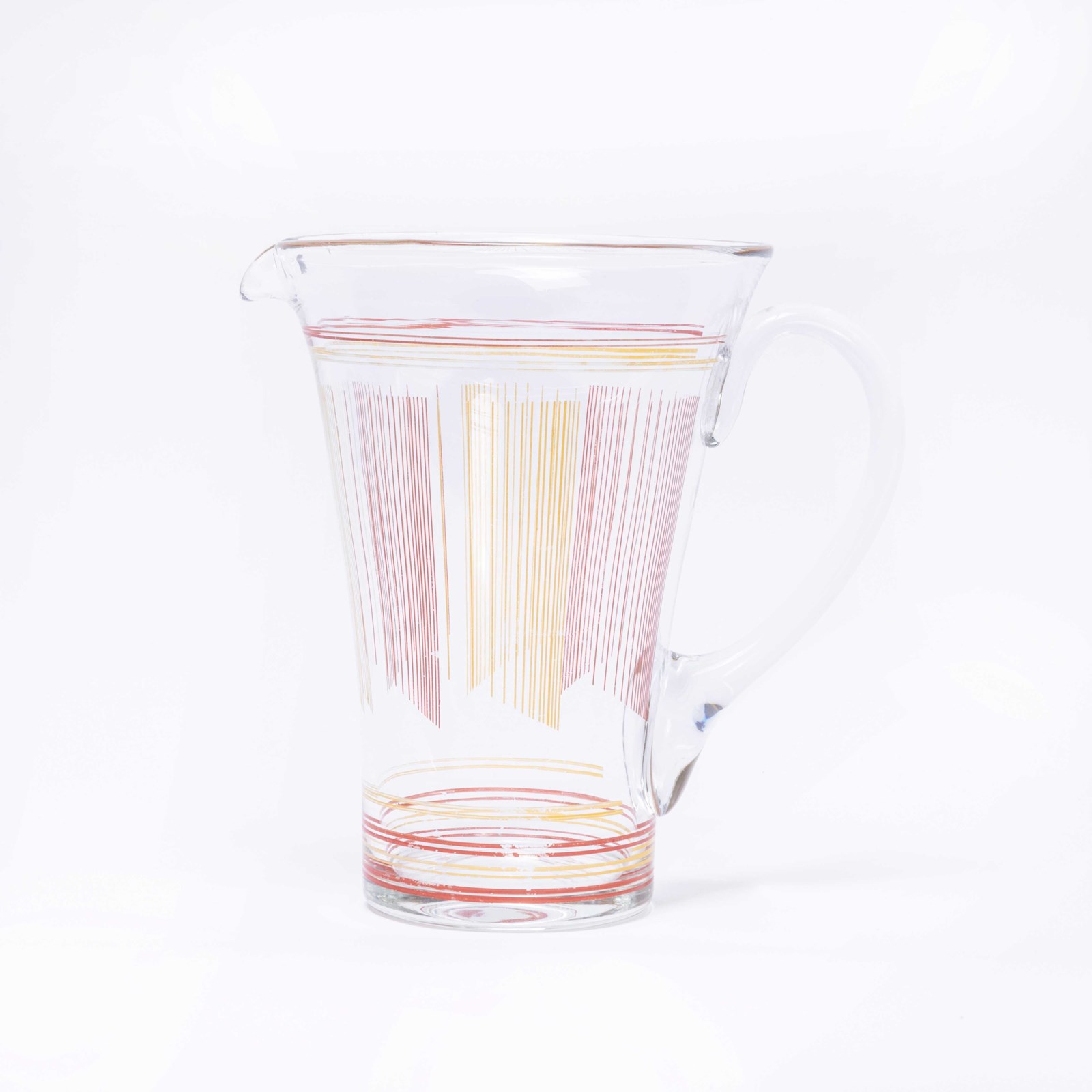 Mid Century Scandinavian Art Glass Enamelled Jug. Handmade in the 20th Century in Sweden. The jug has vibrant vertical lines decorated onto the heavy glass form. This is in excellent condition, no chips, cracks or faults.