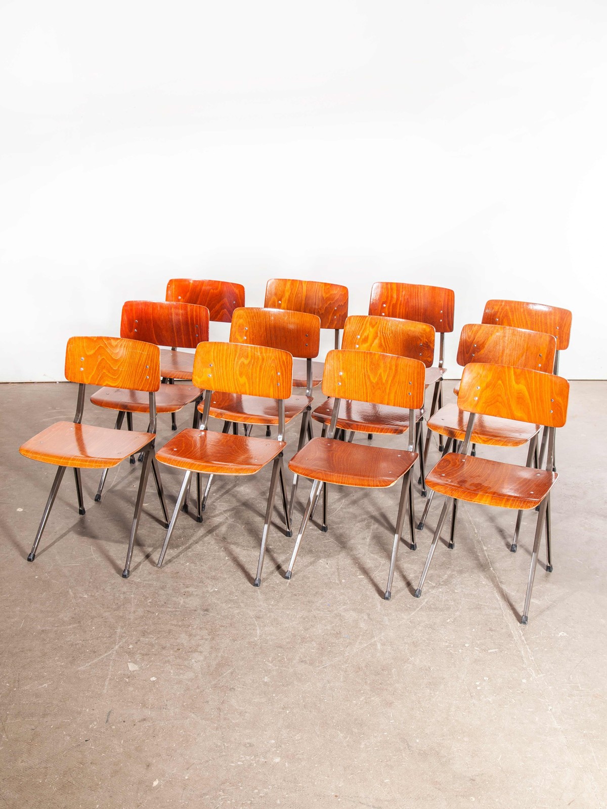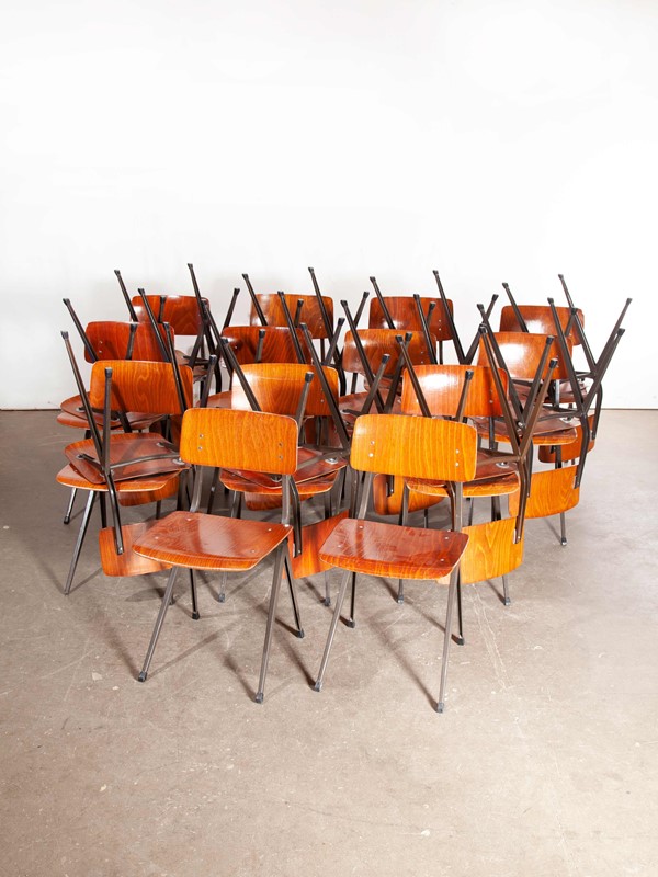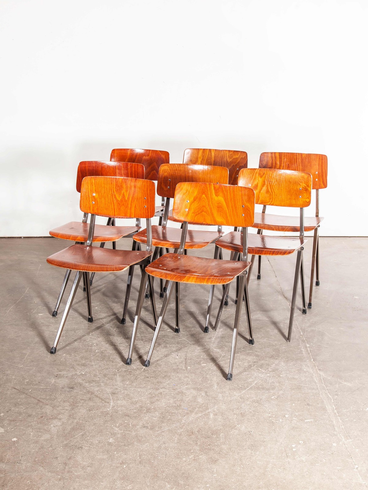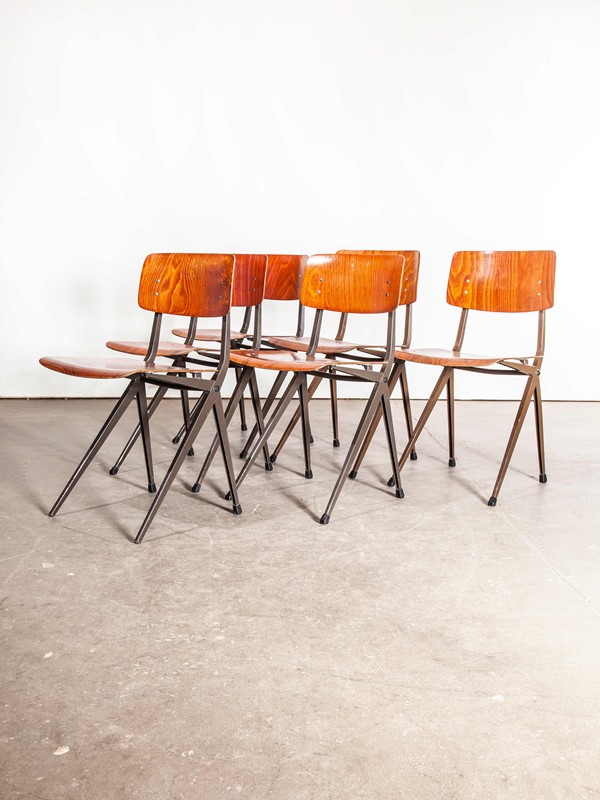 S201 Dining chair by Ynske Kooistra for Marko – good quantity available. The classic Dutch compass leg chair was perhaps originally created by Prouve who then inspired a number of beautiful chair designs in the late 1950’s. Friso Kramer and Wim Rietveld designed the result chair in the 1950’s alongside the S16 chair designed and produced by Galvanitas. The S201 by Dutch company Marko came from this creative period and it is one of the most graceful variants with its swept front leg allowing the suspended seat frame. Made from a sheet steel frame with a fine laminated and formed seat and back. The chairs are a good comfortable scale and are a design classic. We have a number of these chairs available and are selling them in any multiple required, sets of four, six, eight or simply in singles. We service each chair individually before they leave our workshop and we deliver chairs of excellent quality. We specialise in high quality vintage dining chairs and have a large range. We only sell the very best chairs in great condition with rich colour and patina, please see the other dining chairs we have listed and please contact us for more details or advice. Seat Height 47cm WORKSHOP REPORT Our workshop team inspect every product and carry out any needed repairs to ensure that everything leaves us serviced and maintained ready for many more years of life. All of our vintage products show the rich beauty and history of their life with the knocks and bumps of many years of use and we try to minimise restoration to keep every piece as original as possible. Date: 1960's Maker: Marko - Netherlands Dimensions: L 40 x W 42 x H 78 cm