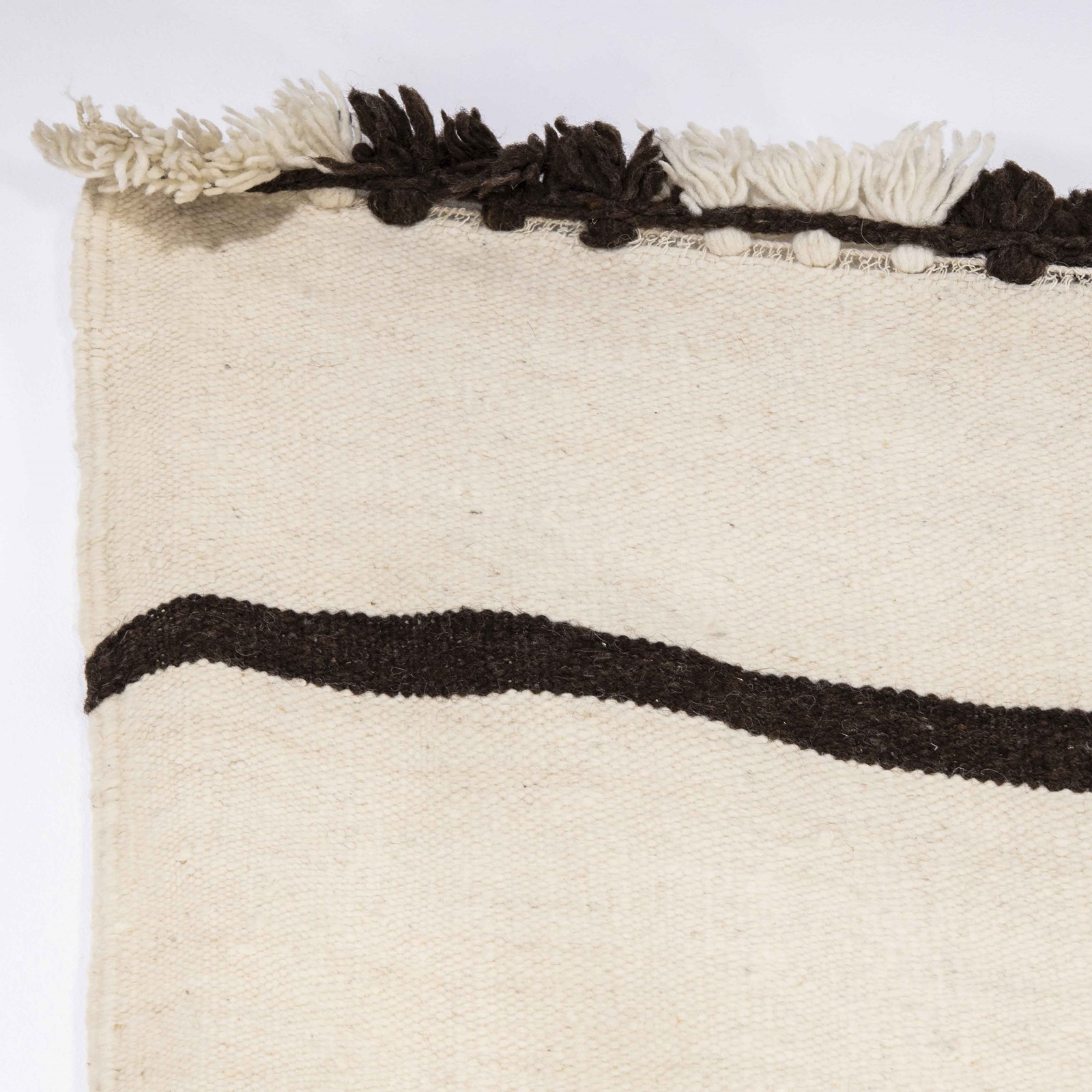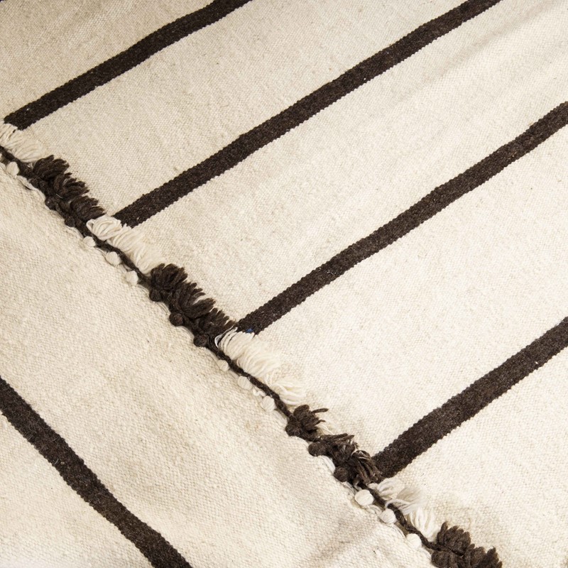 Vintage Berber Black Thin Stripe Hanbel Rug. Vintage Berber Black Thin Stripe Hanbel Rug. These are flat-woven rugs (Hanbel in Arabic) which are light in weight due to the lack of pile. They are often used on floors in hotter countries as they are easy to just shake outside if dusty or sandy. In cooler climates, they are suited to wooden floors as a decorative item, as bedcovers or blankets , or even wall hangings. Often they feature strong designs and patterns and may incorporate some low pile, knotted elements and hand embroidery. Berbers or Imazighen are an indigenous ethnic group from the Maghreb region of North Africa, specifically Morocco, Algeria, Tunisia, and Libya. Historically, Berber nations have spoken Berber languages. Most Berbers were in fact traditionally farmers, living a relatively nomadic existence in the mountains relatively close to the Mediterranean coast. 100% Wool, Circa 1970’s. WORKSHOP REPORT Our workshop team inspect every product and carry out any needed repairs to ensure that everything leaves us serviced and maintained ready for many more years of life. All of our vintage products show the rich beauty and history of their life with the knocks and bumps of many years of use and we try to minimise restoration to keep every piece as original as possible.