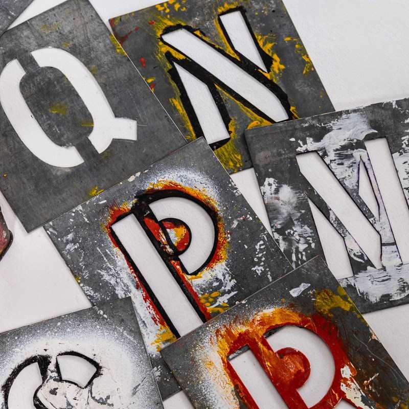 Well loved and used set of stencils as shown, diligently saved in a tin. Dimensions: 11x12x0.2cm