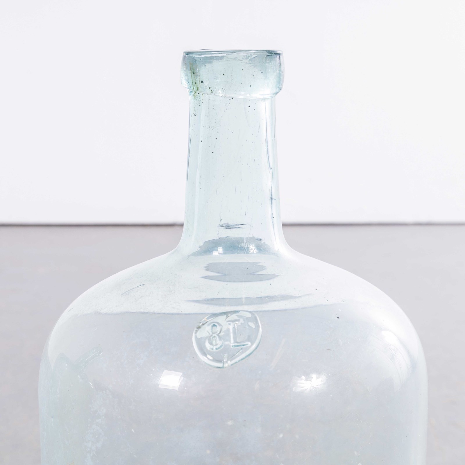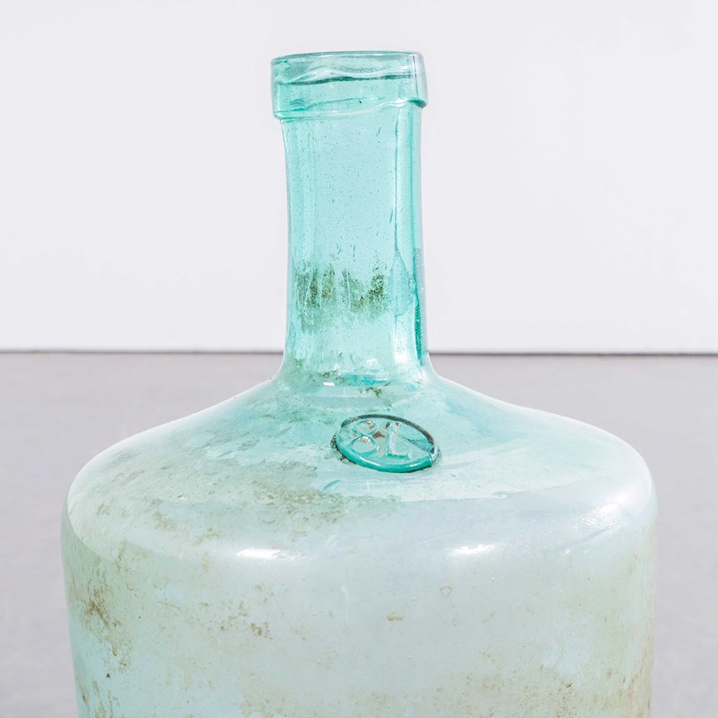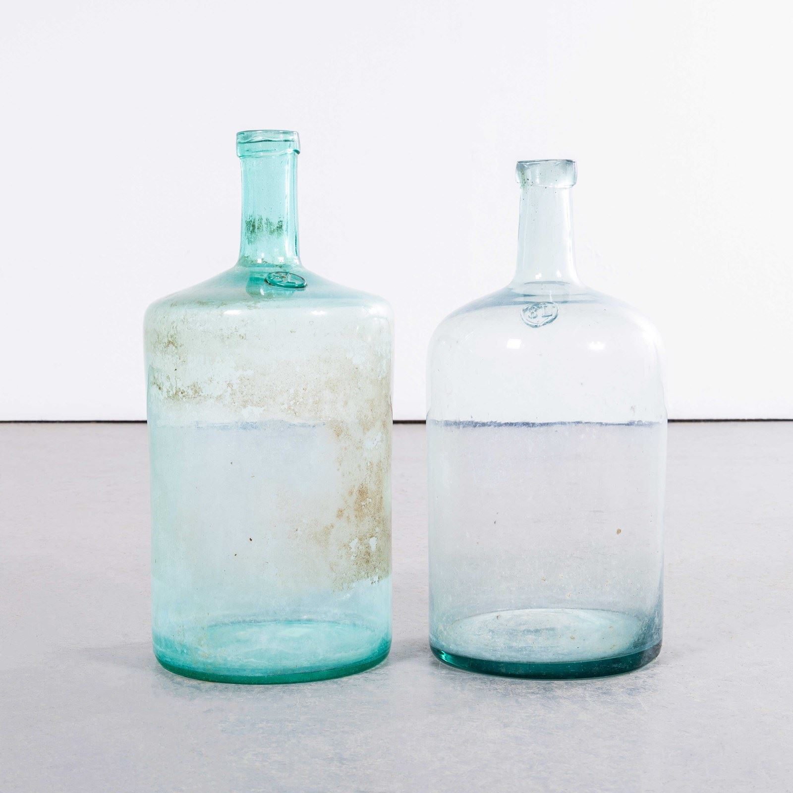 Vintage French Aqua & Clear Glass Demijohns – Pair. A pair of mouth blown glass demijohns used as a traditional containers mainly for wine storage and transport. These demijohns have been carefully cleaned. Demijohn Dimensions. Smallest: L20 W20 H41, Largest: L20 W20 H44