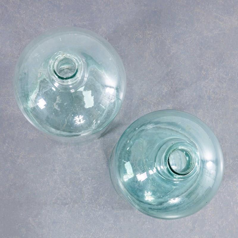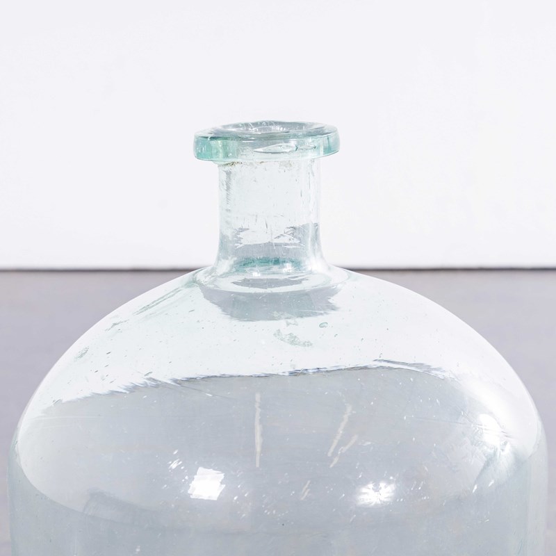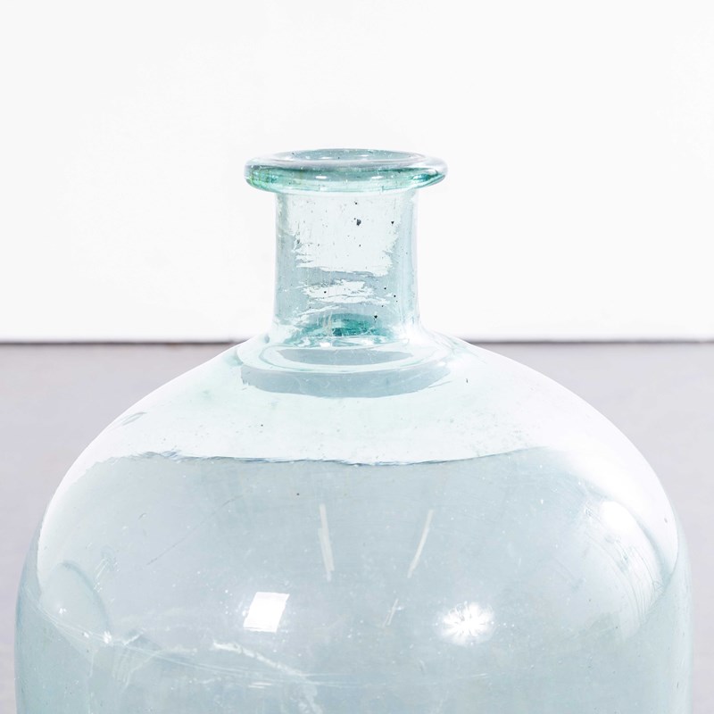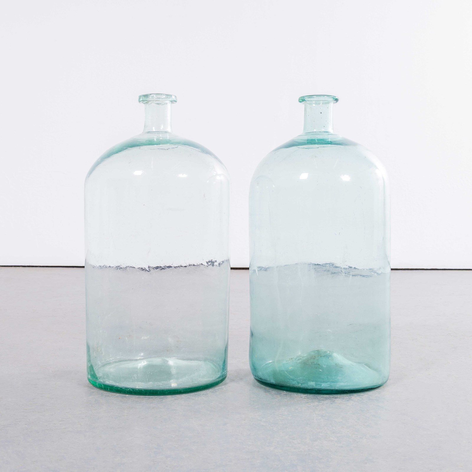 Vintage French Blue & Clear Glass Demijohns – Pair. A pair of mouth blown glass demijohns used as a traditional containers mainly for wine storage and transport. These demijohns have been carefully cleaned. Demijohn Dimensions. Smallest: L21 W21 H43, Largest: L22 W22 H43