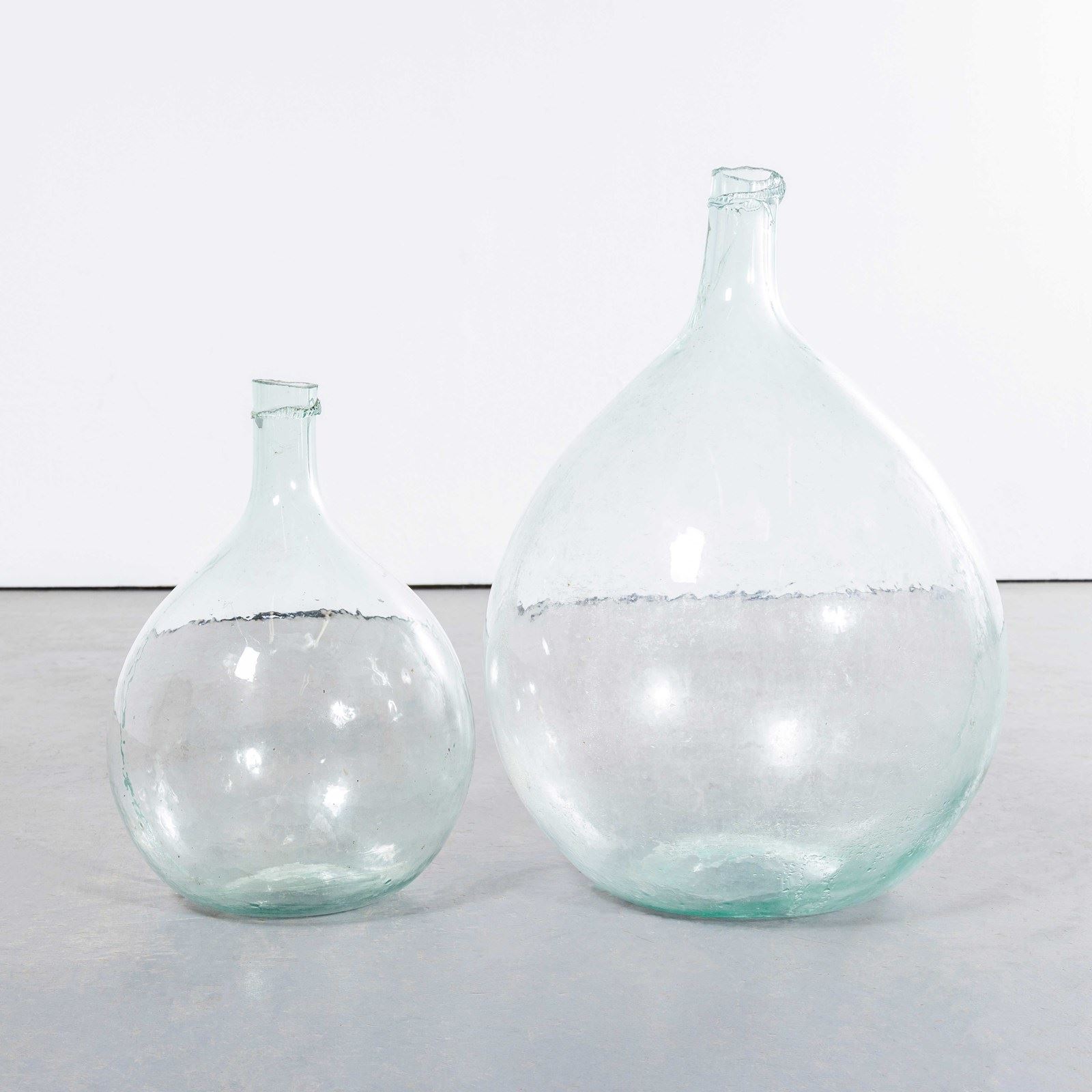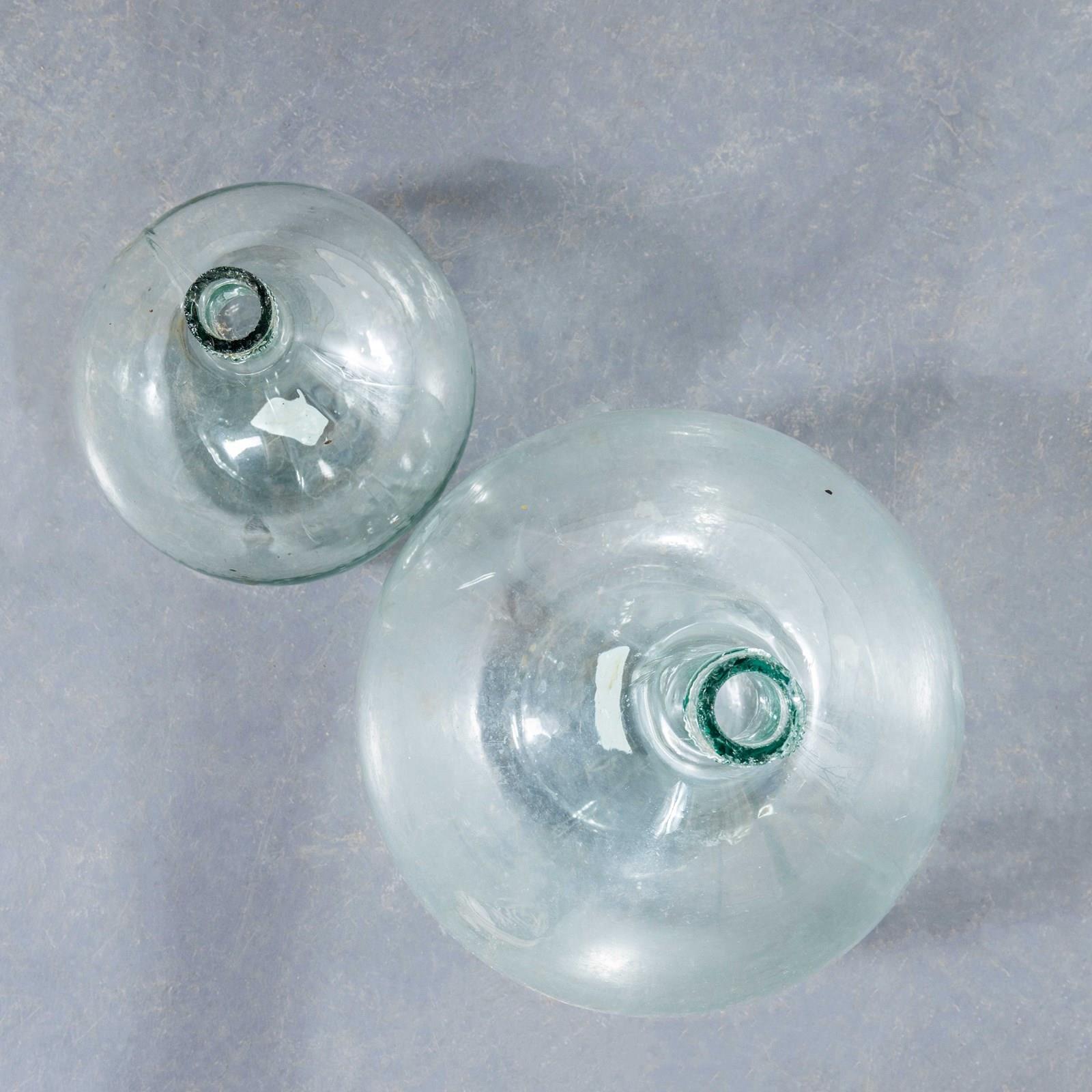 A pair of mouth blown glass demijohns used as a traditional containers mainly for wine storage and transport. These demijohns have been carefully cleaned. Demijohn Dimensions. Smallest: L24 W24 H30, Largest: L32 W32 H42
