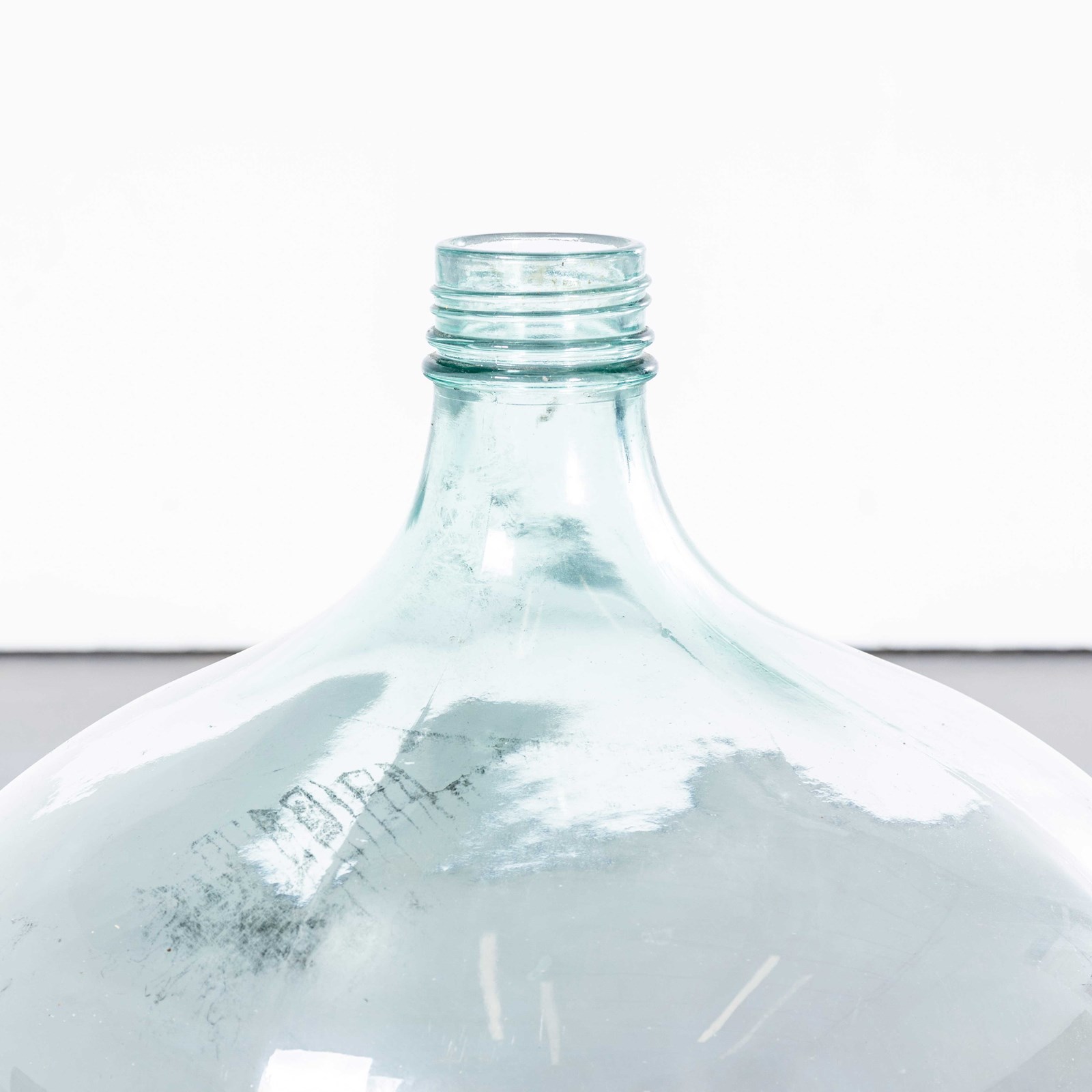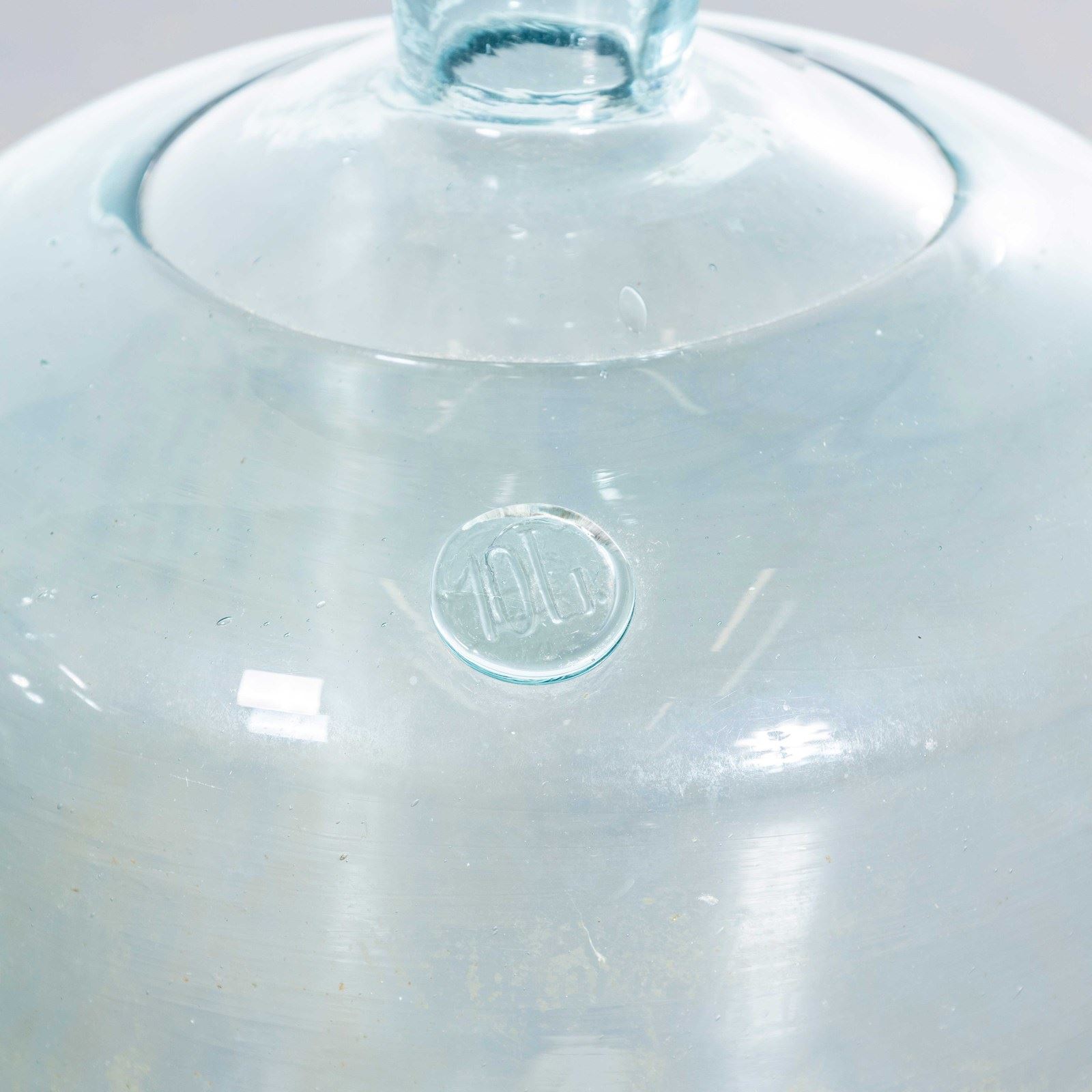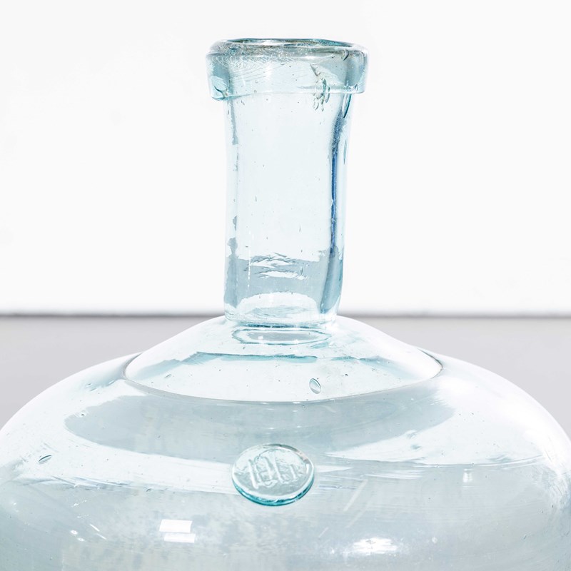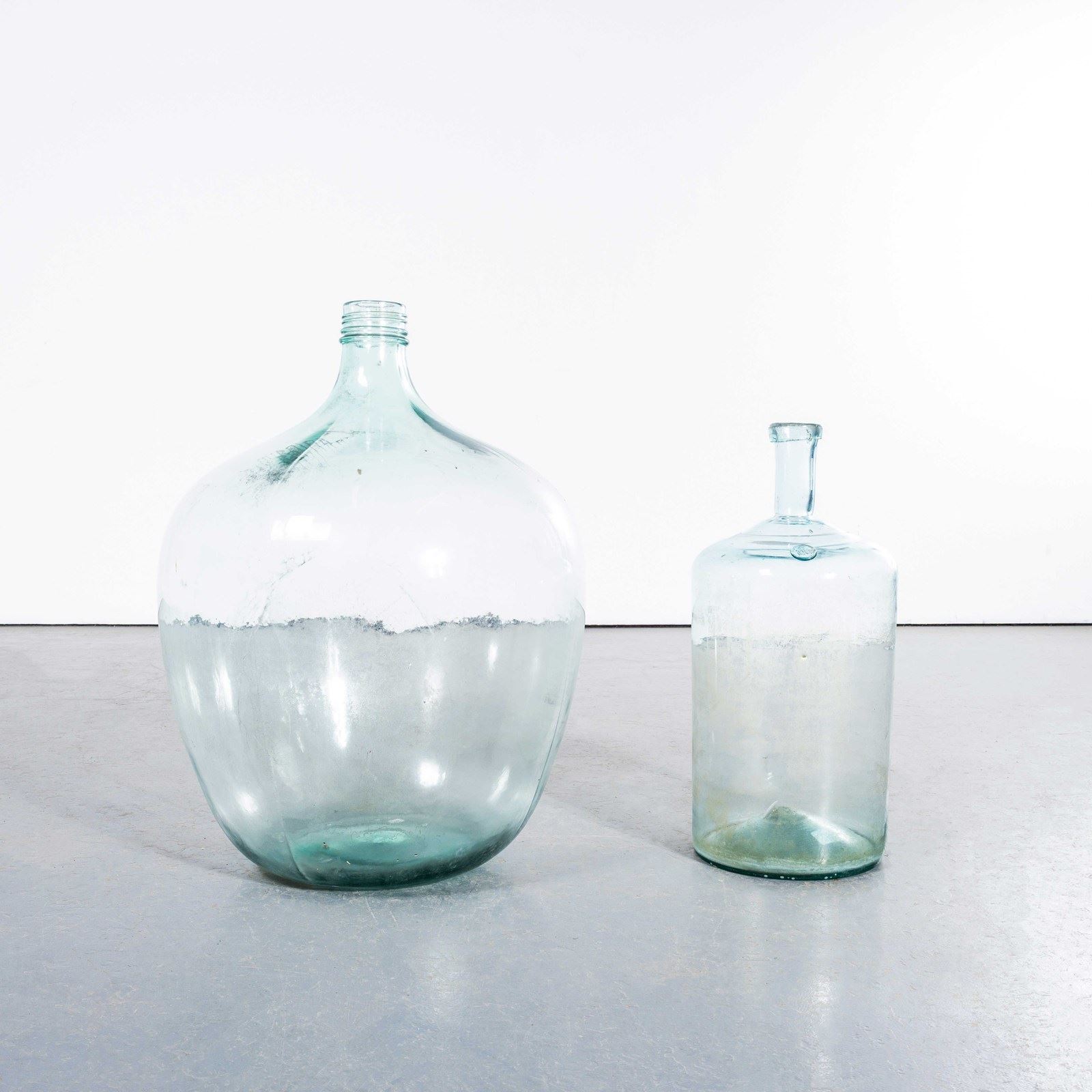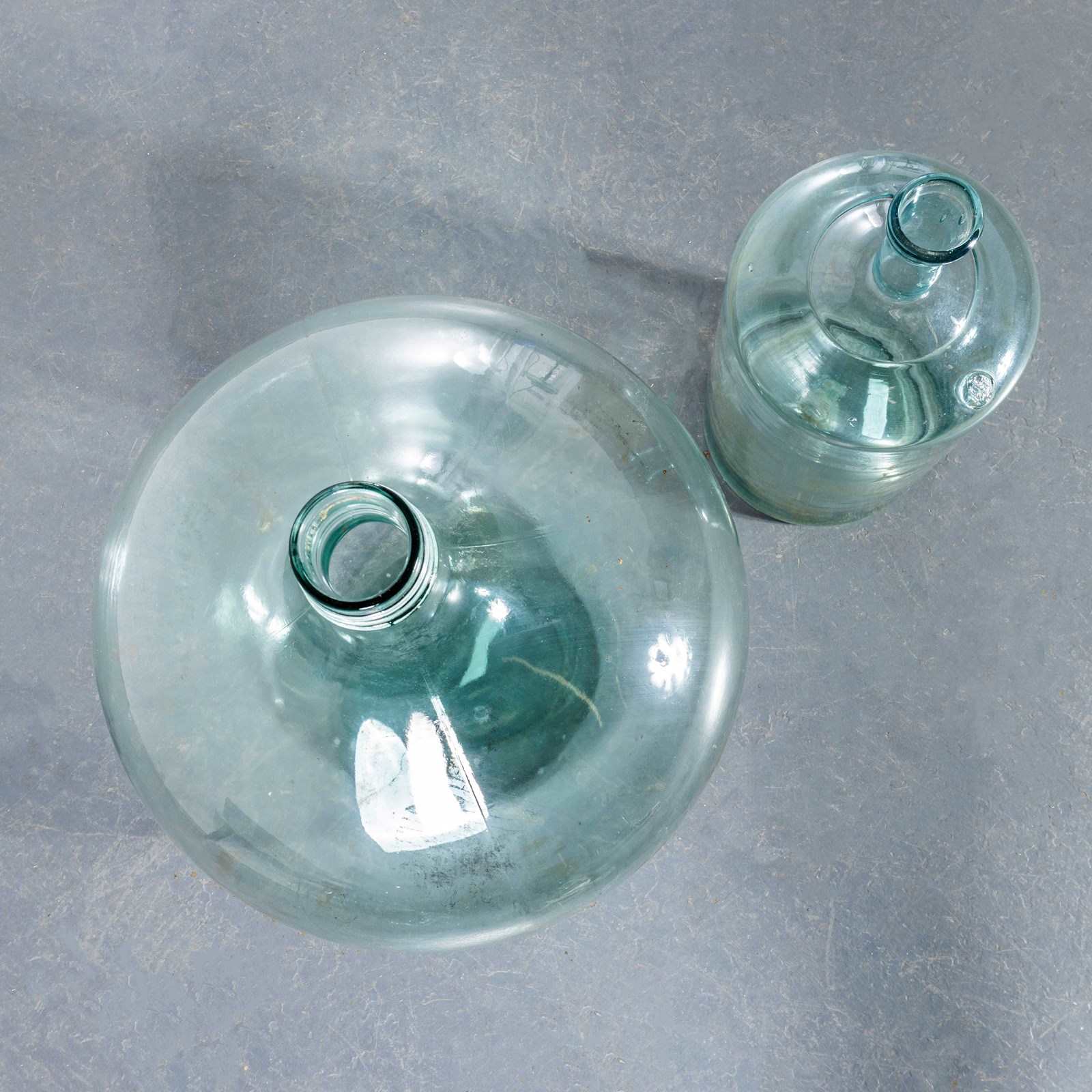 A pair of mouth blown glass demijohns used as a traditional containers mainly for wine storage and transport. These demijohns have been carefully cleaned. Demijohn Dimensions. Smallest: L21 W21 H46, Largest: L42 W42 H58