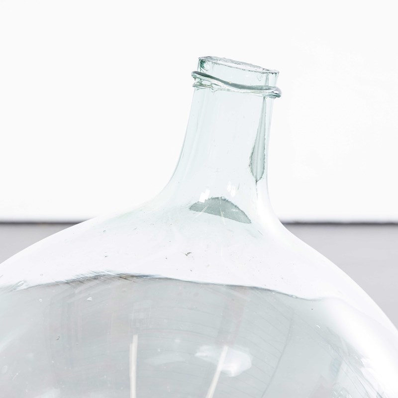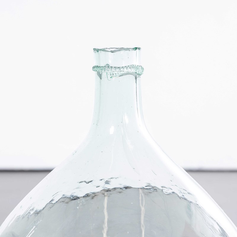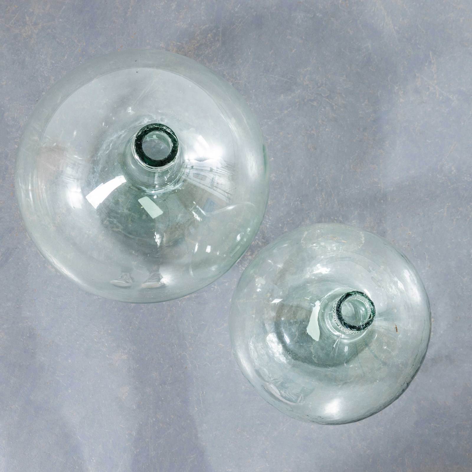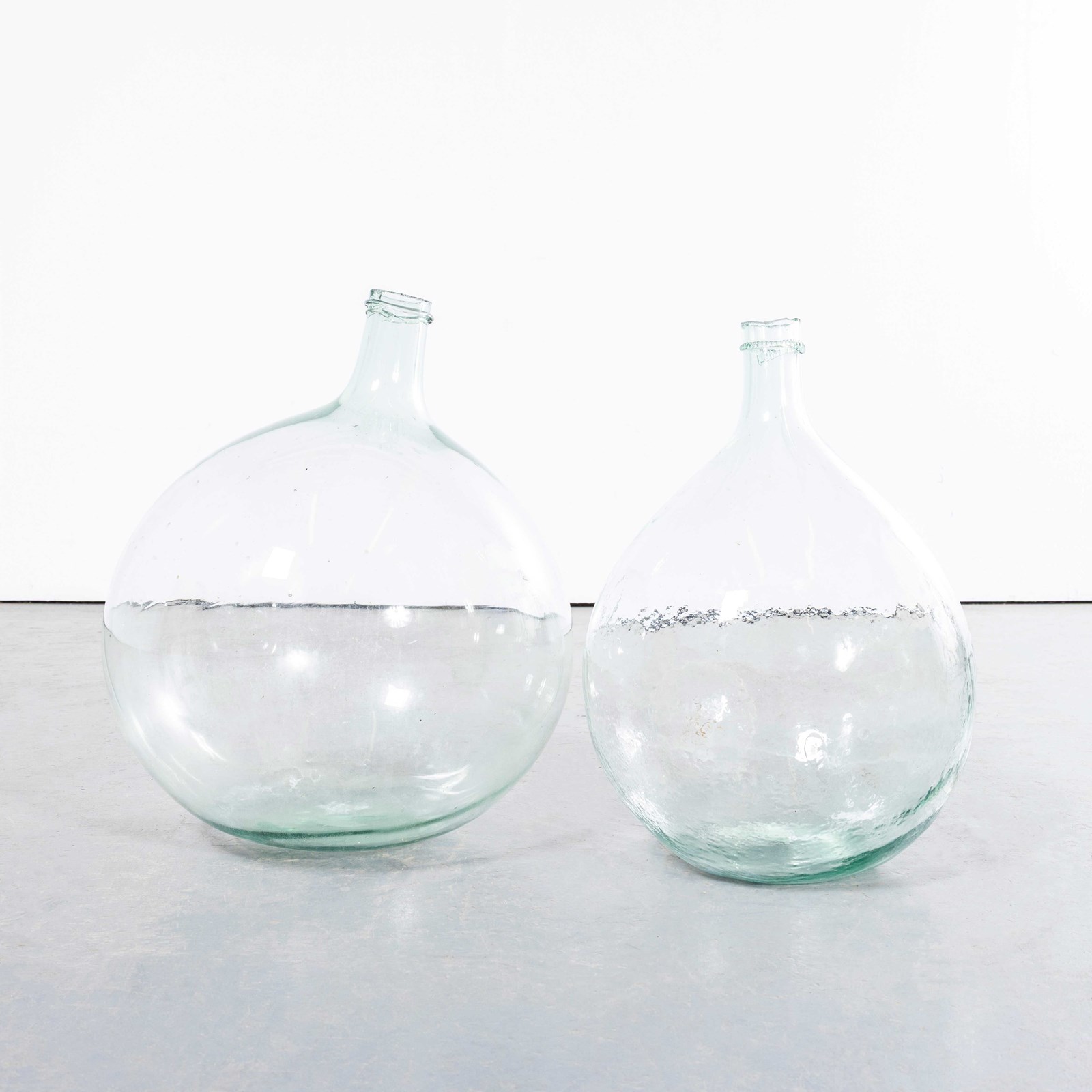 A pair of mouth blown glass demijohns used as a traditional containers mainly for wine storage and transport. These demijohns have been carefully cleaned. Demijohn Dimensions. Smallest: L26 W26 H38, Largest: L34 W34 H41