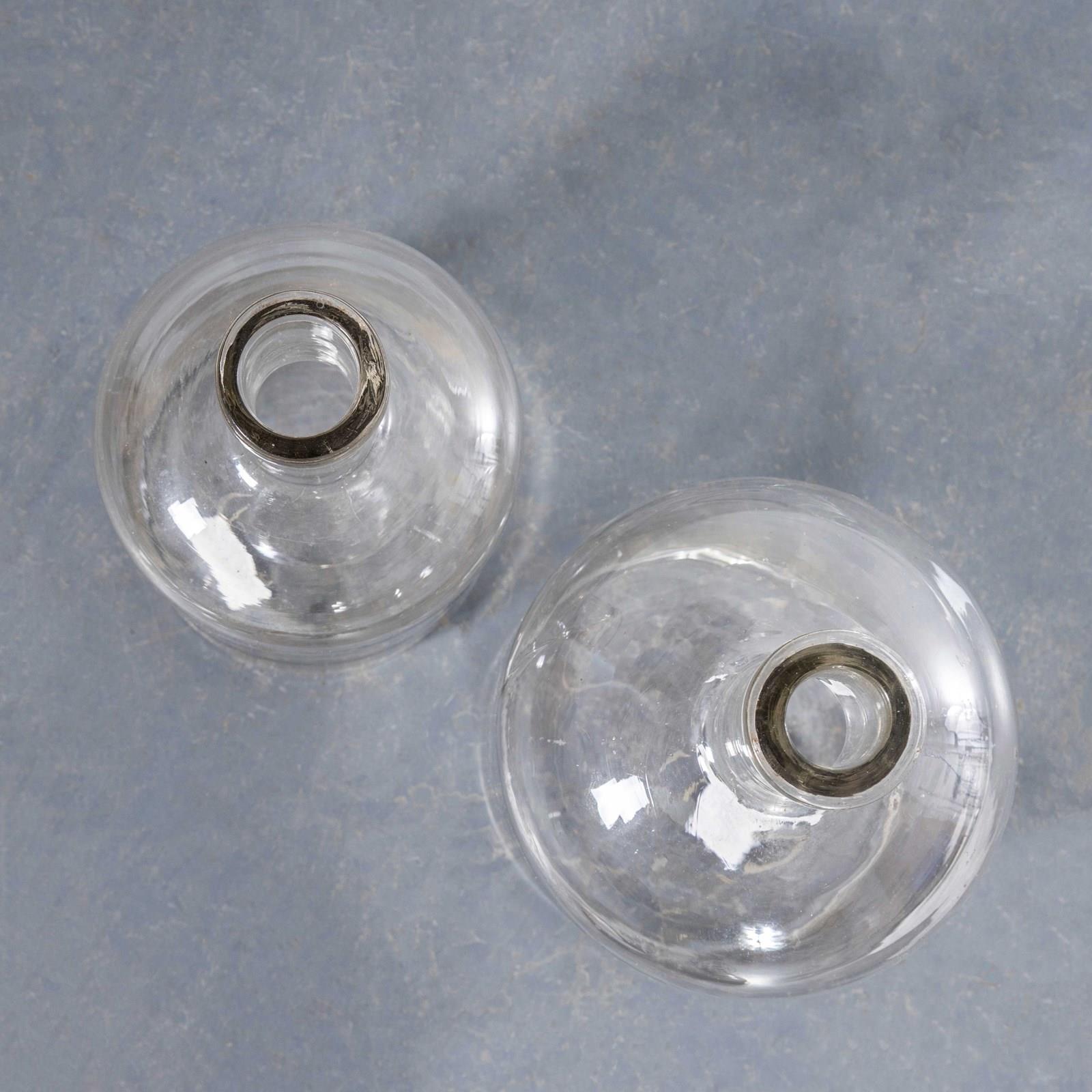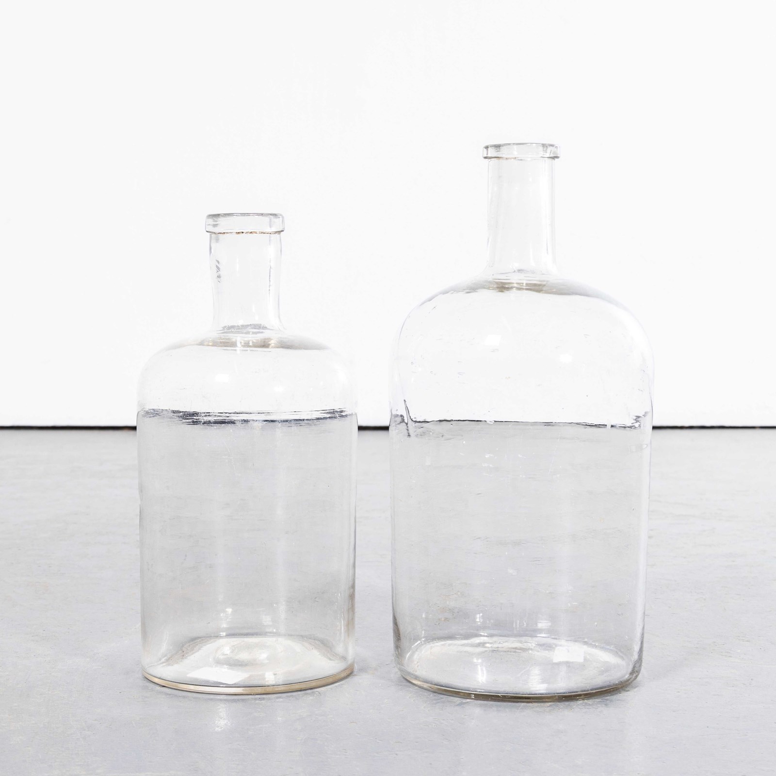A pair of mouth blown glass demijohns used as a traditional containers mainly for wine storage and transport. These demijohns have been carefully cleaned. Demijohn Dimensions. Smallest: L14 W14 H30, Largest: L16 W16 H35