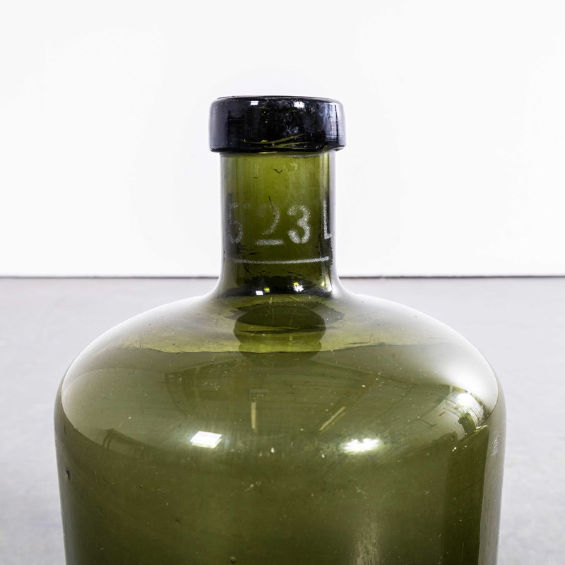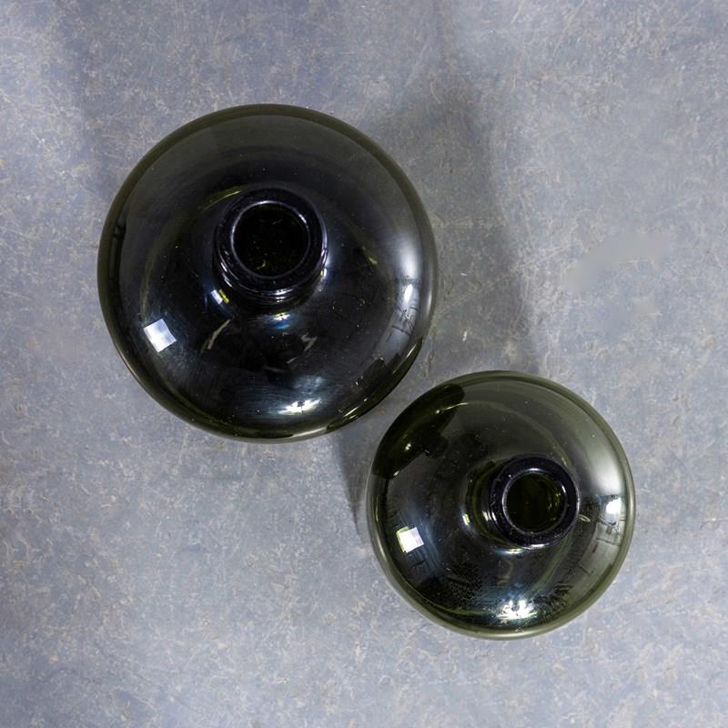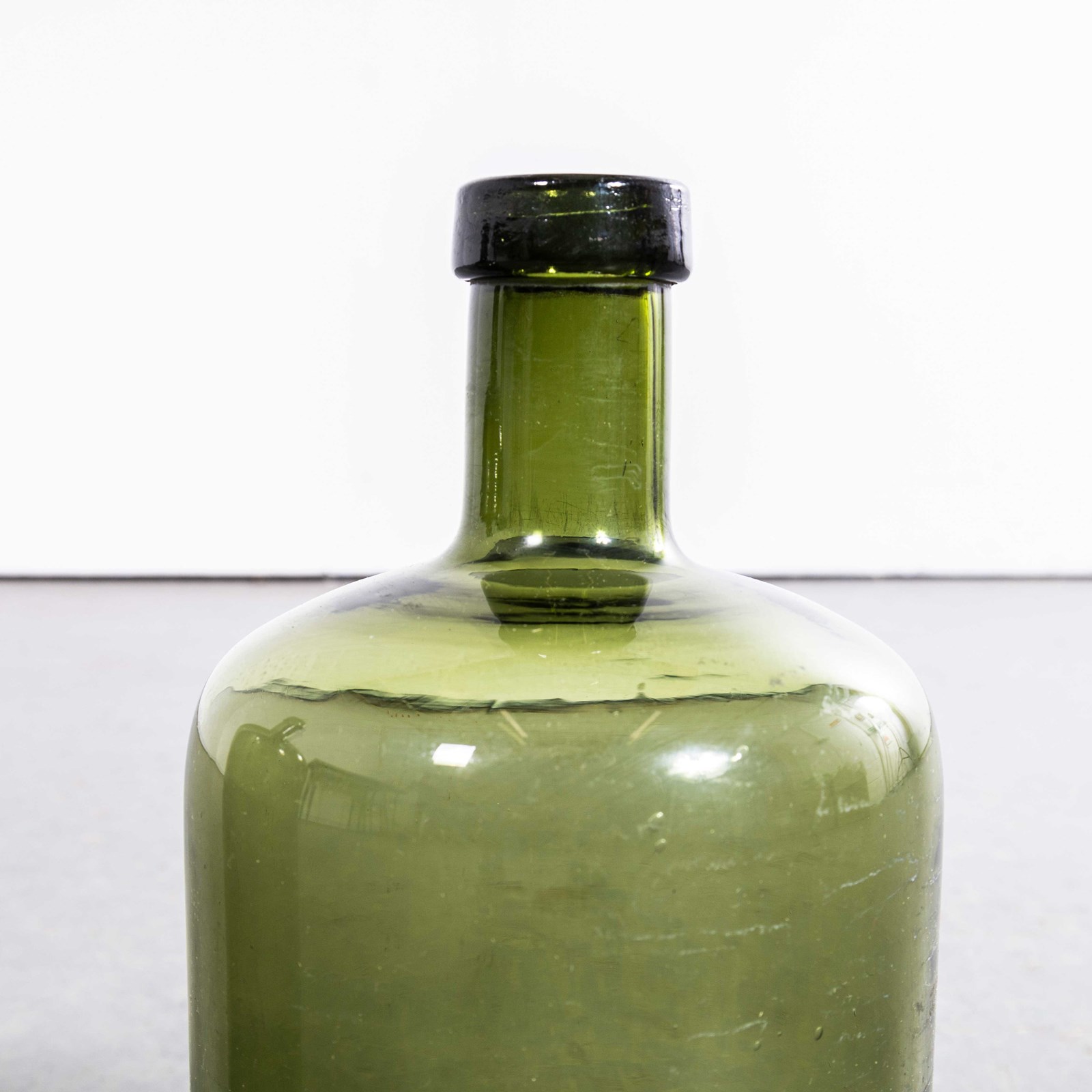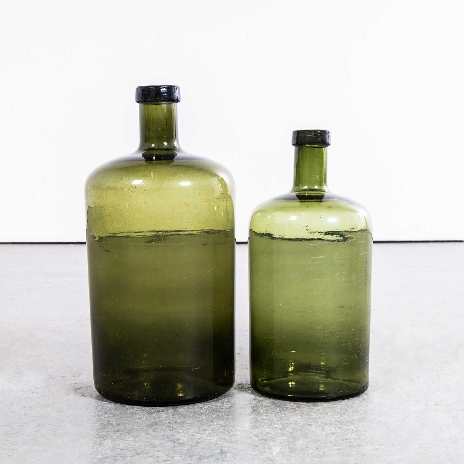 Vintage French Dark Green Glass Demijohns – Pair. A pair of mouth blown glass demijohns used as a traditional containers mainly for wine storage and transport. These demijohns have been carefully cleaned. Demijohn Dimensions. Smallest: L14 W14 H31, Largest: L17 W17 H36