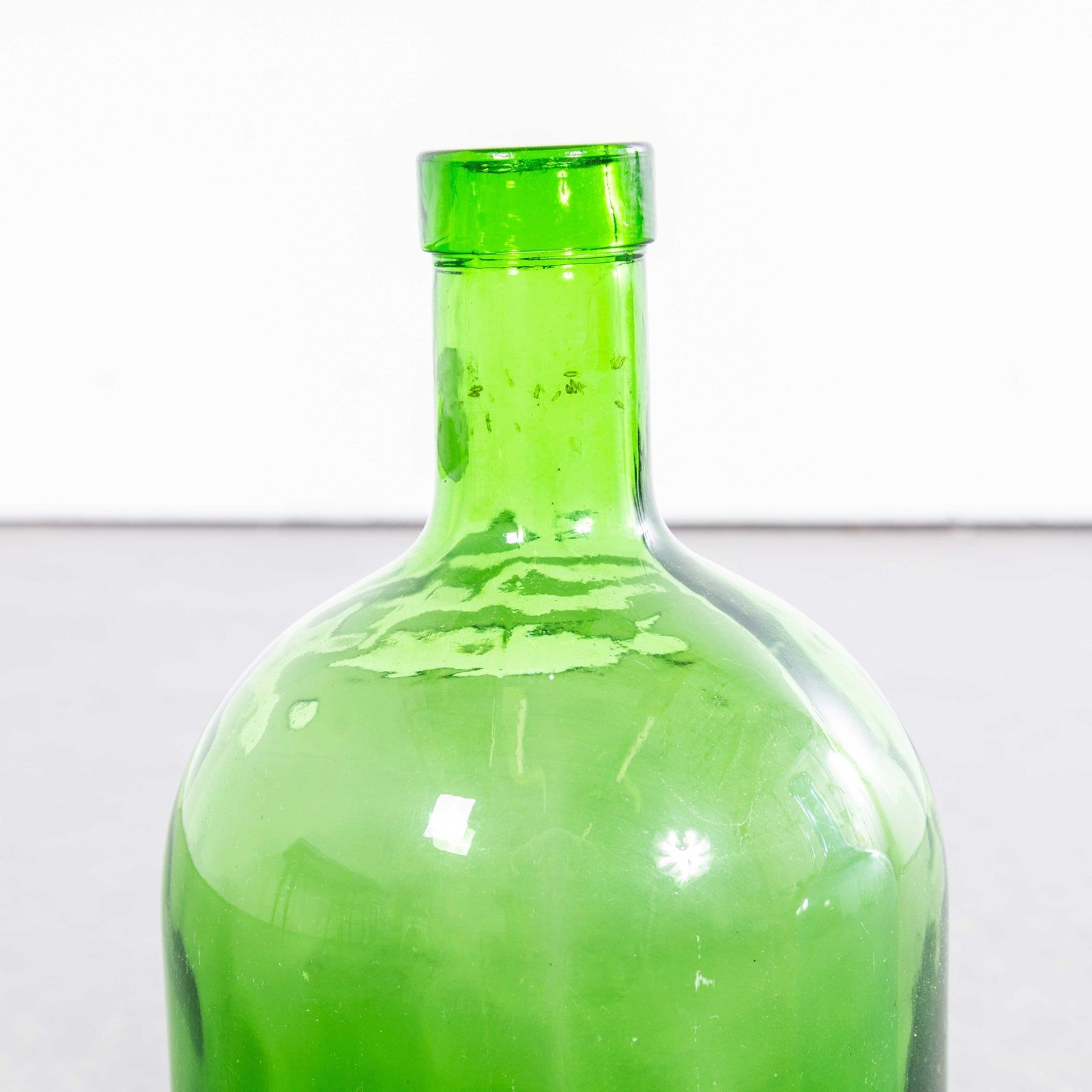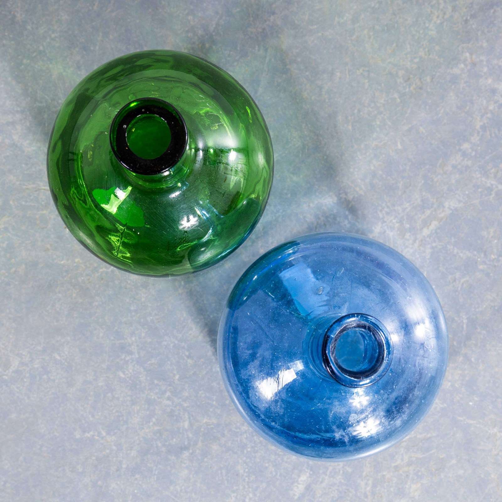 Vintage French Emerald Green & Cobalt Blue Glass Demijohns – Pair. A pair of mouth blown glass demijohns used as a traditional containers mainly for wine storage and transport. These demijohns have been carefully cleaned. Demijohn Dimensions: L15 W15 H32