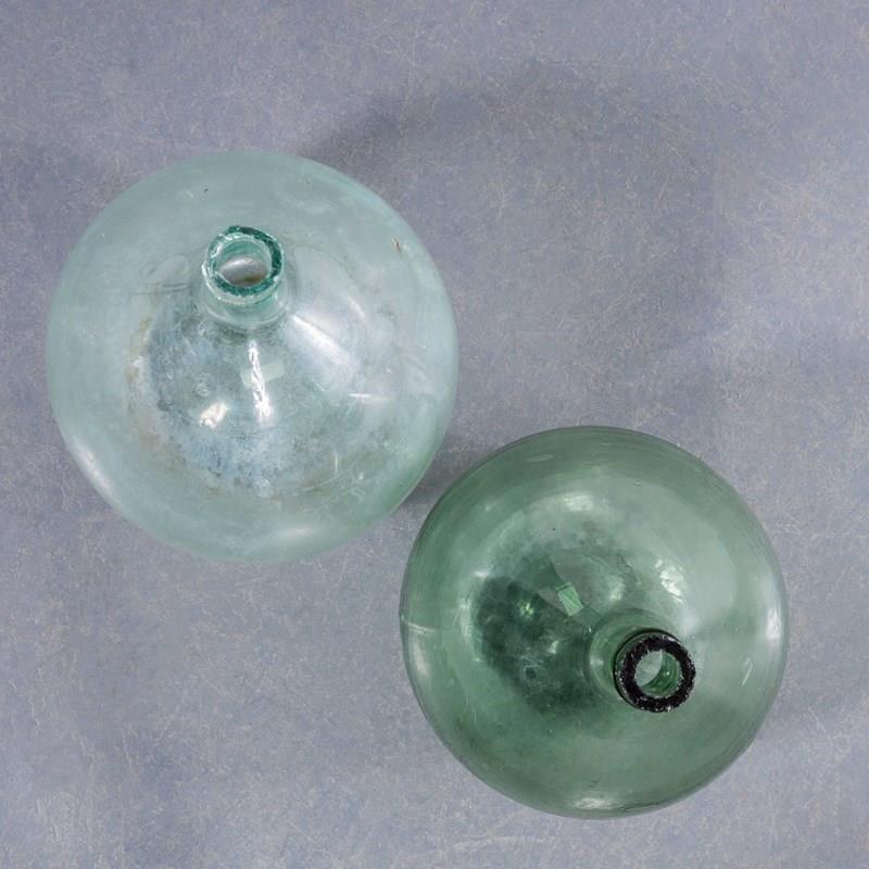 Vintage French Round Clear Blue & Green Glass Demijohns - Pair
