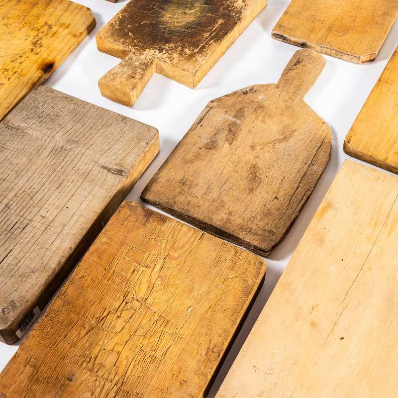 Sourced from Hungarian and Romanian street markets, crudely made and well used small chopping boards made mainly in beech and birch wood. Listing is for one randomly selected board.
