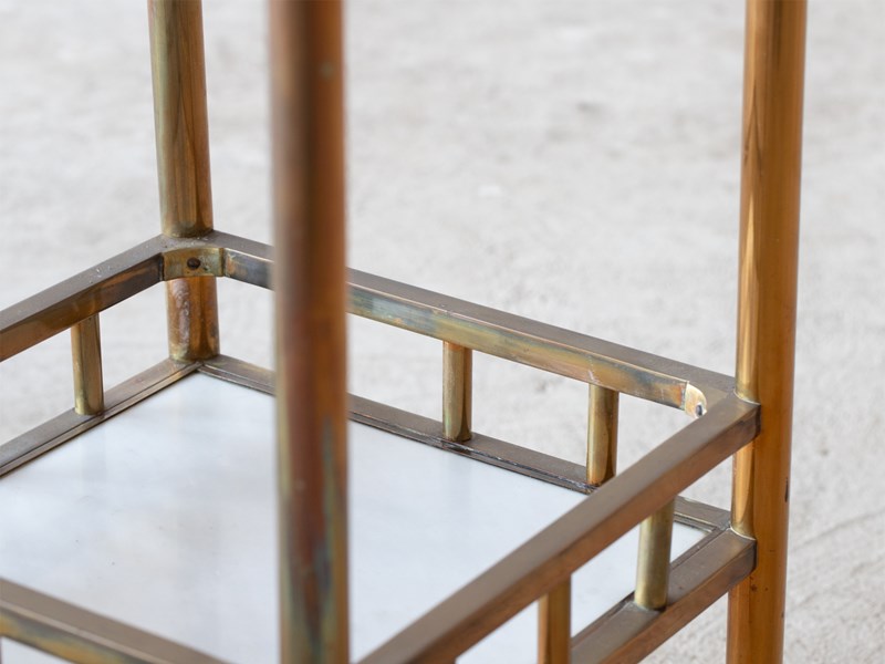 An Art Deco tiered marble and bronze side table on ceramic castors. French, c. 1920s.