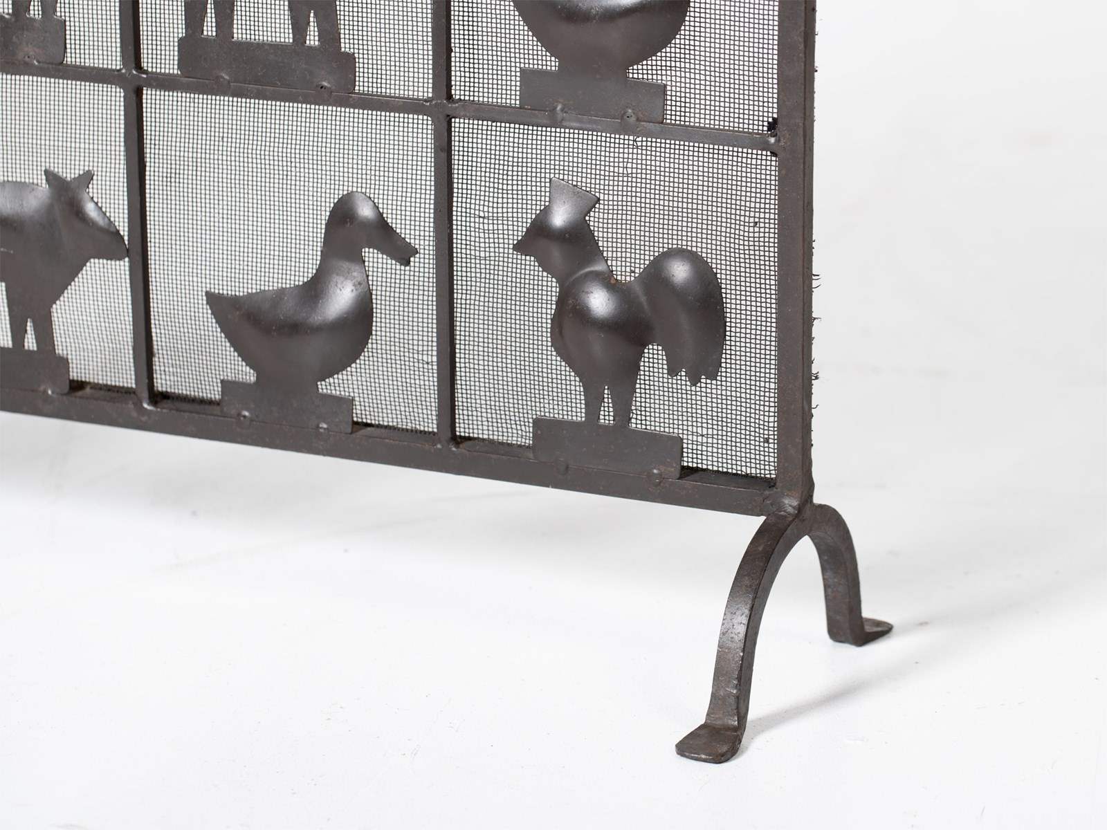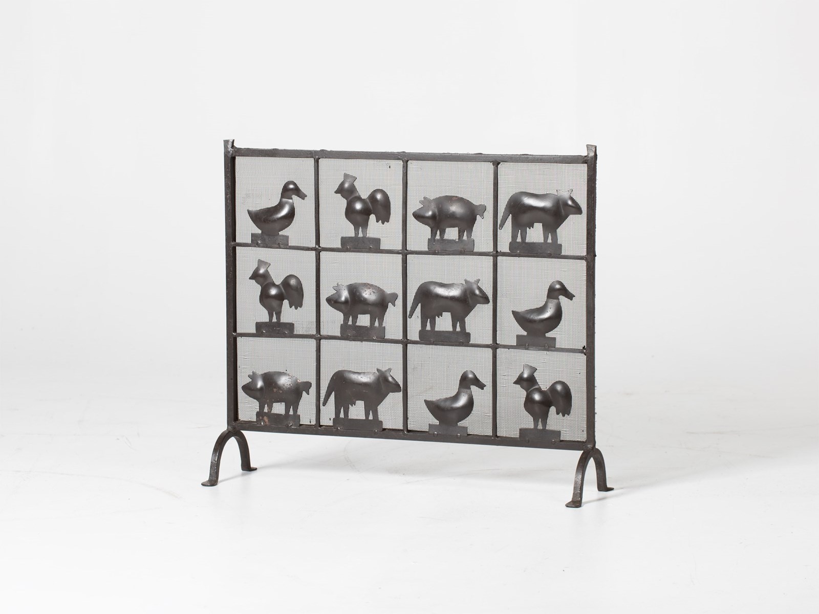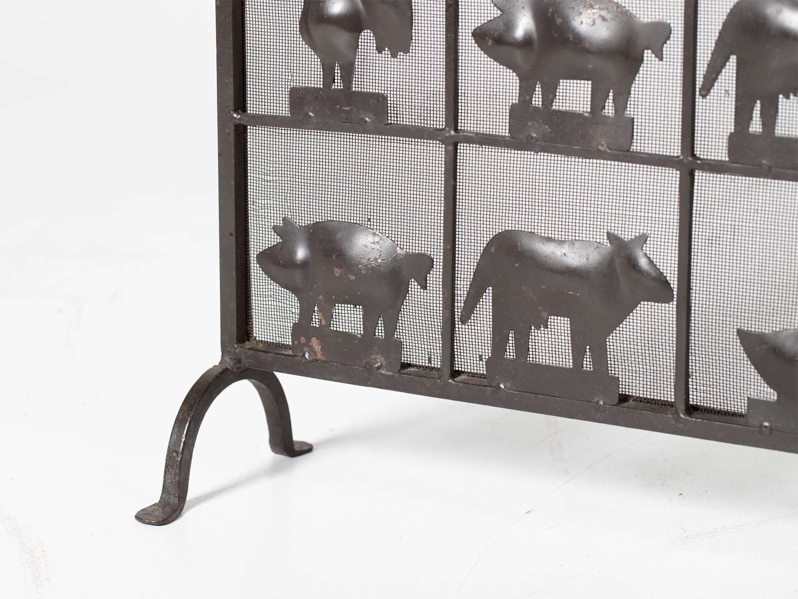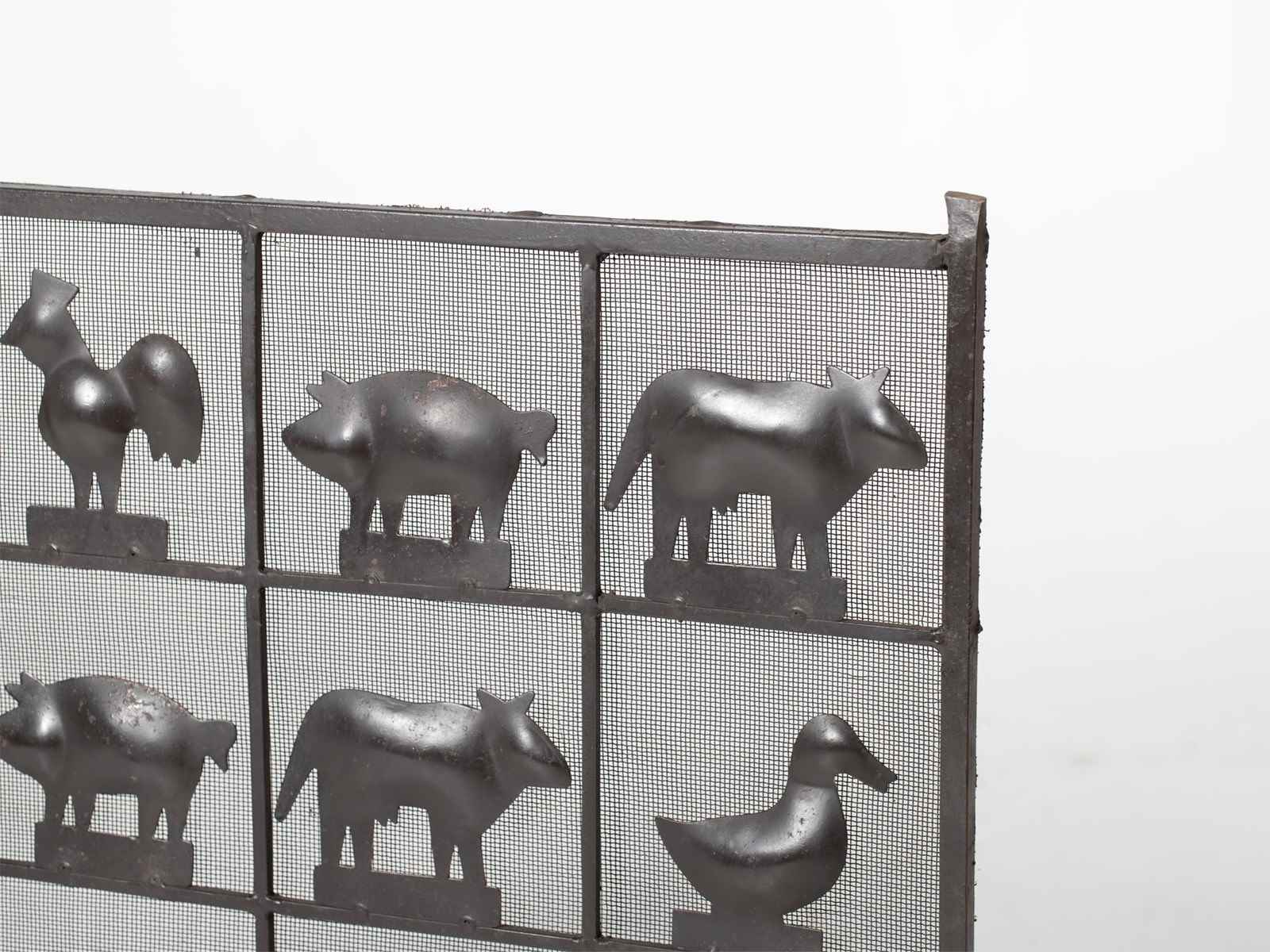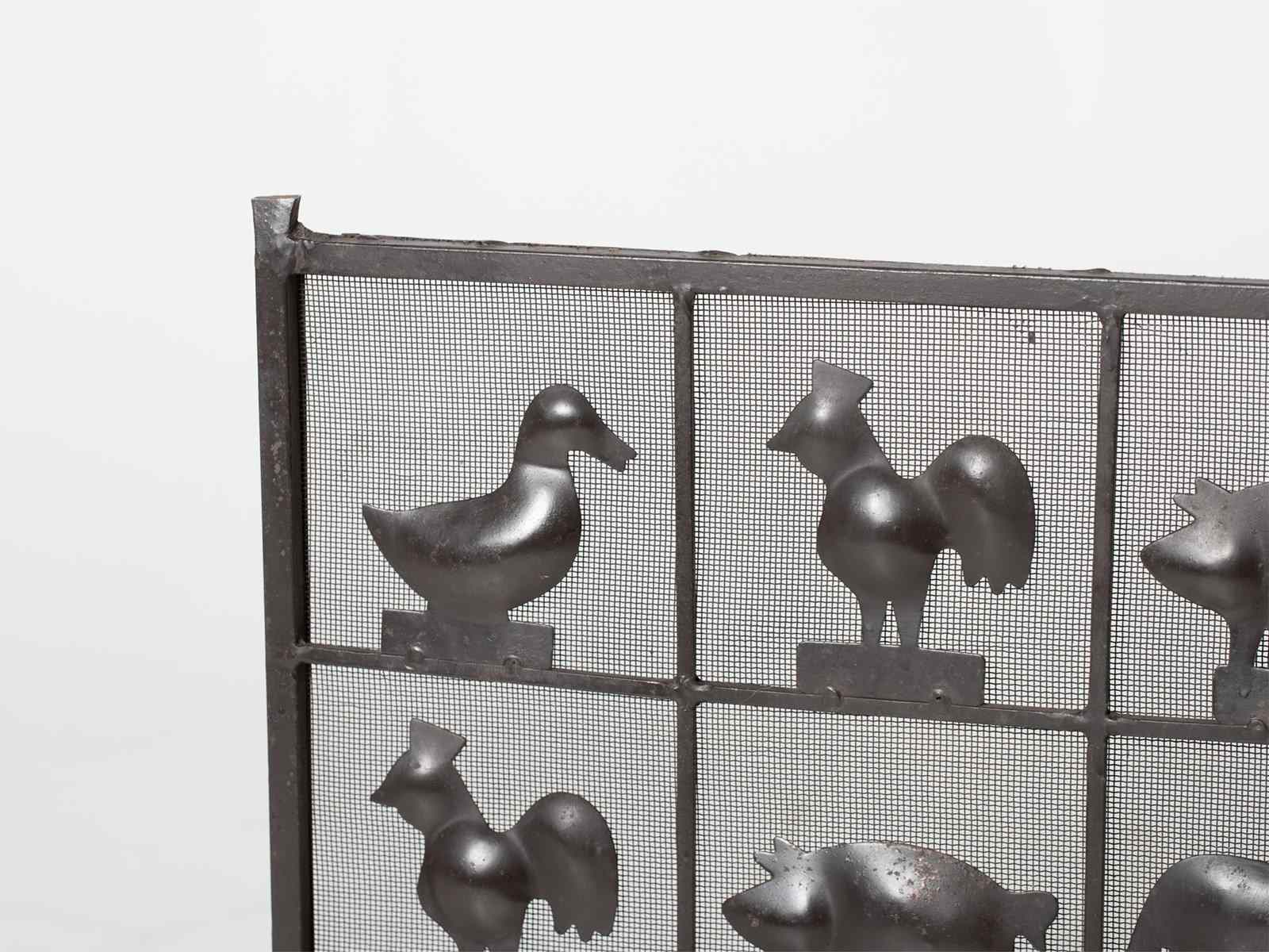 A wrought iron and mesh fire screen attributed to Atelier Marolles. French, c. 1950s.