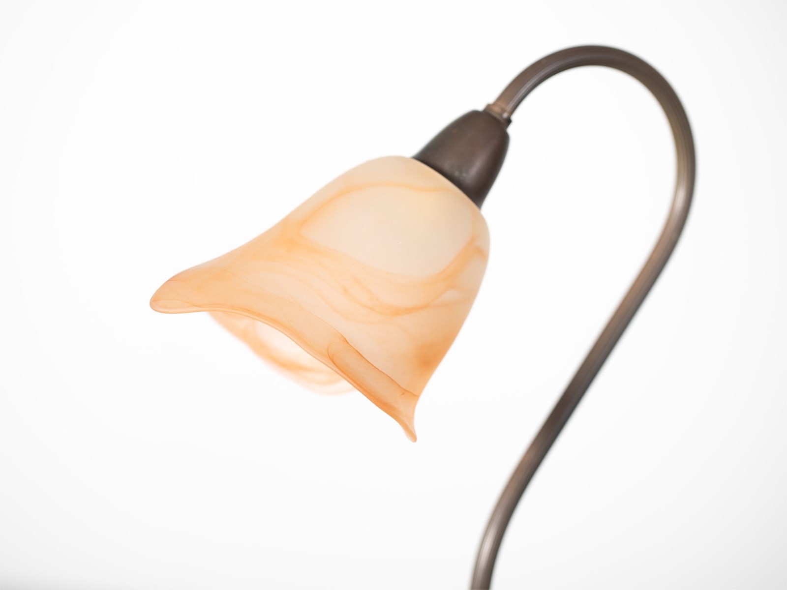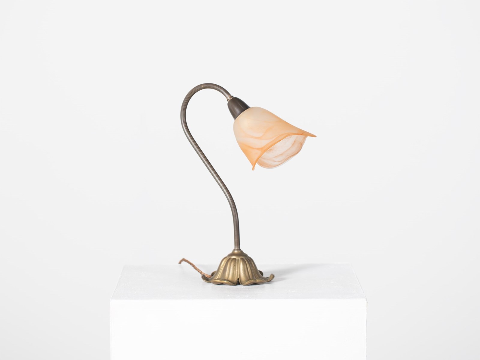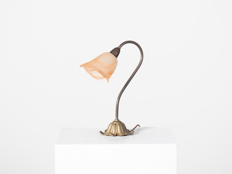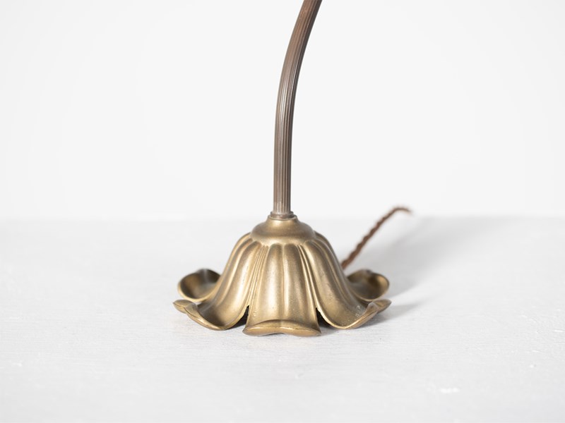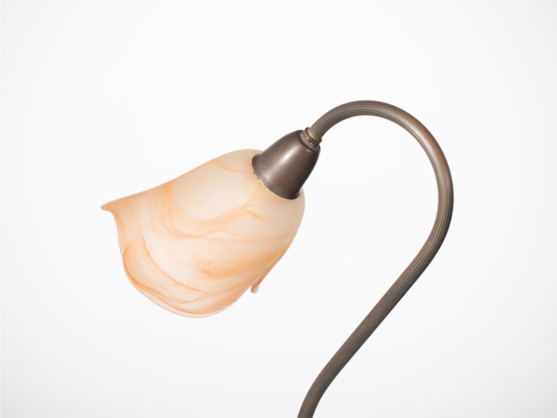 A patinated brass swan neck table lamp with frosted glass shade in the Art Nouveau taste. French, mid 20C.