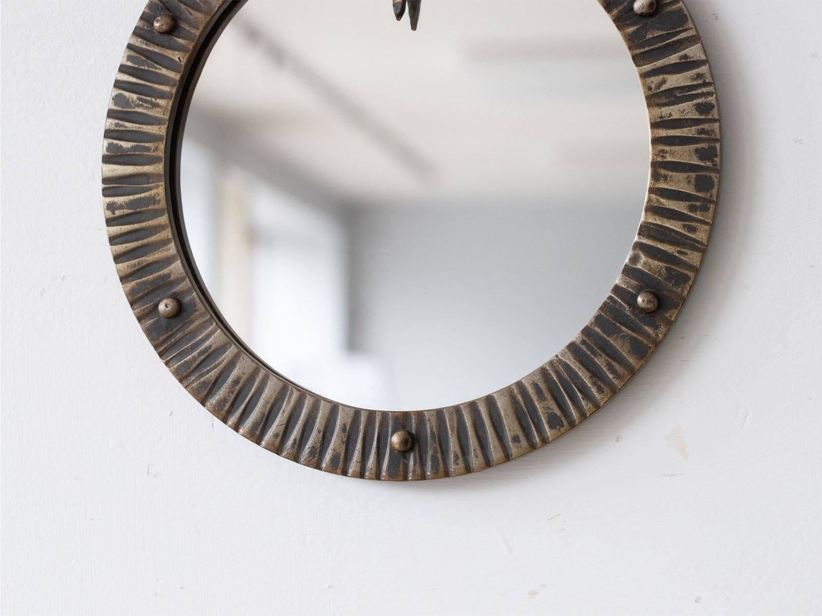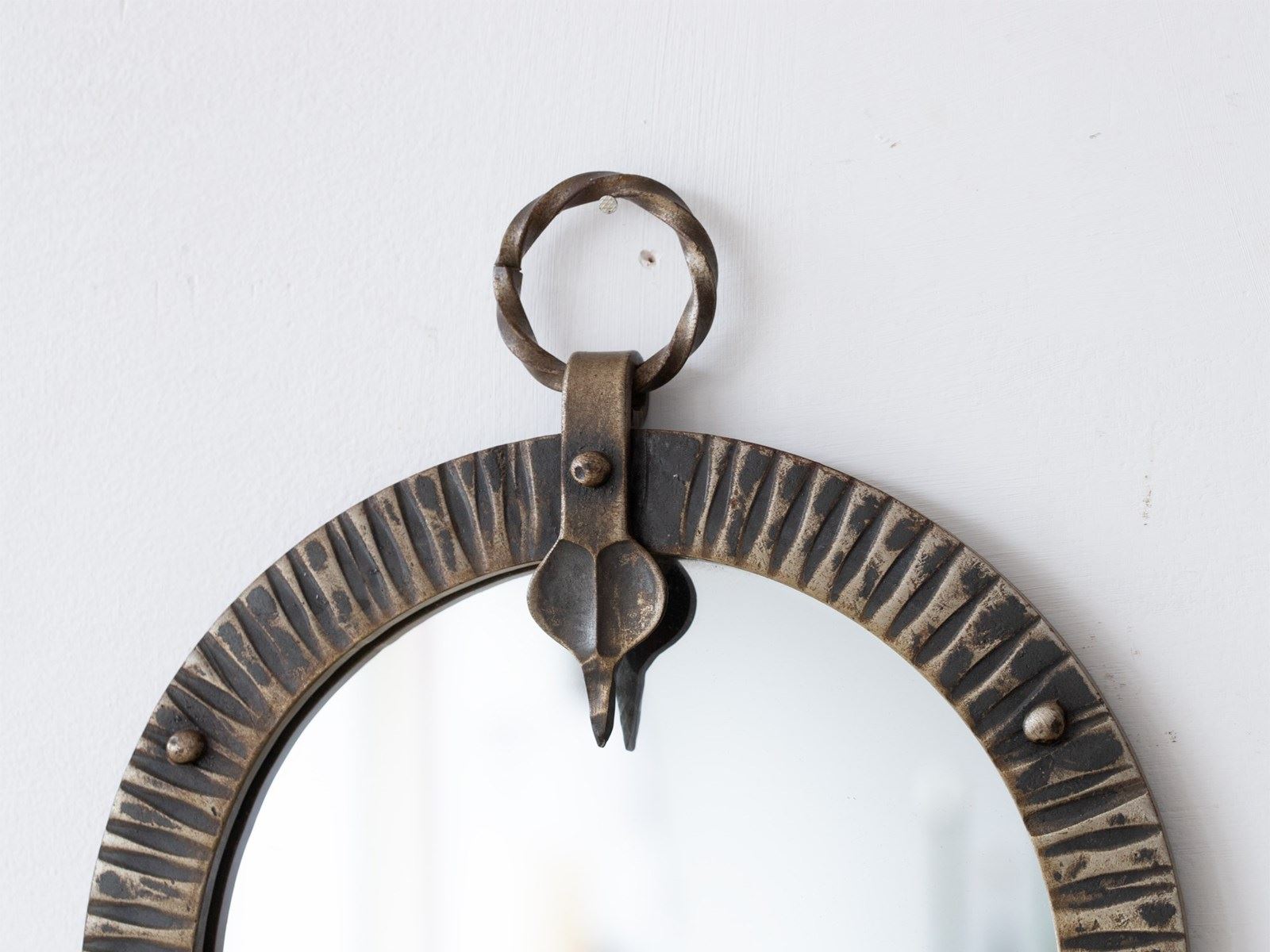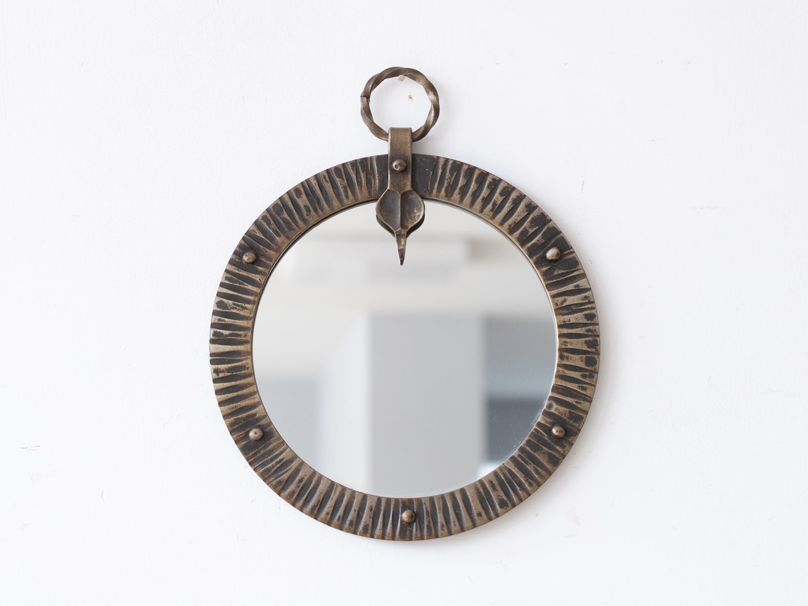 A brutalist forged steel mirror. French, c. 1950s.