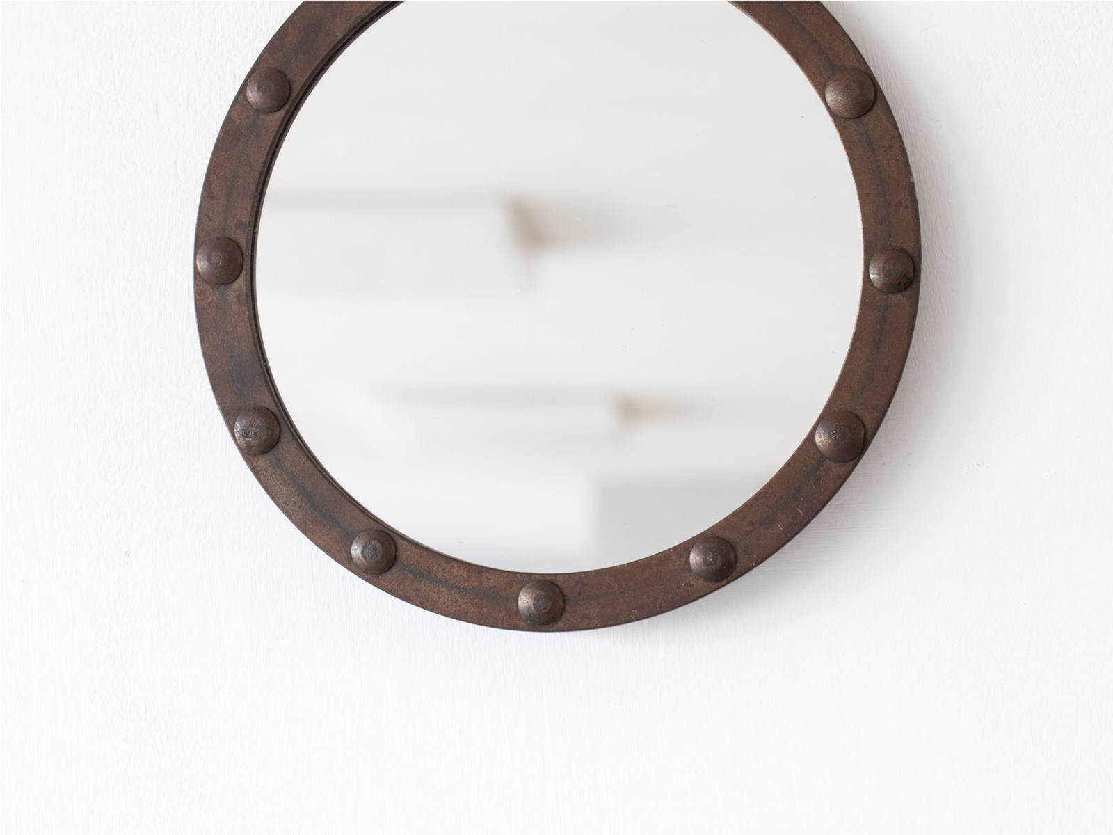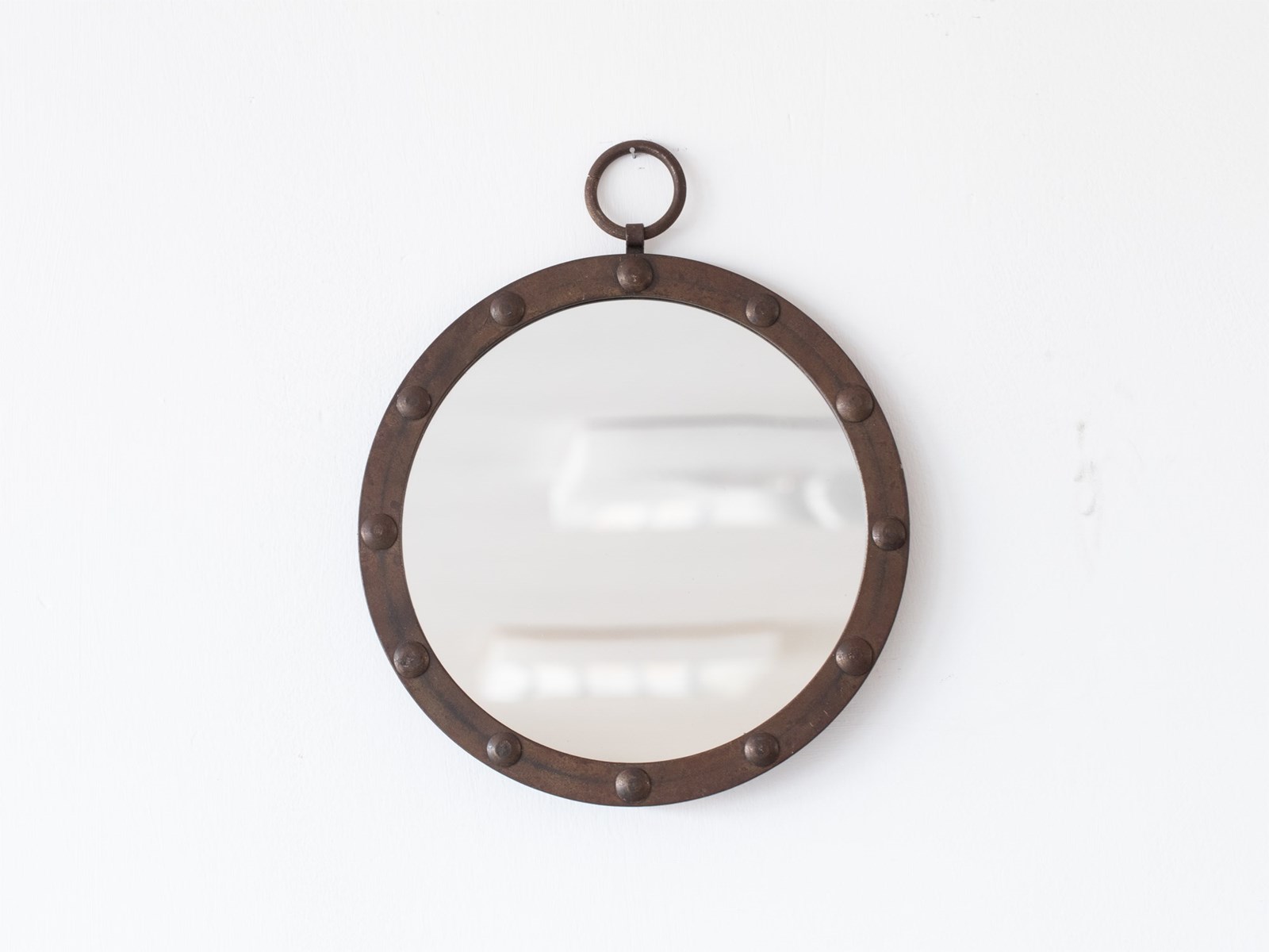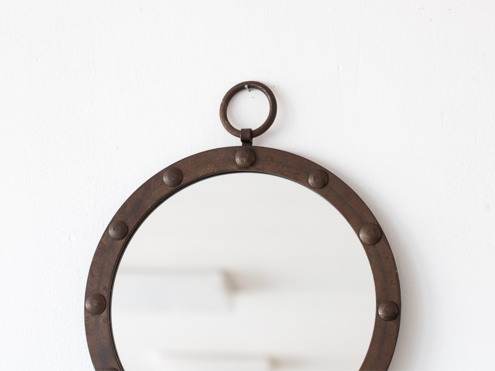 A circular brutalist iron mirror with hanging ring. French, mid 20C.