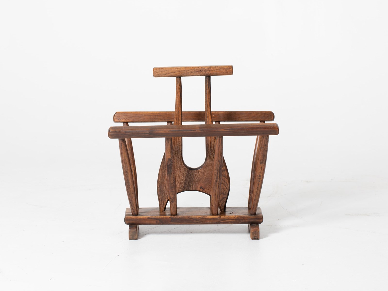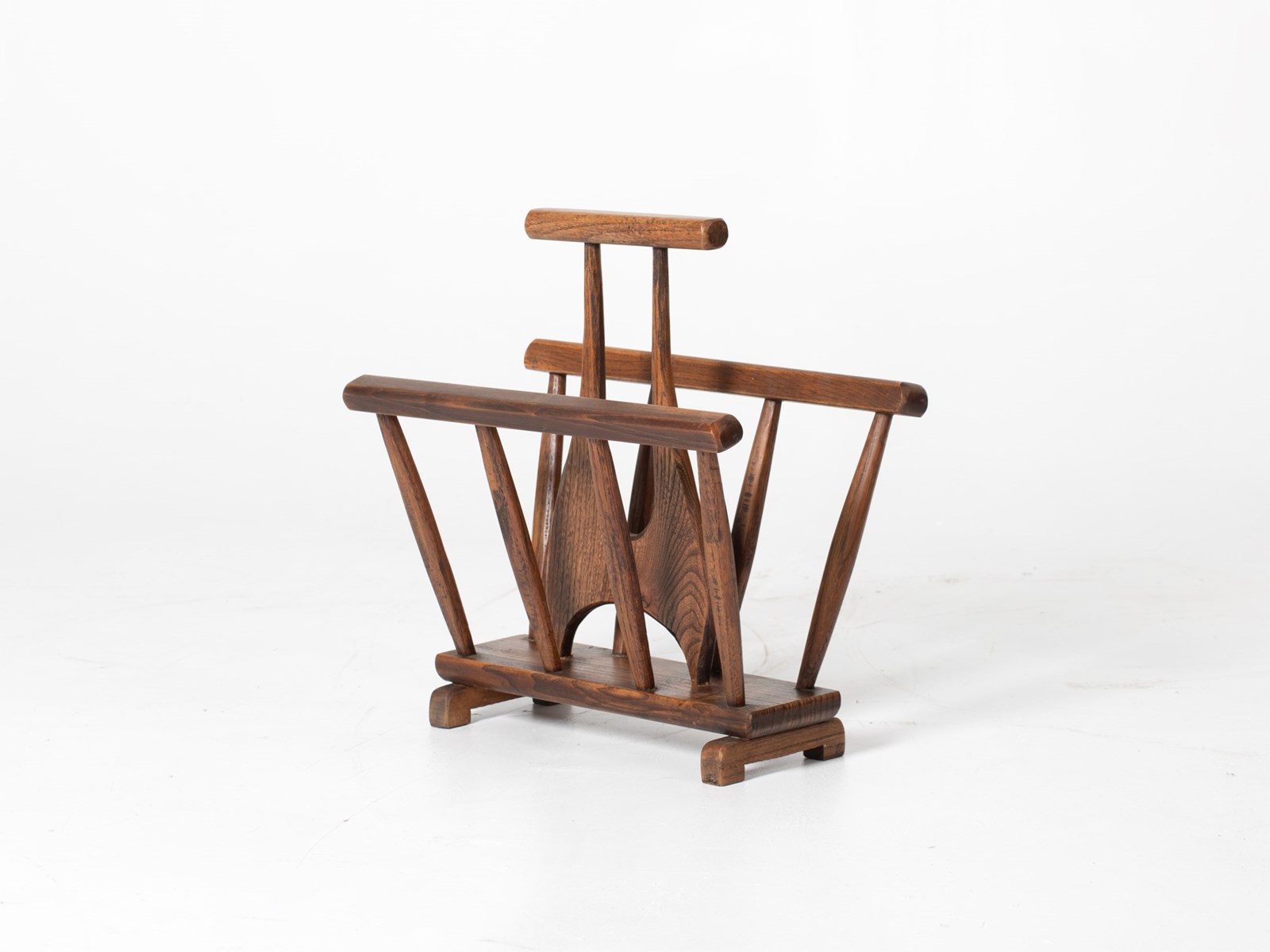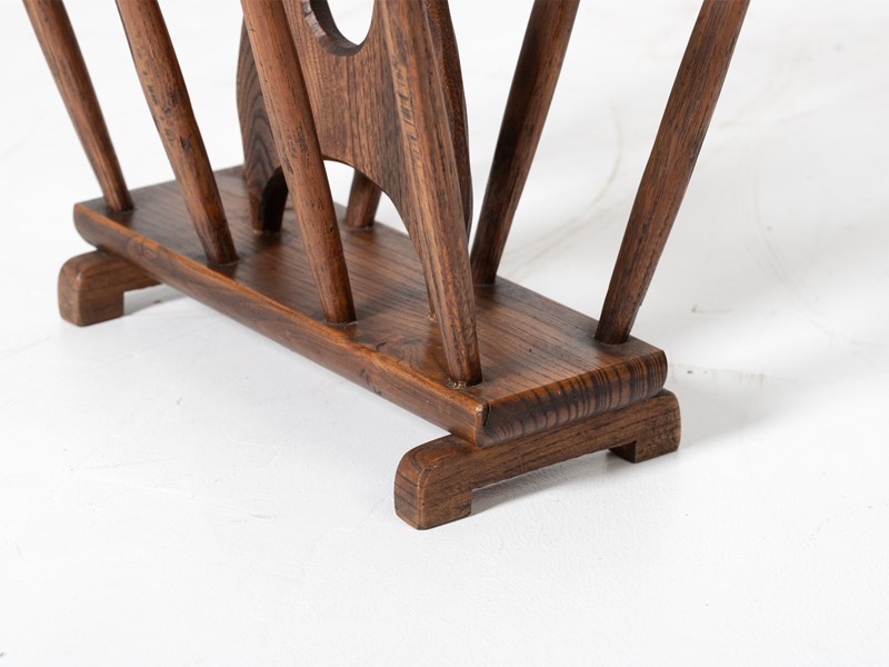A brutalist oak magazine rack. French, mid 20C.
