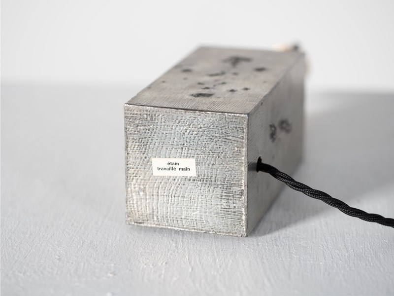 A brutalist pewter-clad table lamp. French, c. 1970s.