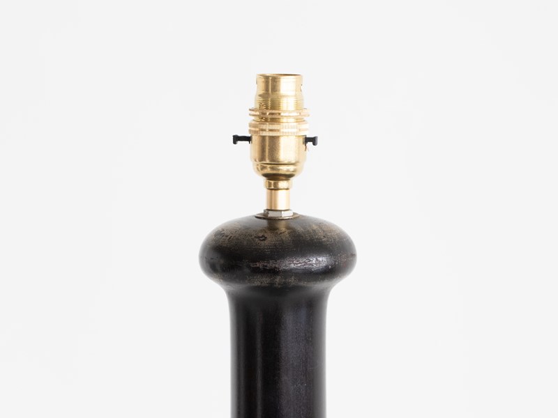 Worn finish to the base. Professionally rewired to UK standards. New tapered calico shade included.
