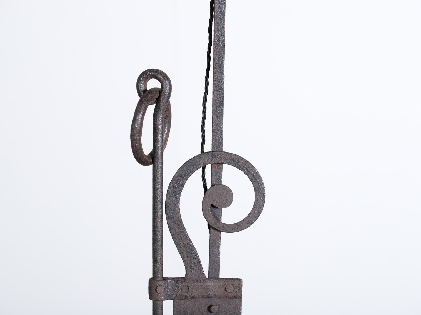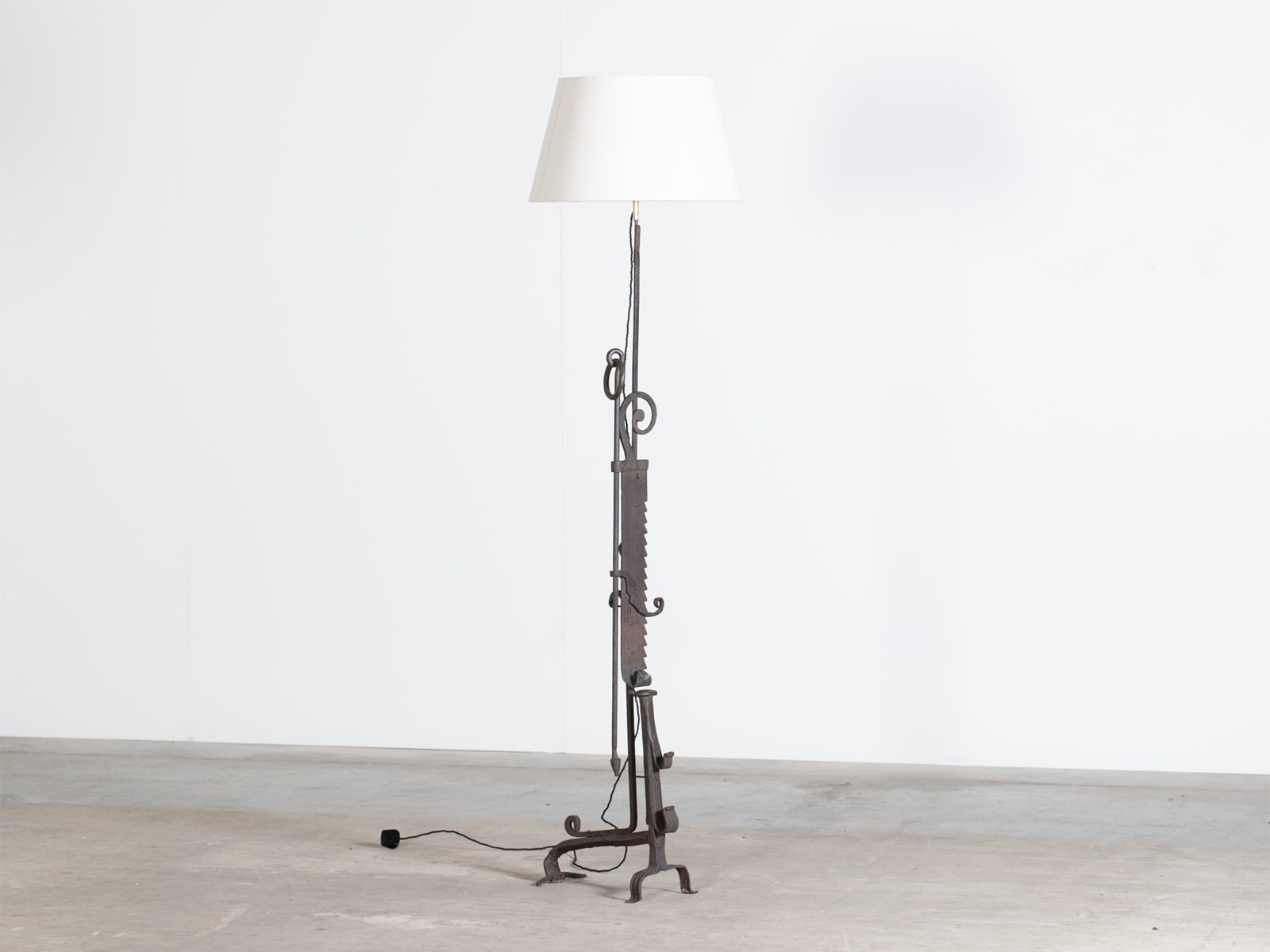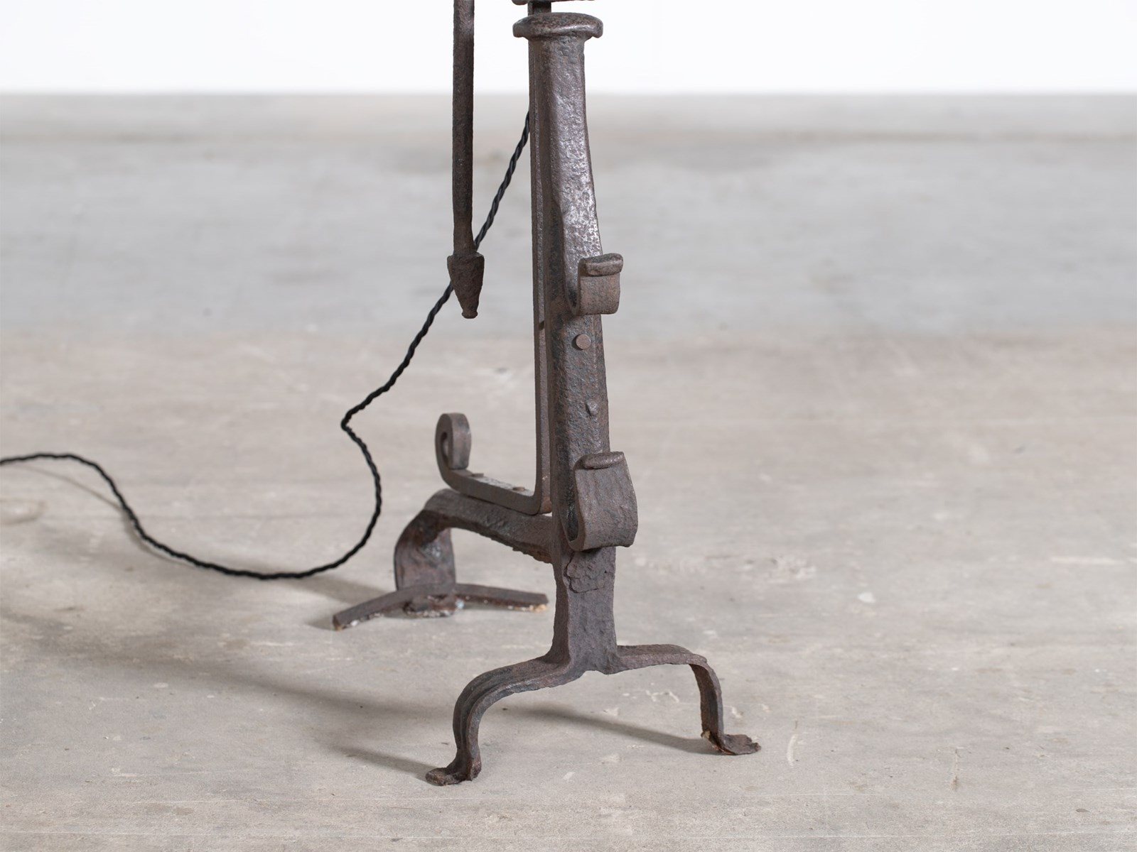 A folk art floor lamp comprised of antique iron fireplace trammel and firedog, early 20C.