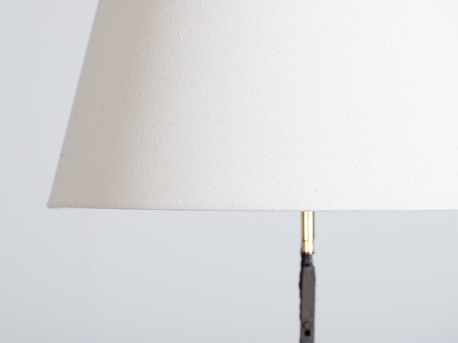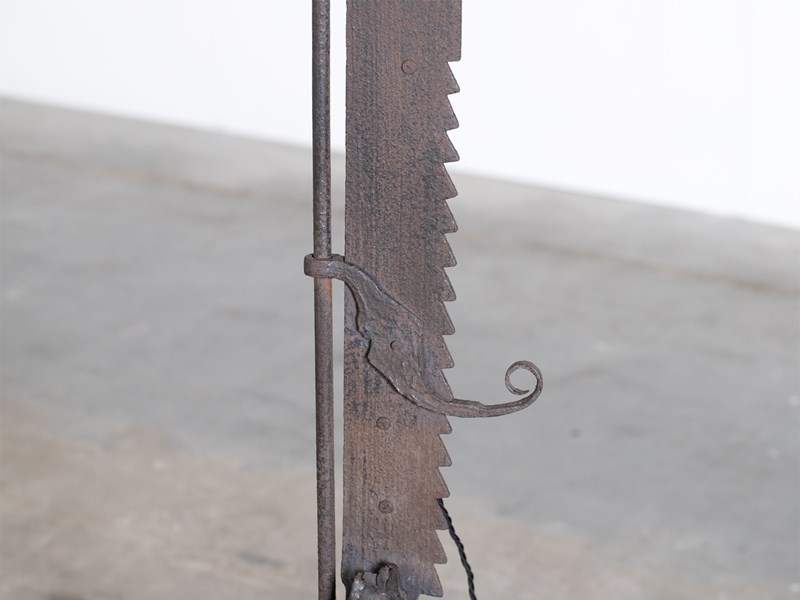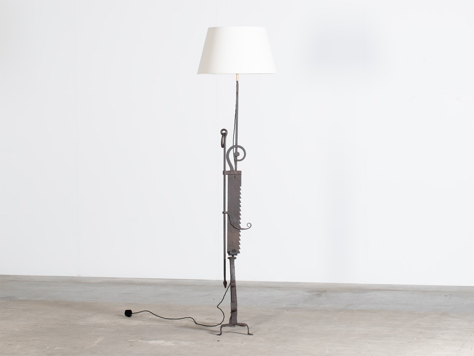 A folk art floor lamp comprised of antique iron fireplace trammel and firedog, early 20C.