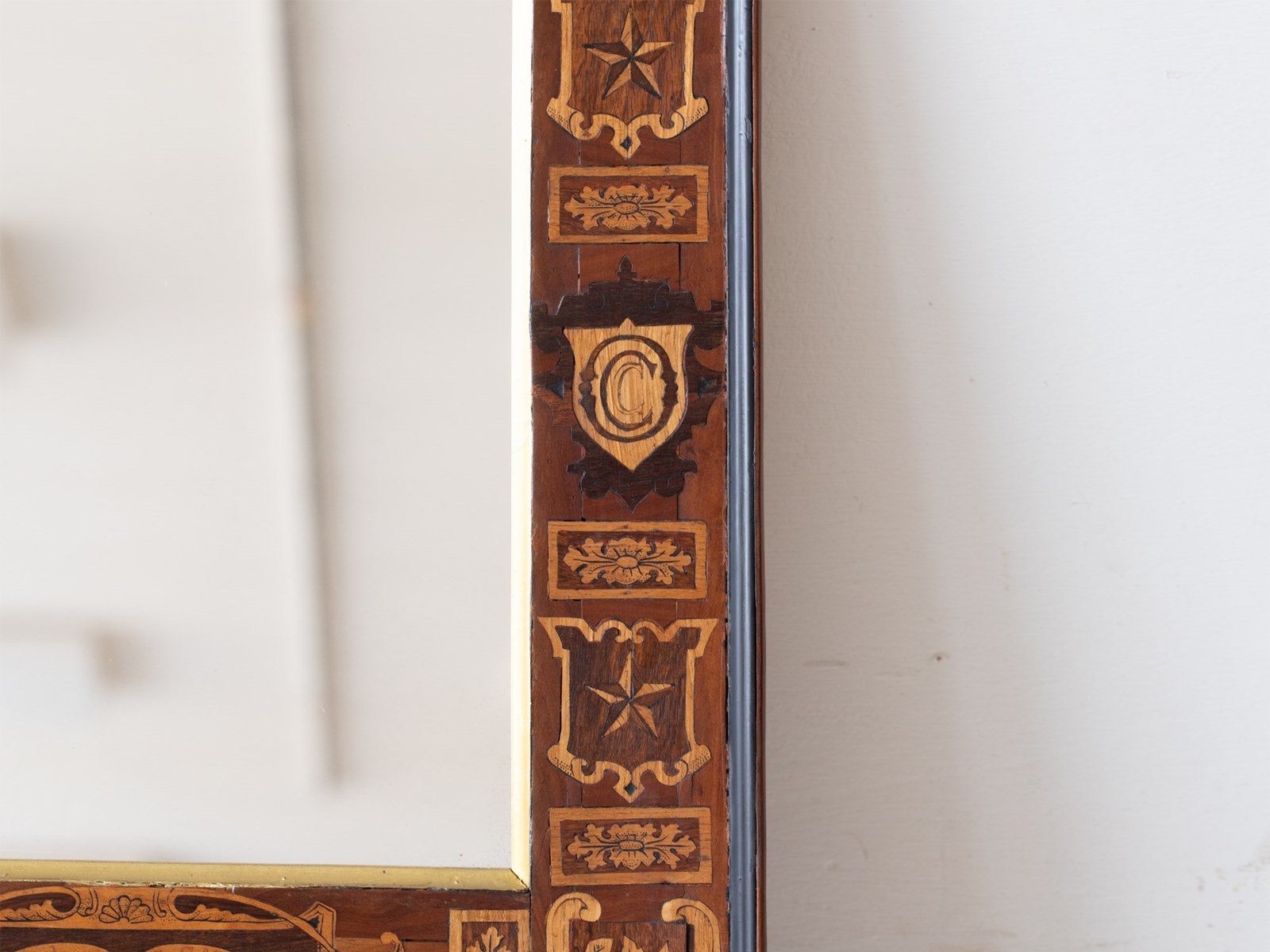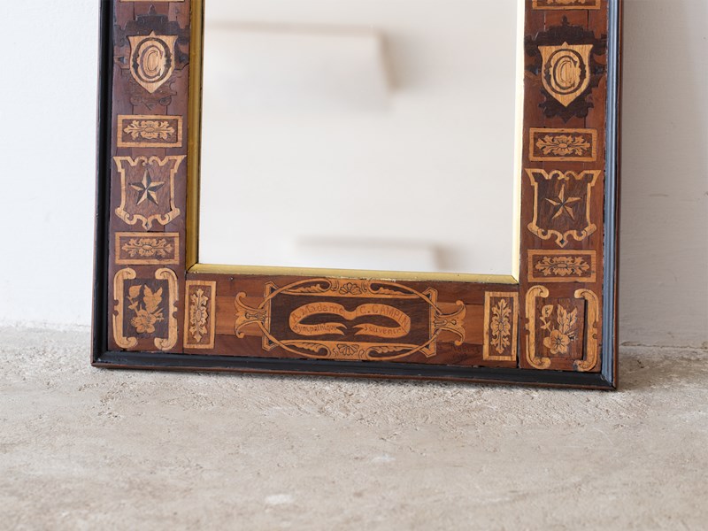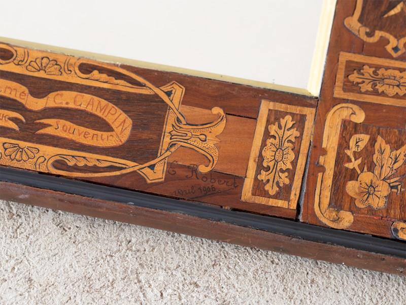 A decorative marquetry marriage mirror signed E. Robert. French, c. 1906.