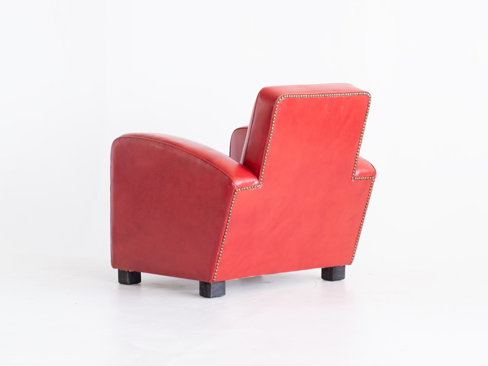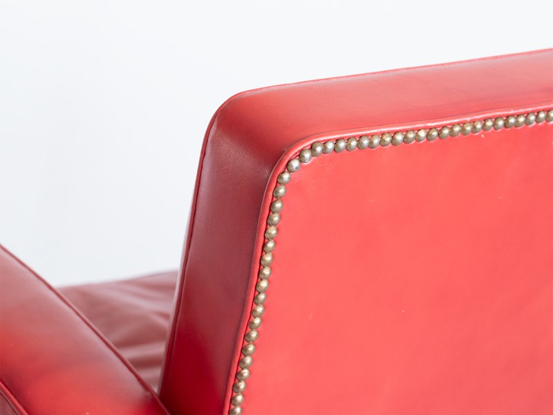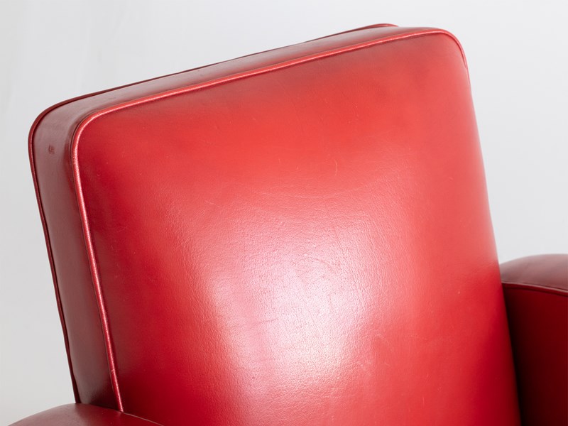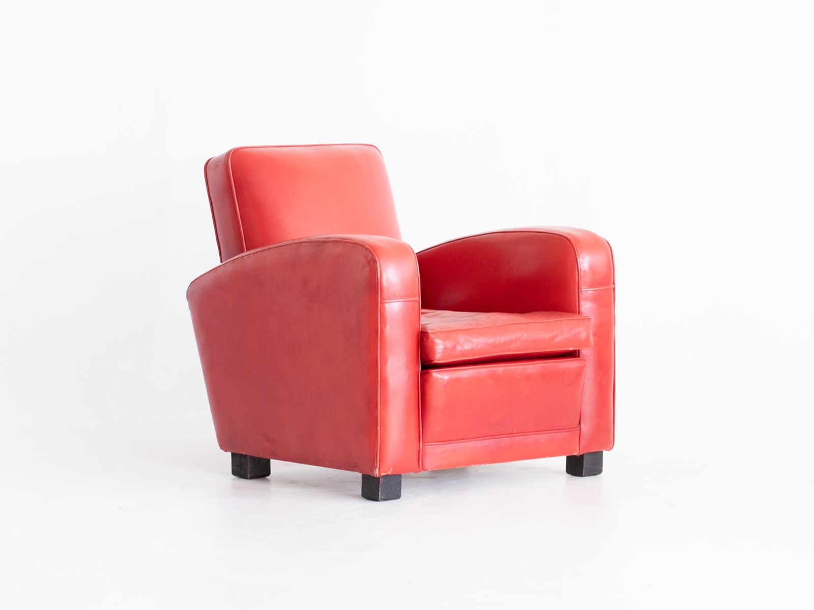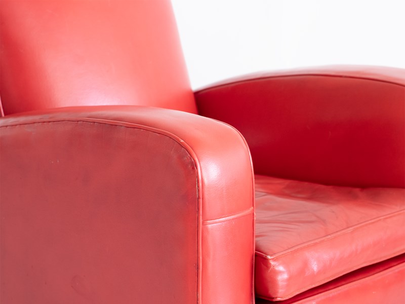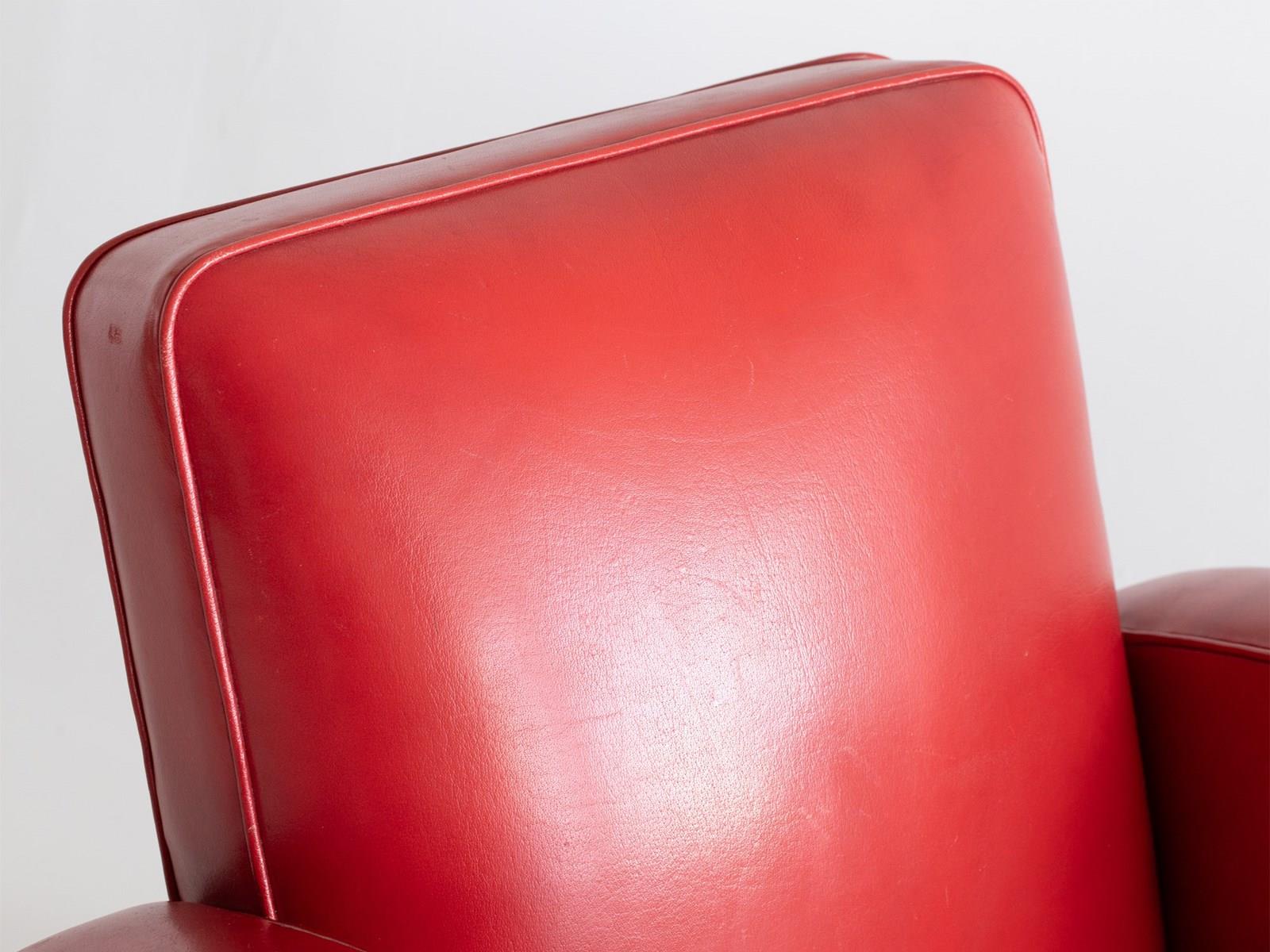A club armchair with red leatherette upholstery. French, c. 1950s.