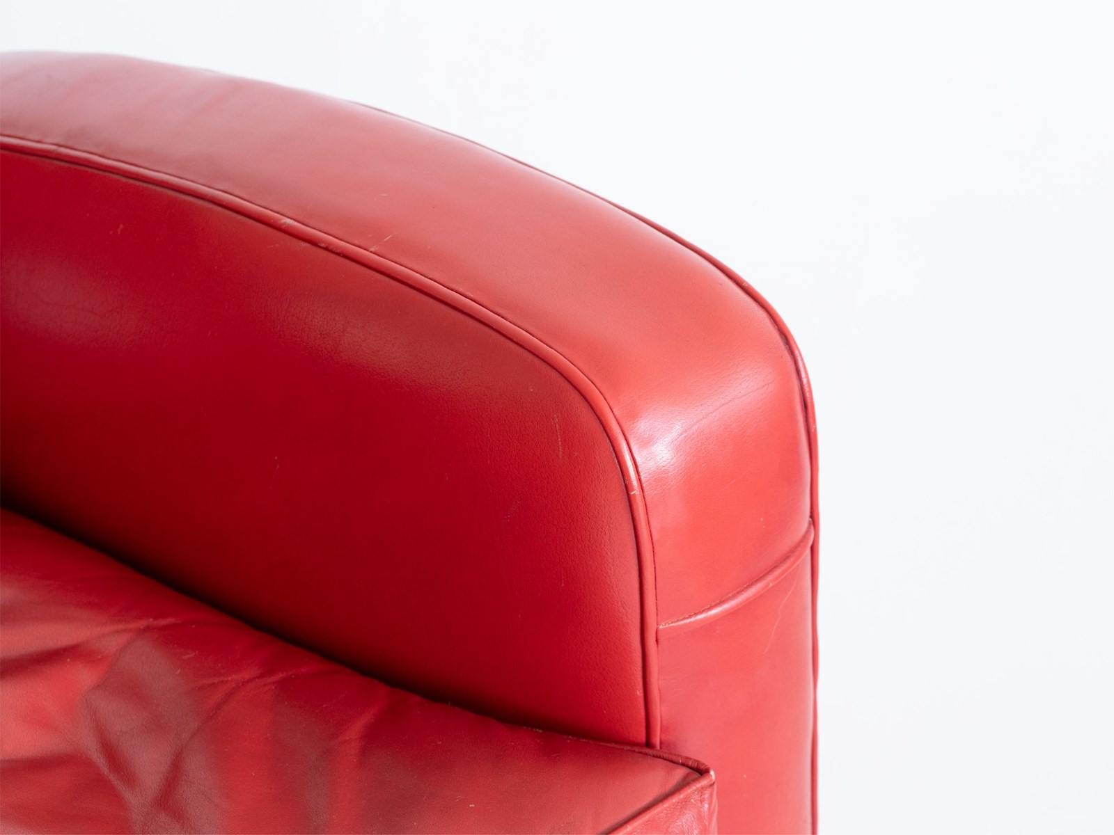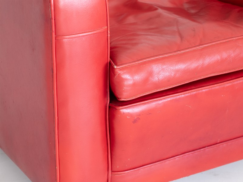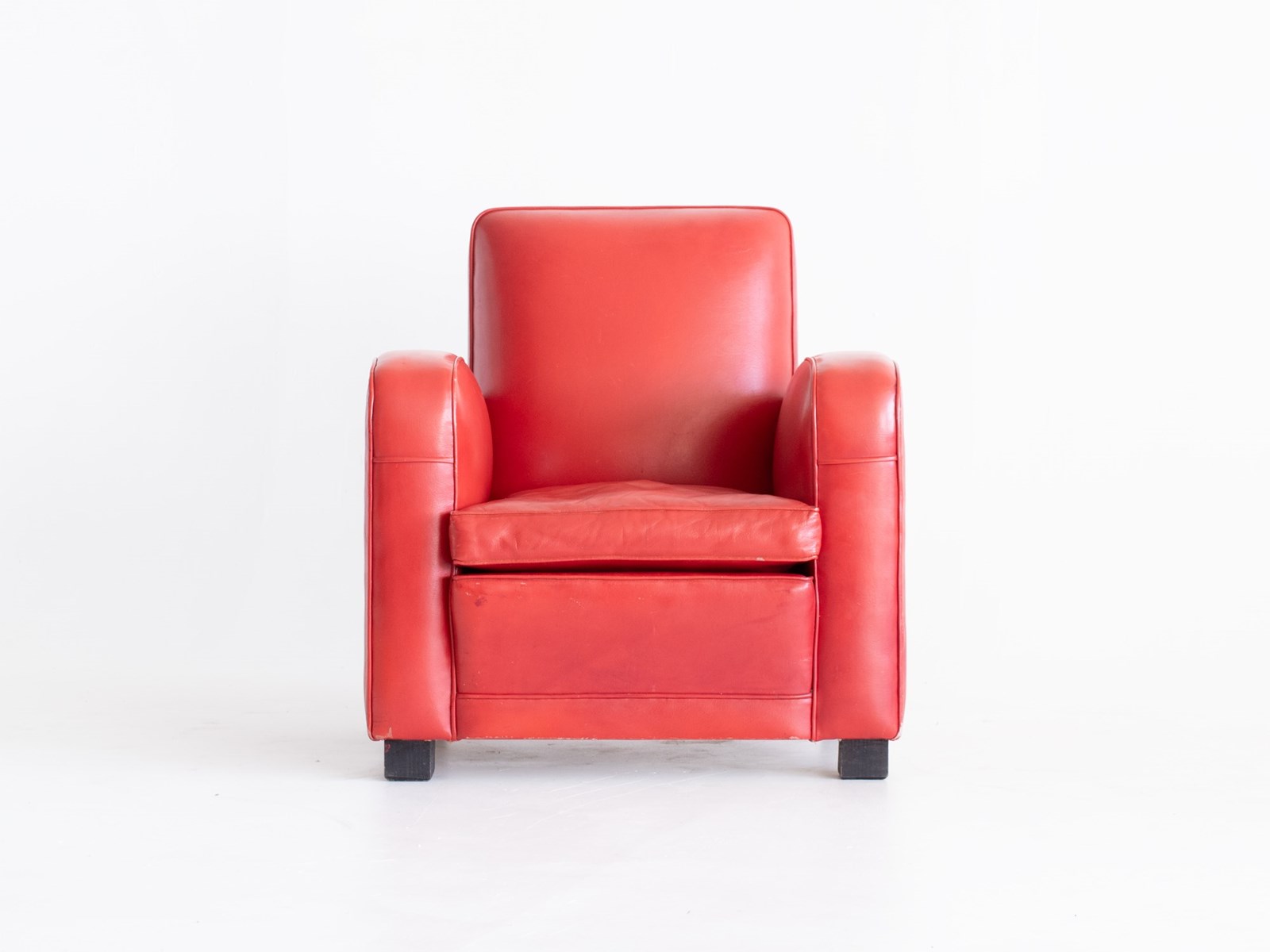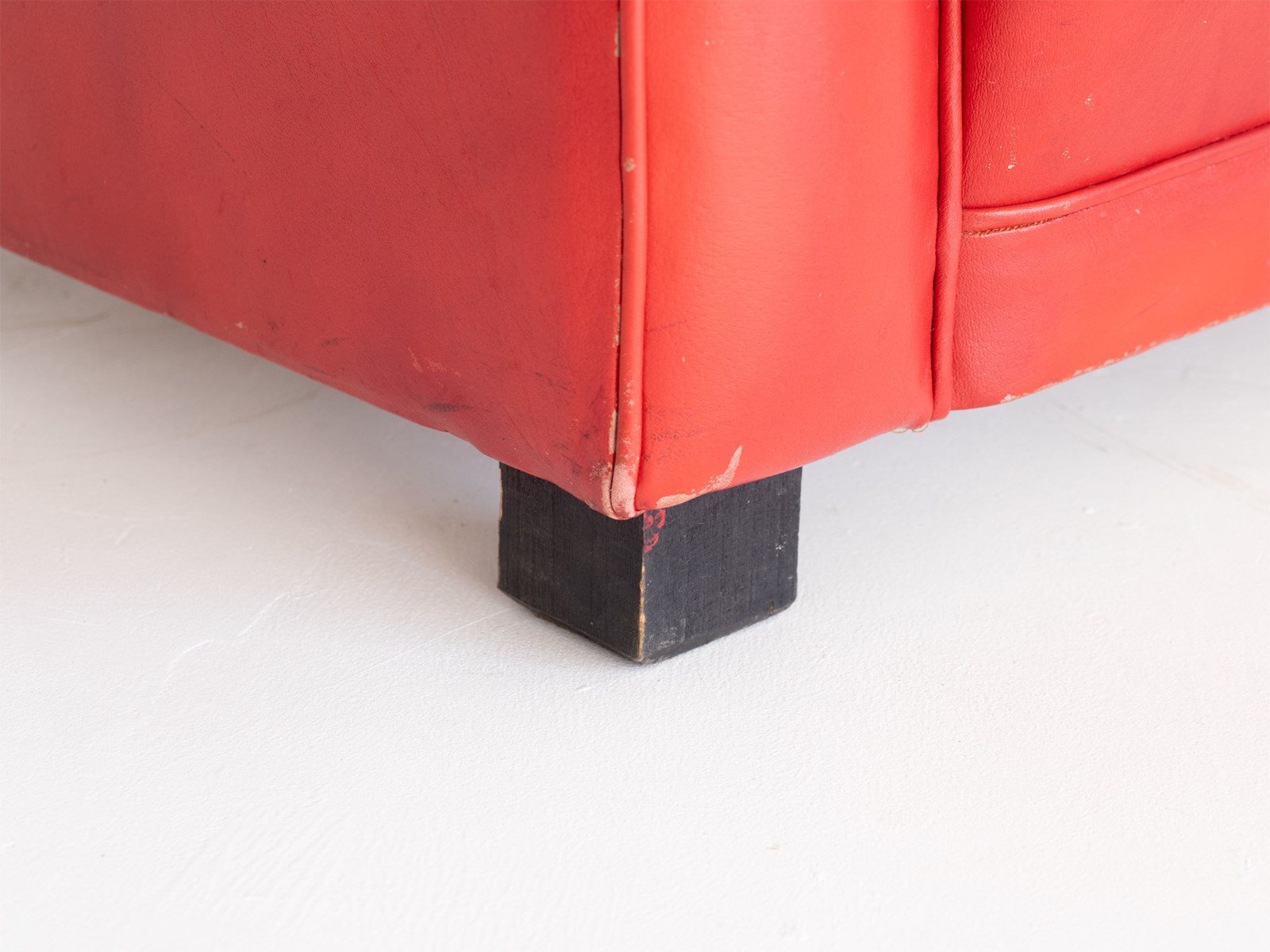 A club armchair with red leatherette upholstery. French, c. 1950s.