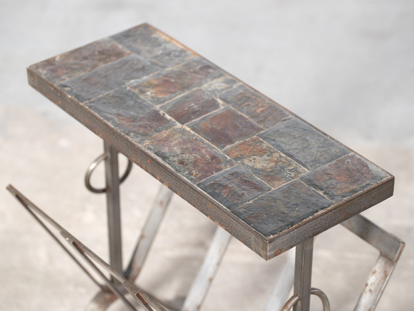 A slate and iron magazine rack with integrated table attributed to Jean-Pierre Ryckeart. French, mid 20C.