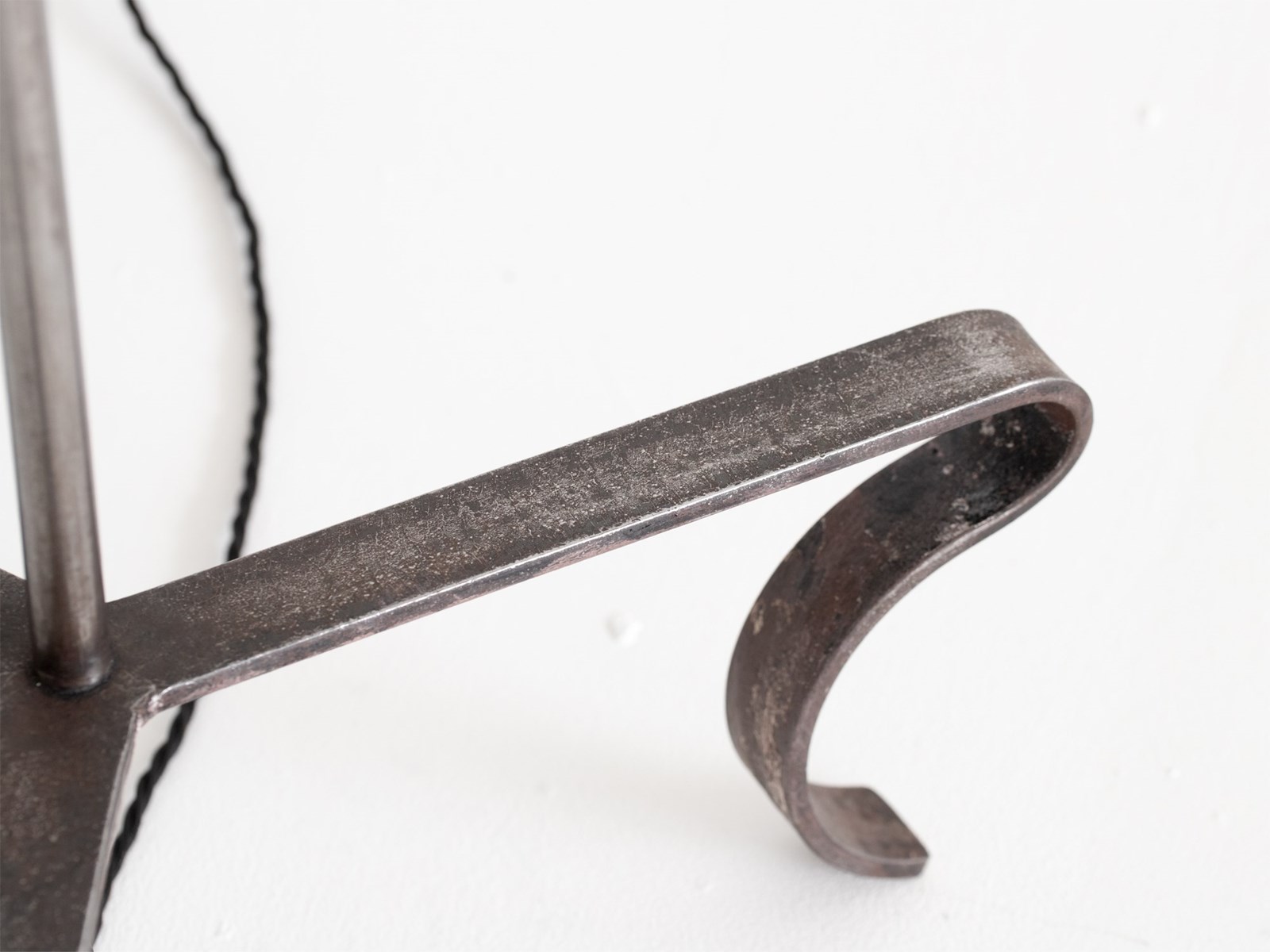 A steel floor lamp with shapely tripod base. French, mid 20C.