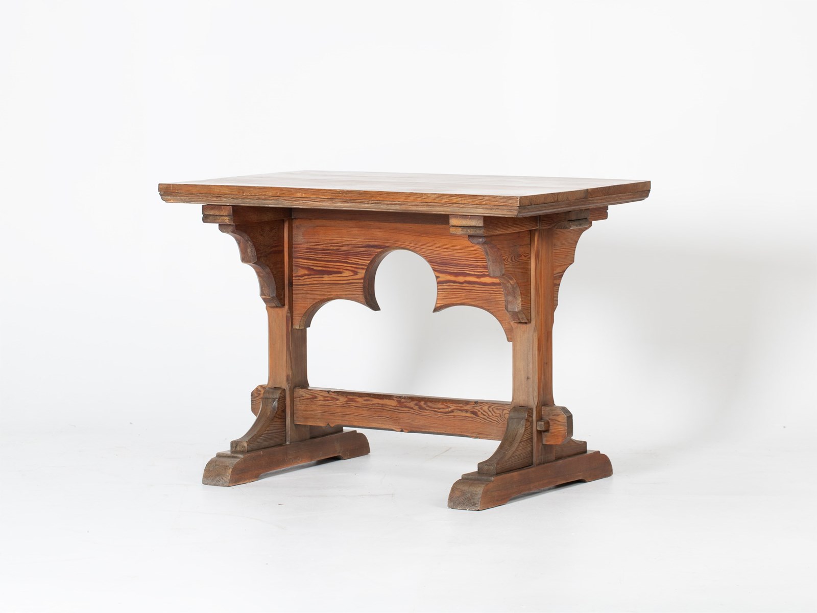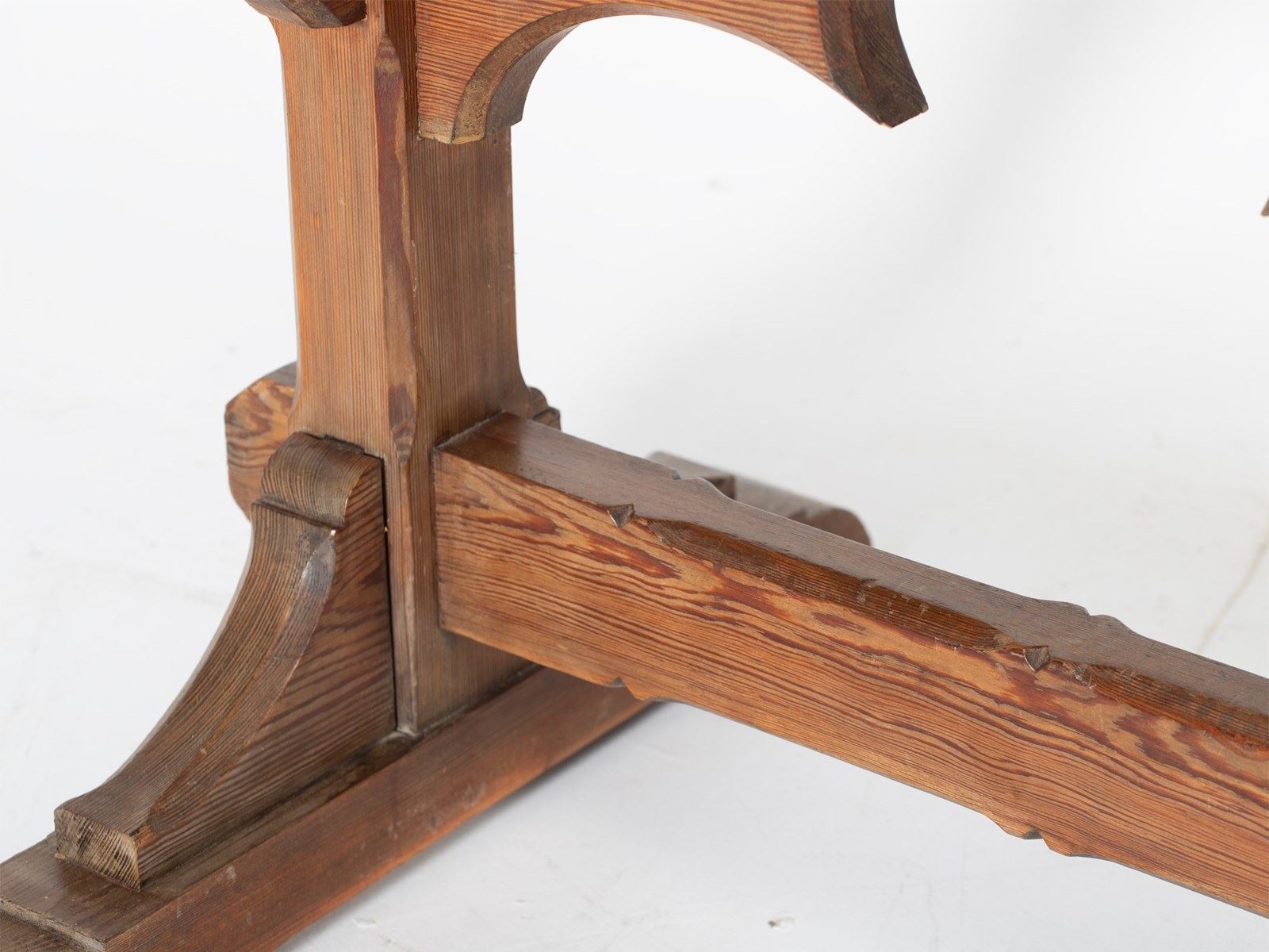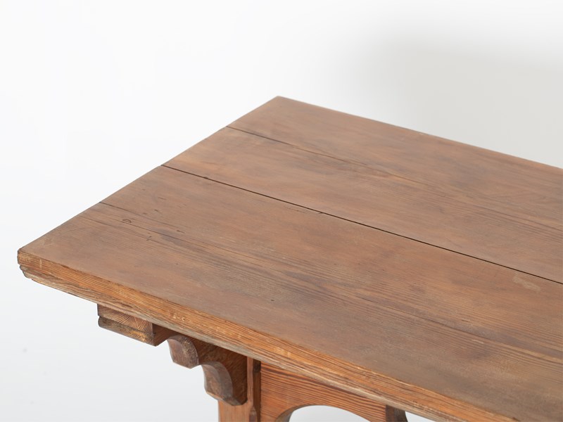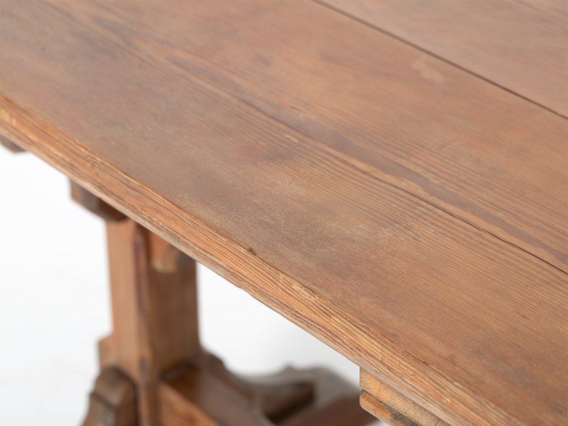 A gothic revival pitch pine altar table with two-plank top raised on a trestle form base. English, late 19C.