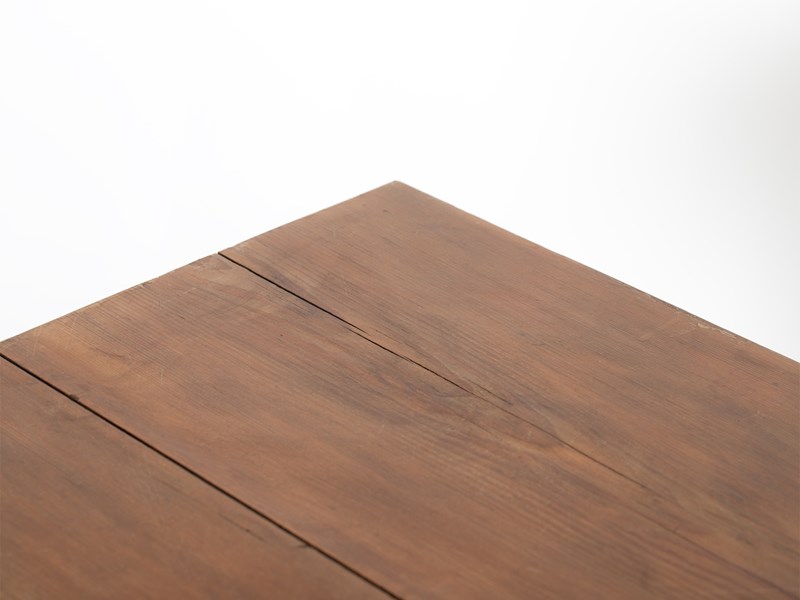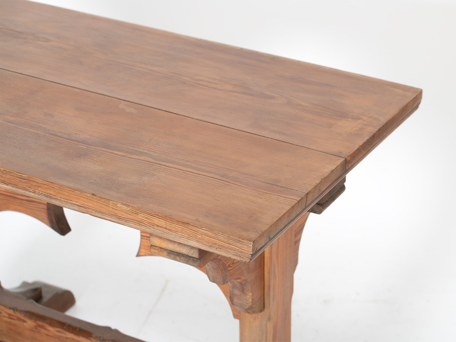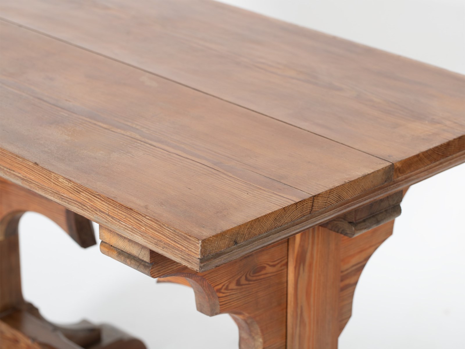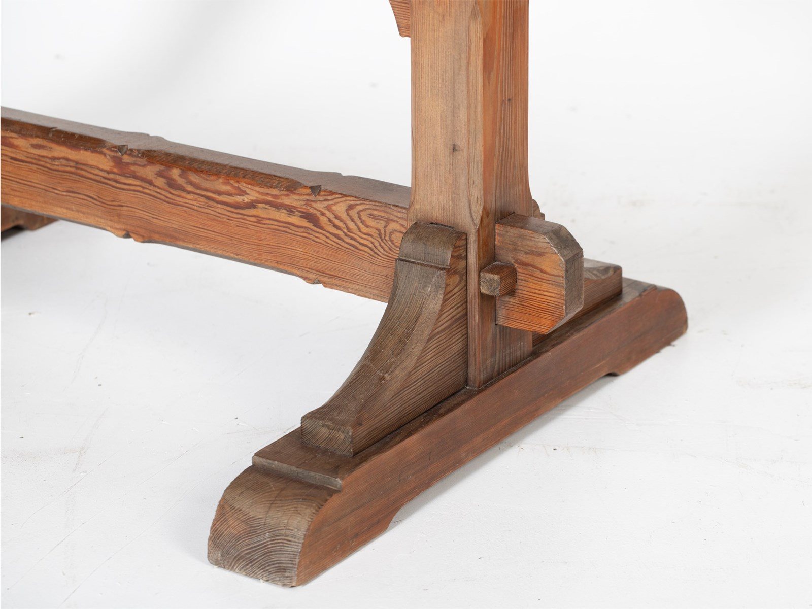 A gothic revival pitch pine altar table with two-plank top raised on a trestle form base. English, late 19C.
